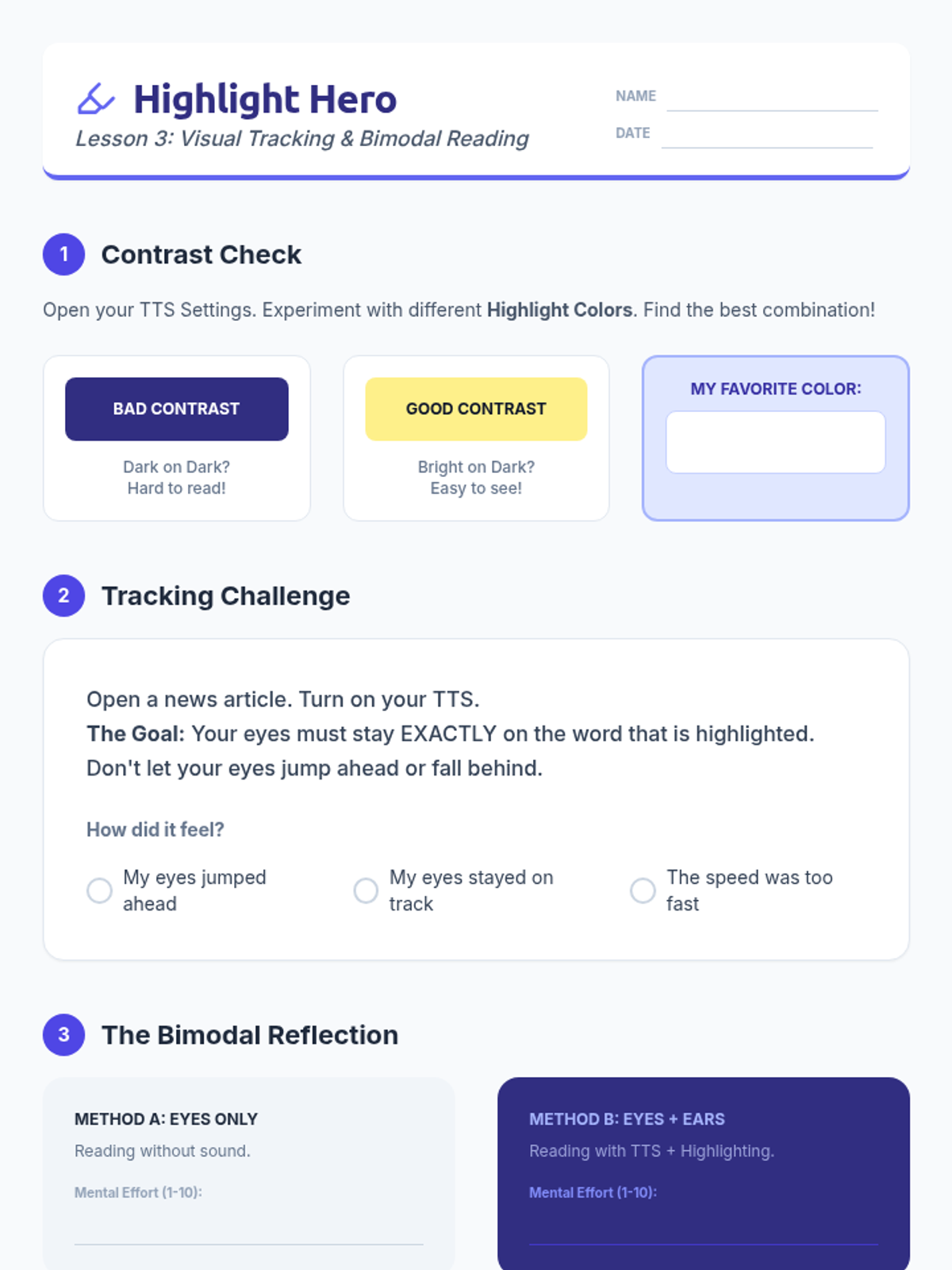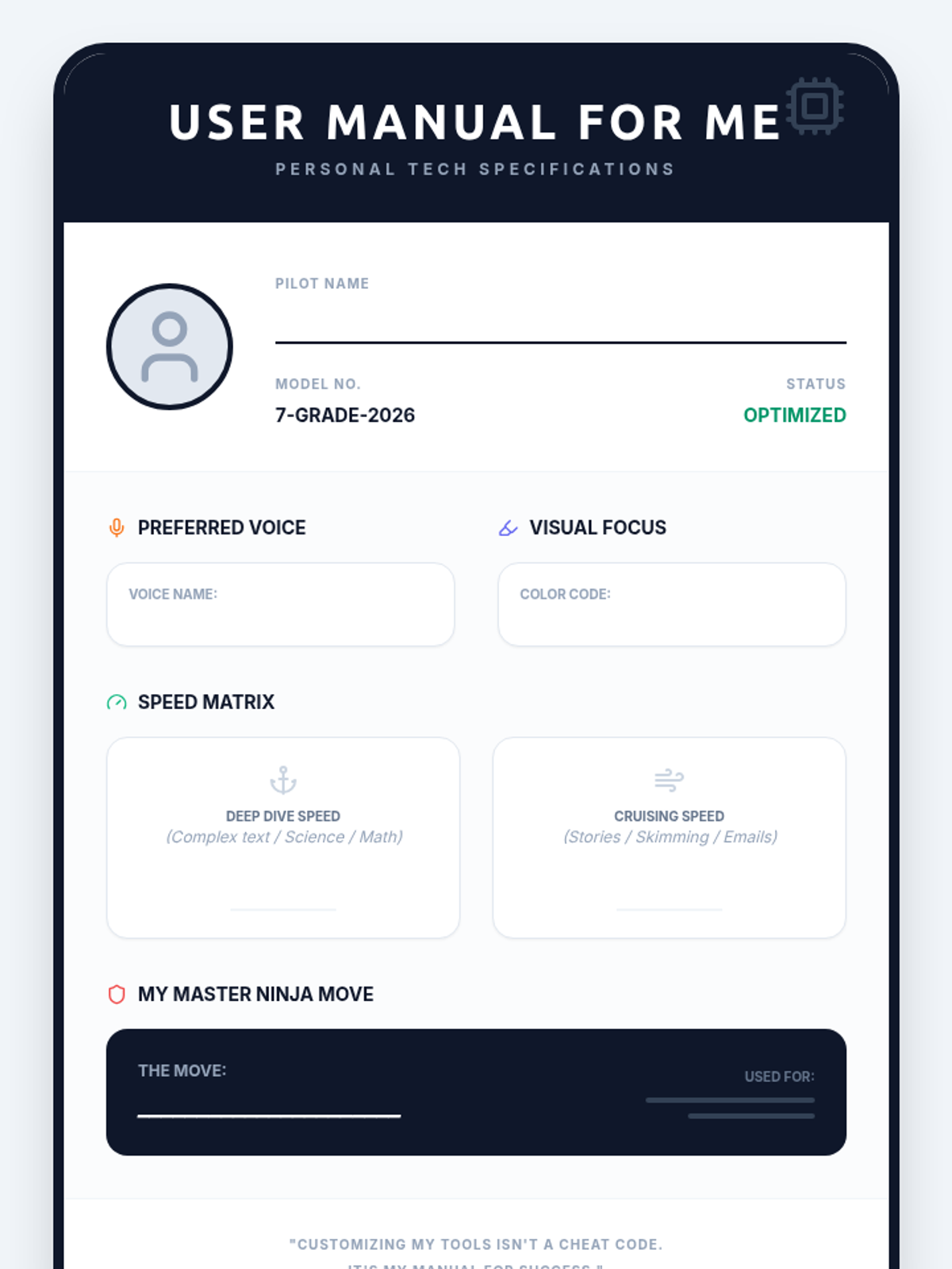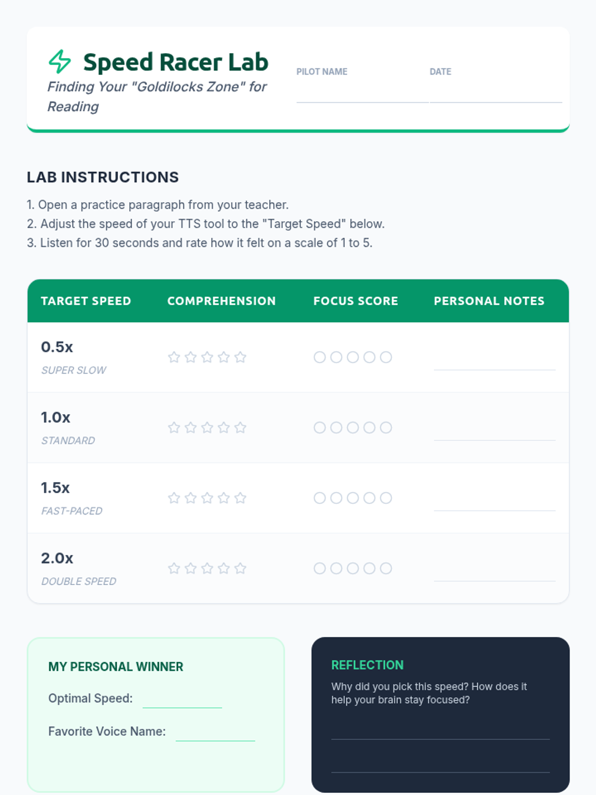 A comprehensive sequence for 7th-grade students to master text-to-speech (TTS) technology. Students progress from basic interface navigation to advanced customization and troubleshooting, ultimately creating a personalized settings profile for optimal learning.