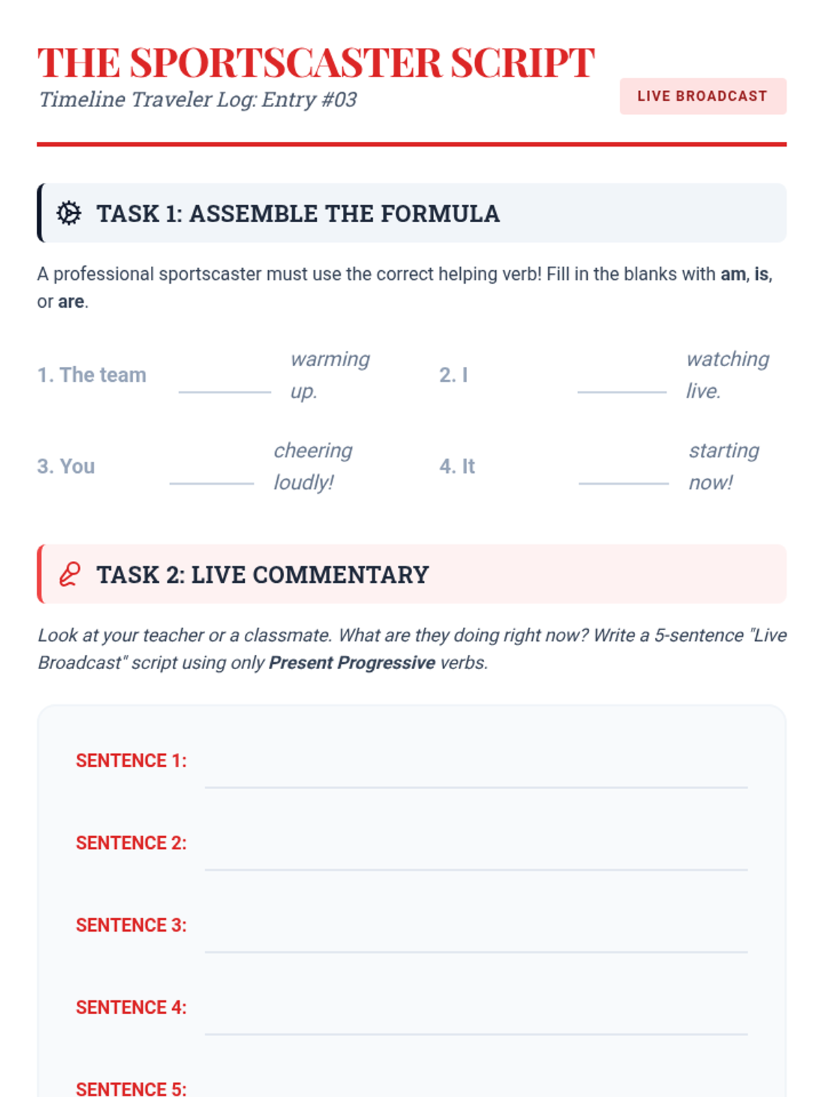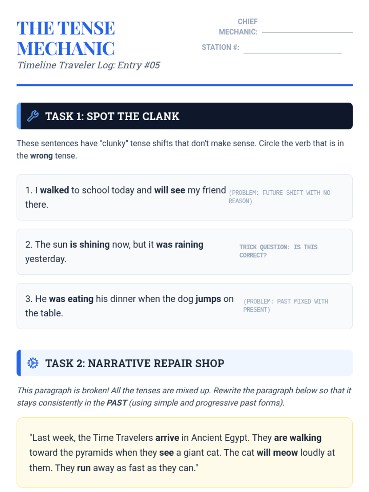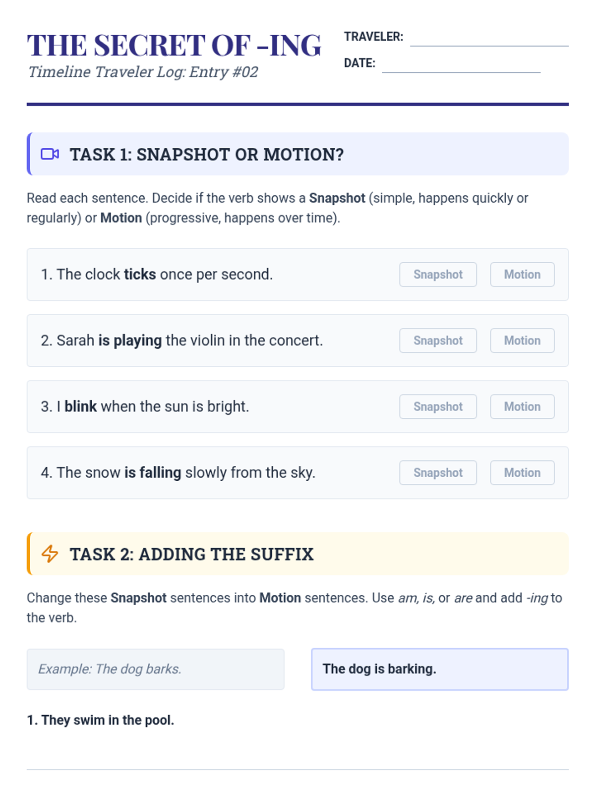 A comprehensive 4th Grade grammar sequence that explores simple and progressive verb tenses through the lens of a 'Timeline Traveler'. Students will master conjugating regular and irregular verbs across past, present, and future timelines, while understanding the nuances of ongoing actions.
