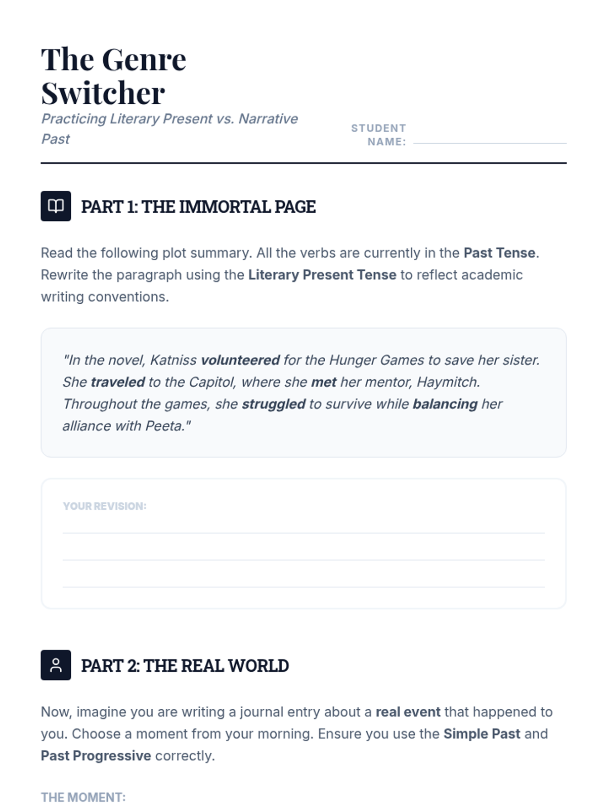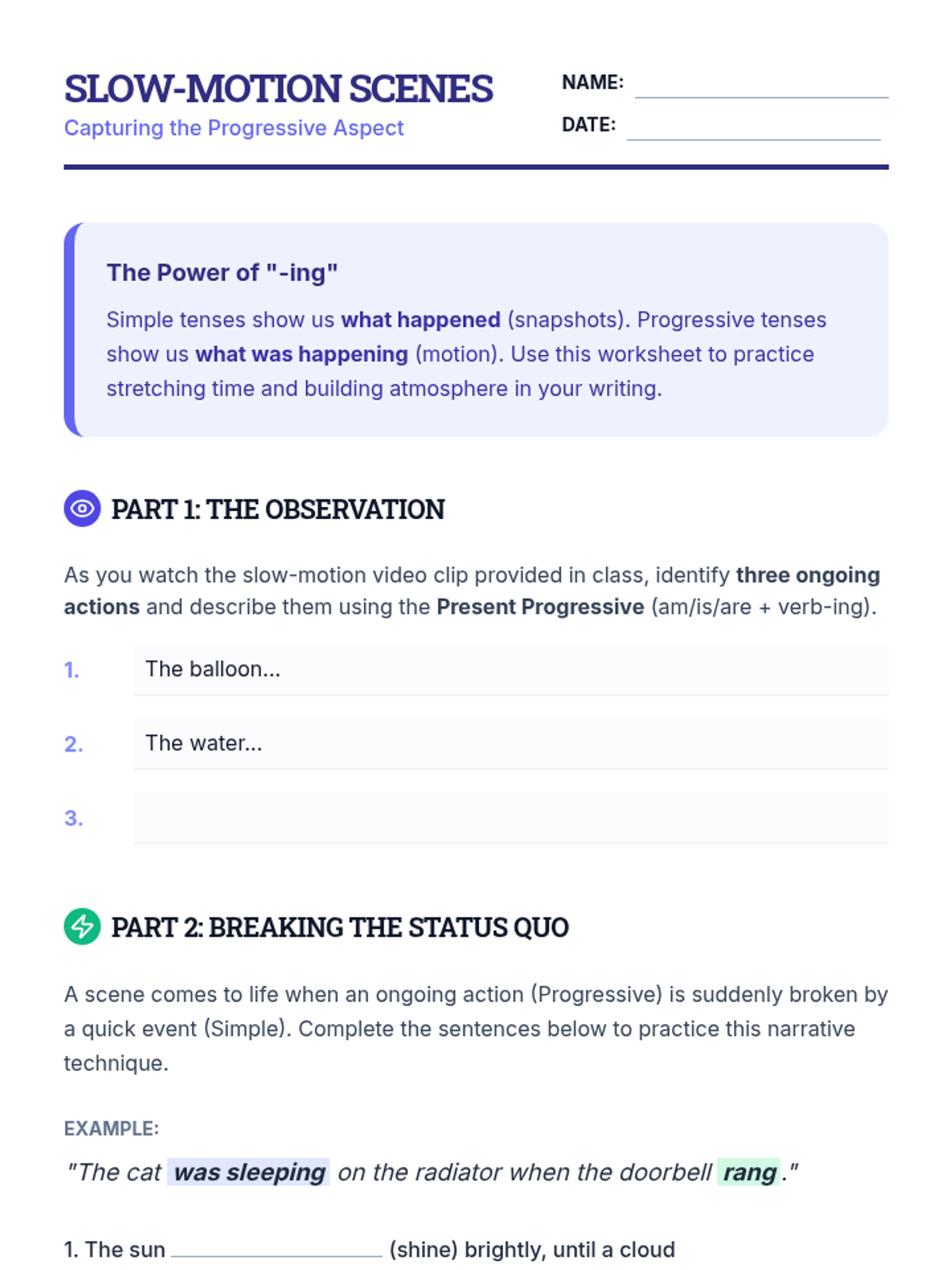 A comprehensive workshop-style sequence for 9th-grade students focusing on the mechanics and stylistic nuances of simple and progressive verb tenses to enhance narrative flow and consistency.