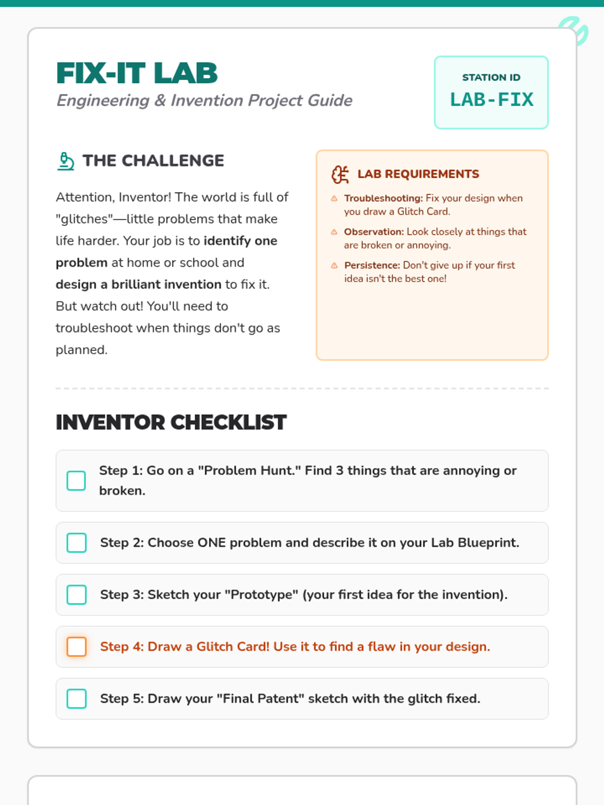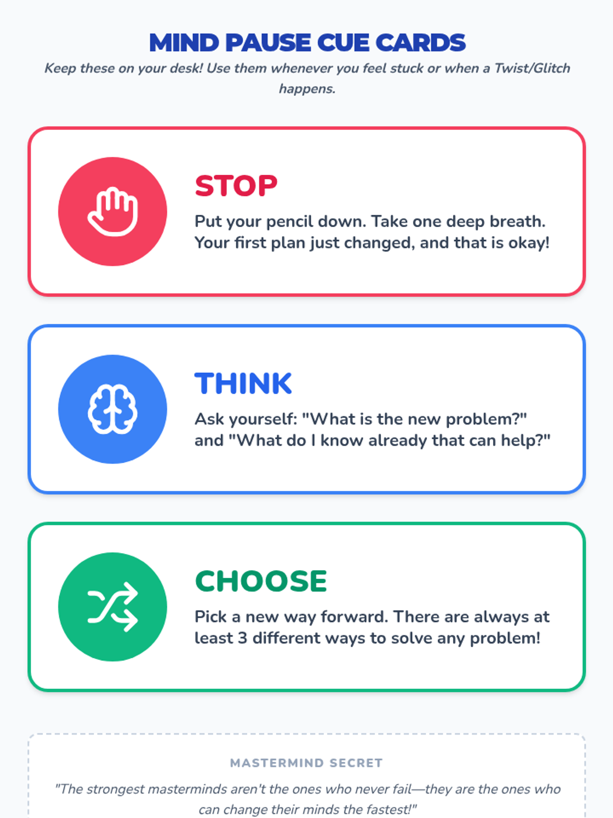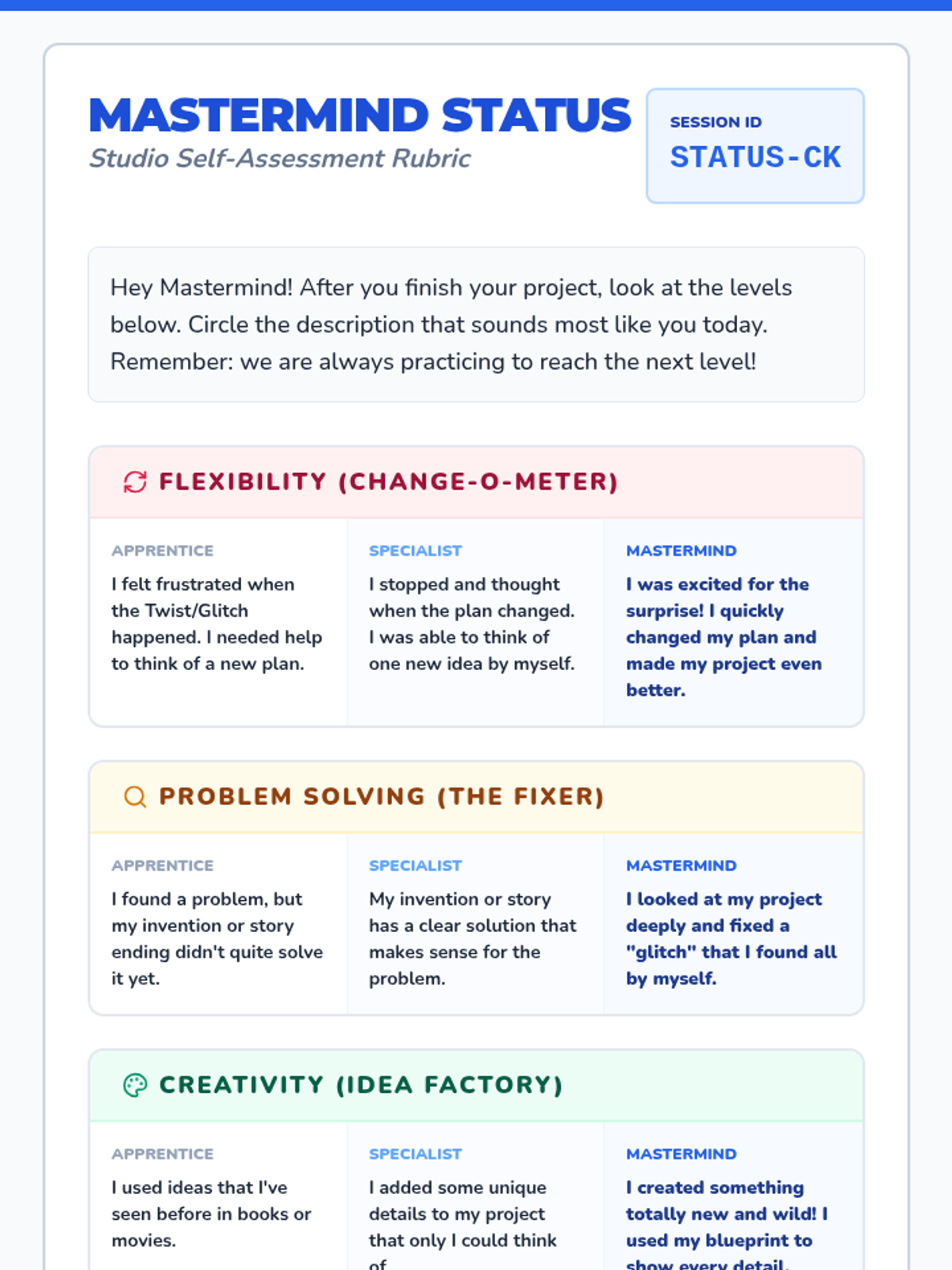 A series of independent, project-based learning activities designed for creative young learners to practice cognitive flexibility, critical thinking, and story engineering. Students act as 'Masterminds' to build stories and solve real-world problems through structured brainstorming and reflection.