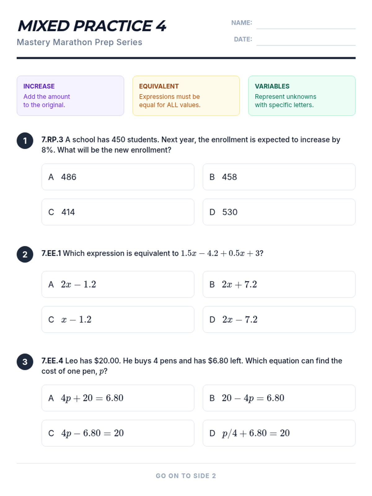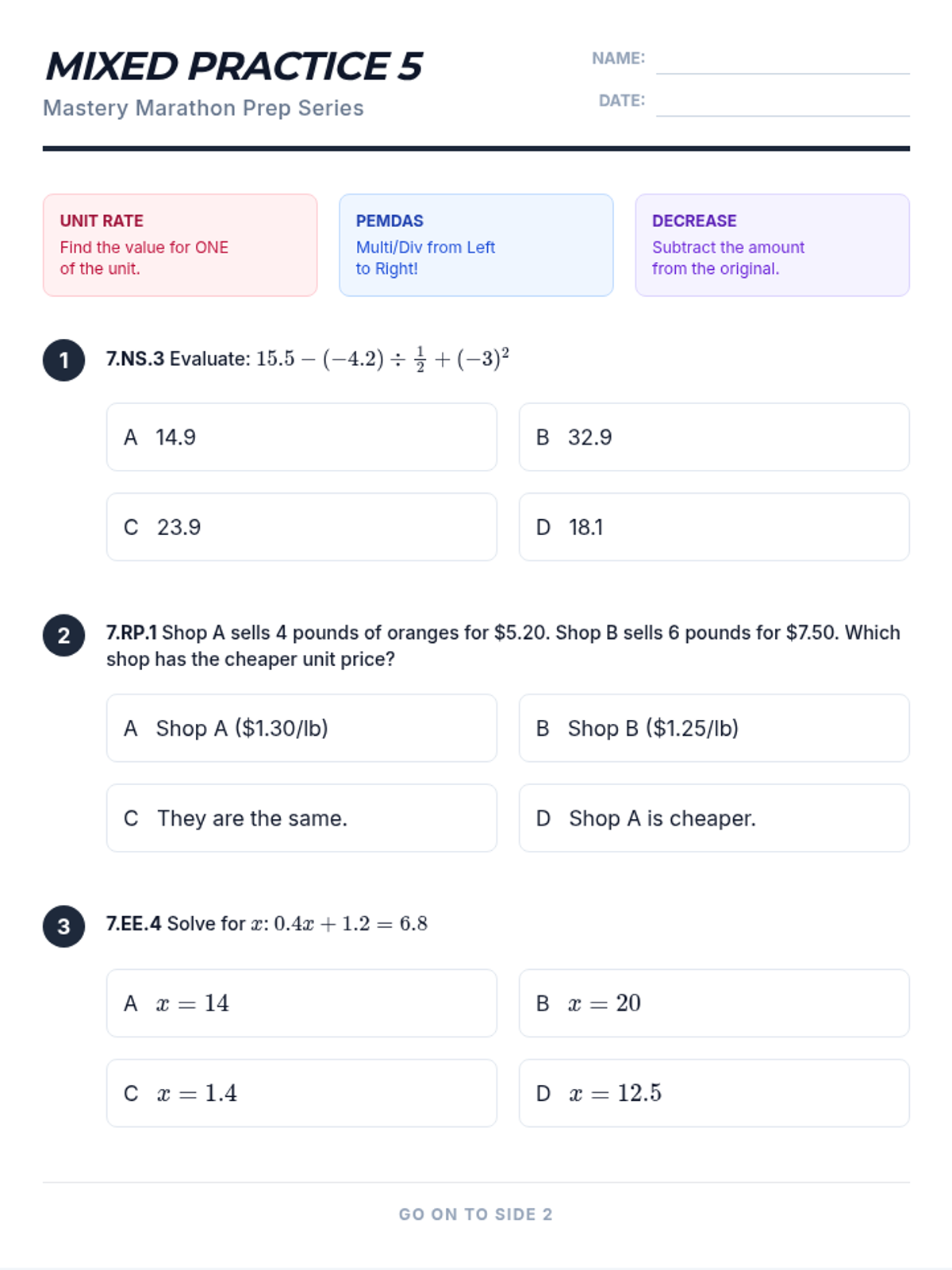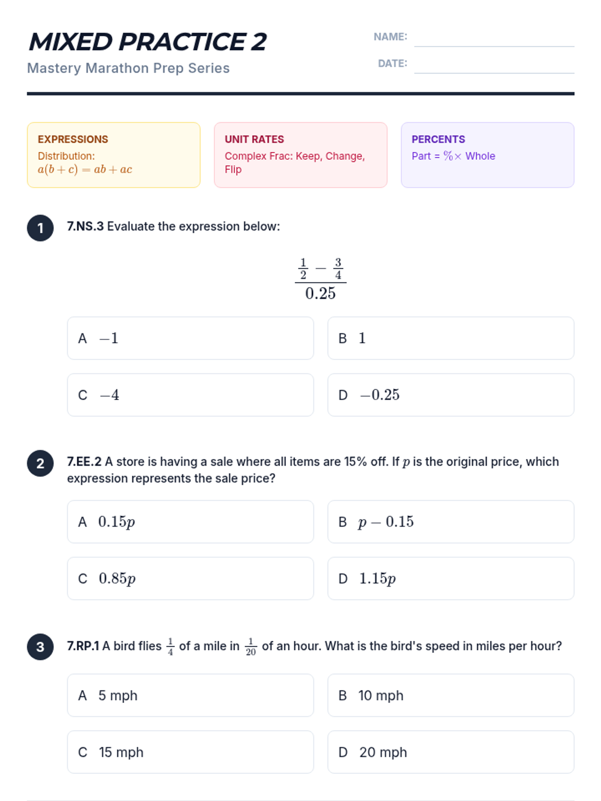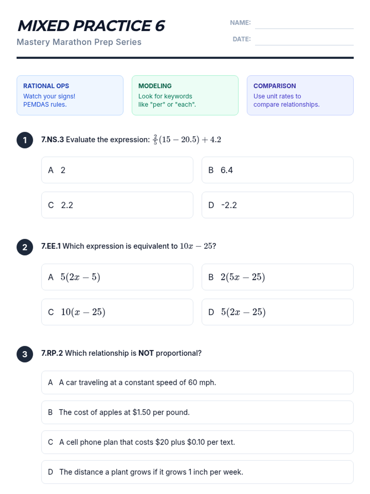 A comprehensive 6-part homework series designed to prepare 7th-grade students for their math interim assessments. Each sheet covers specific standards from Expressions and Equations, Ratios and Proportional Relationships, and Rational Number operations, mirroring the format and rigor of the assessment.