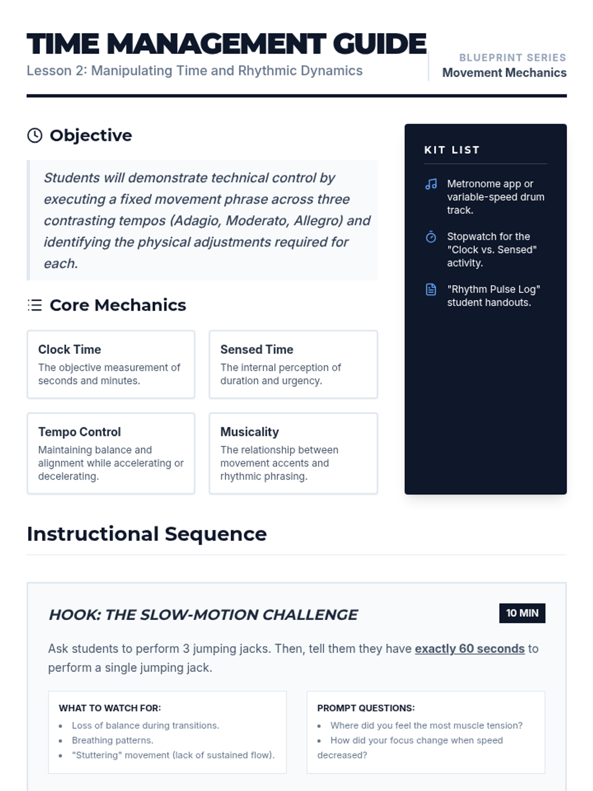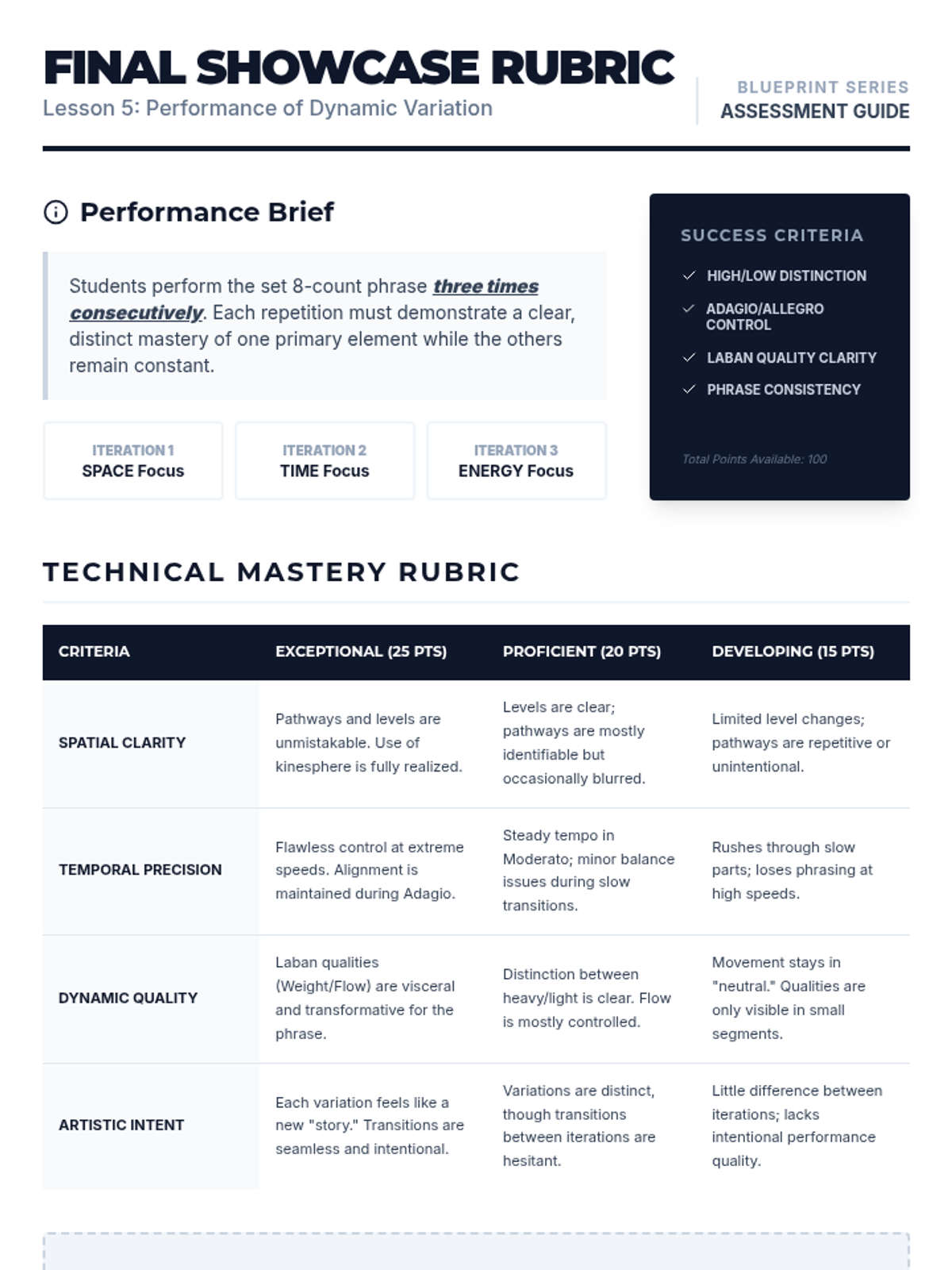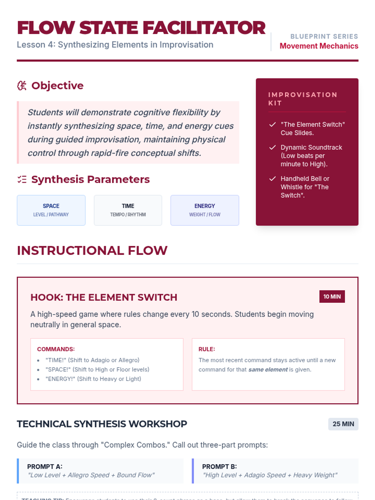 This high school dance sequence deconstructs movement into its core elements of space, time, and energy. Students transition from technical analysis of pathways and levels to the expressive manipulation of dynamics, culminating in a performance that demonstrates intentional artistic variation.