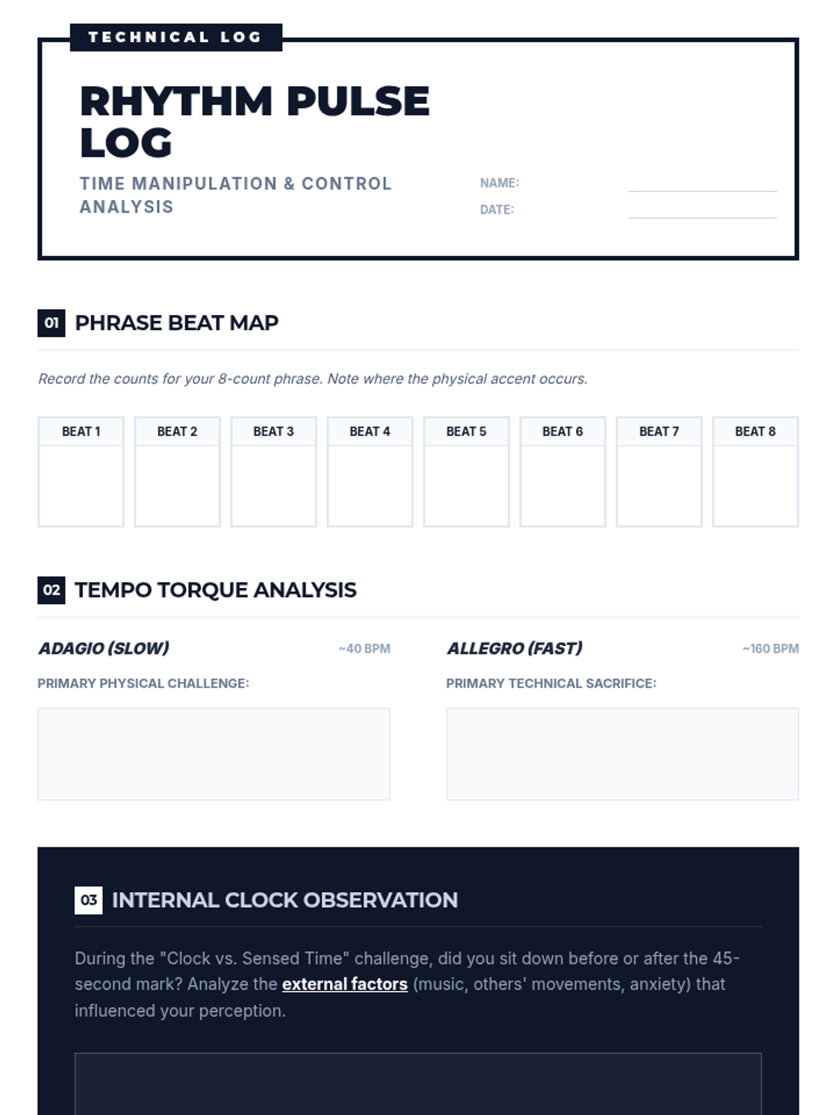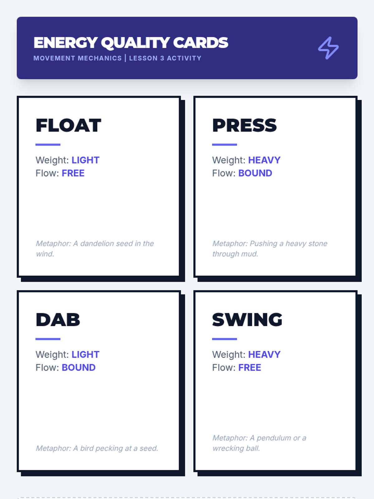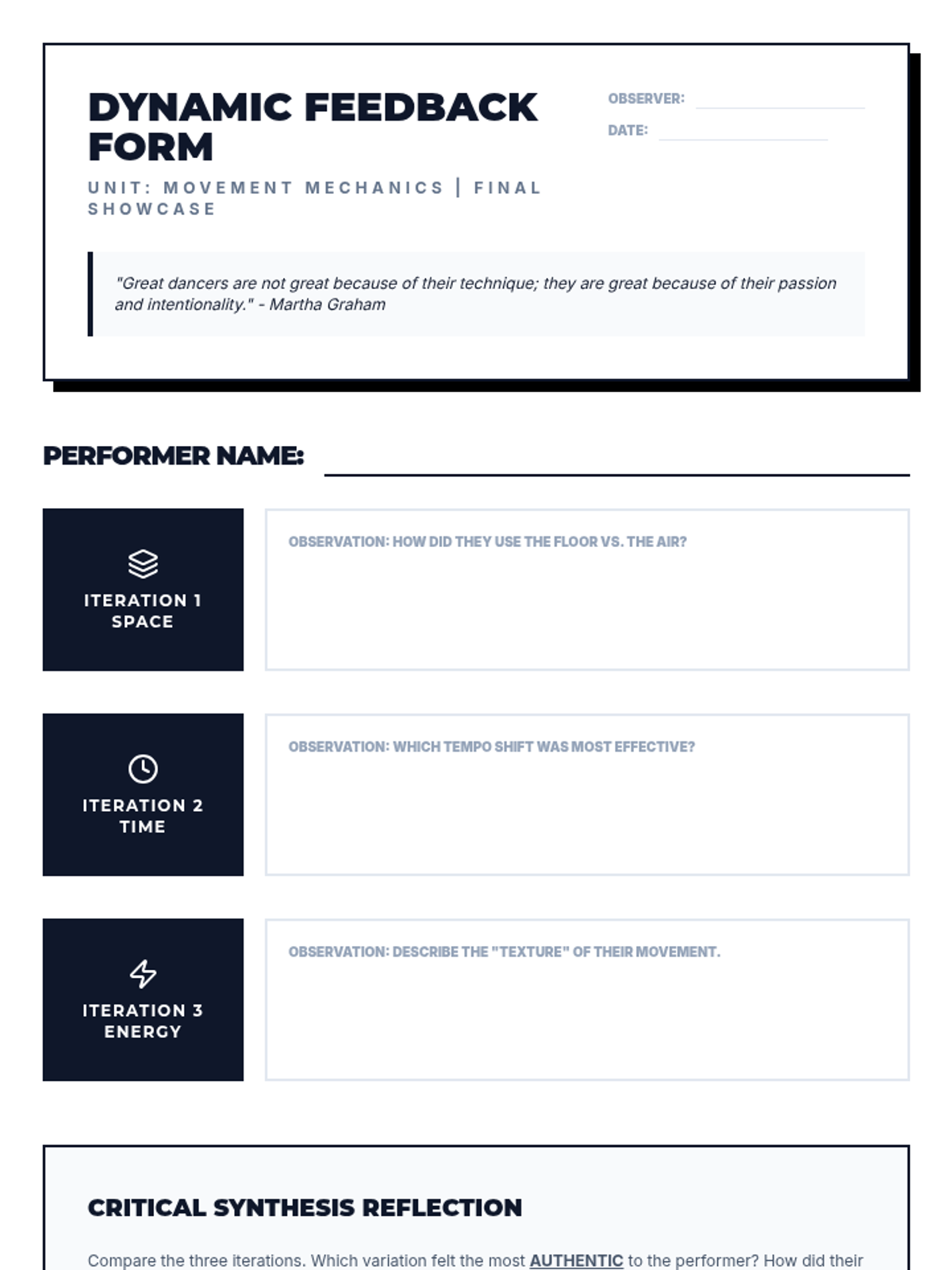 This high school dance sequence deconstructs movement into its core elements of space, time, and energy. Students transition from technical analysis of pathways and levels to the expressive manipulation of dynamics, culminating in a performance that demonstrates intentional artistic variation.