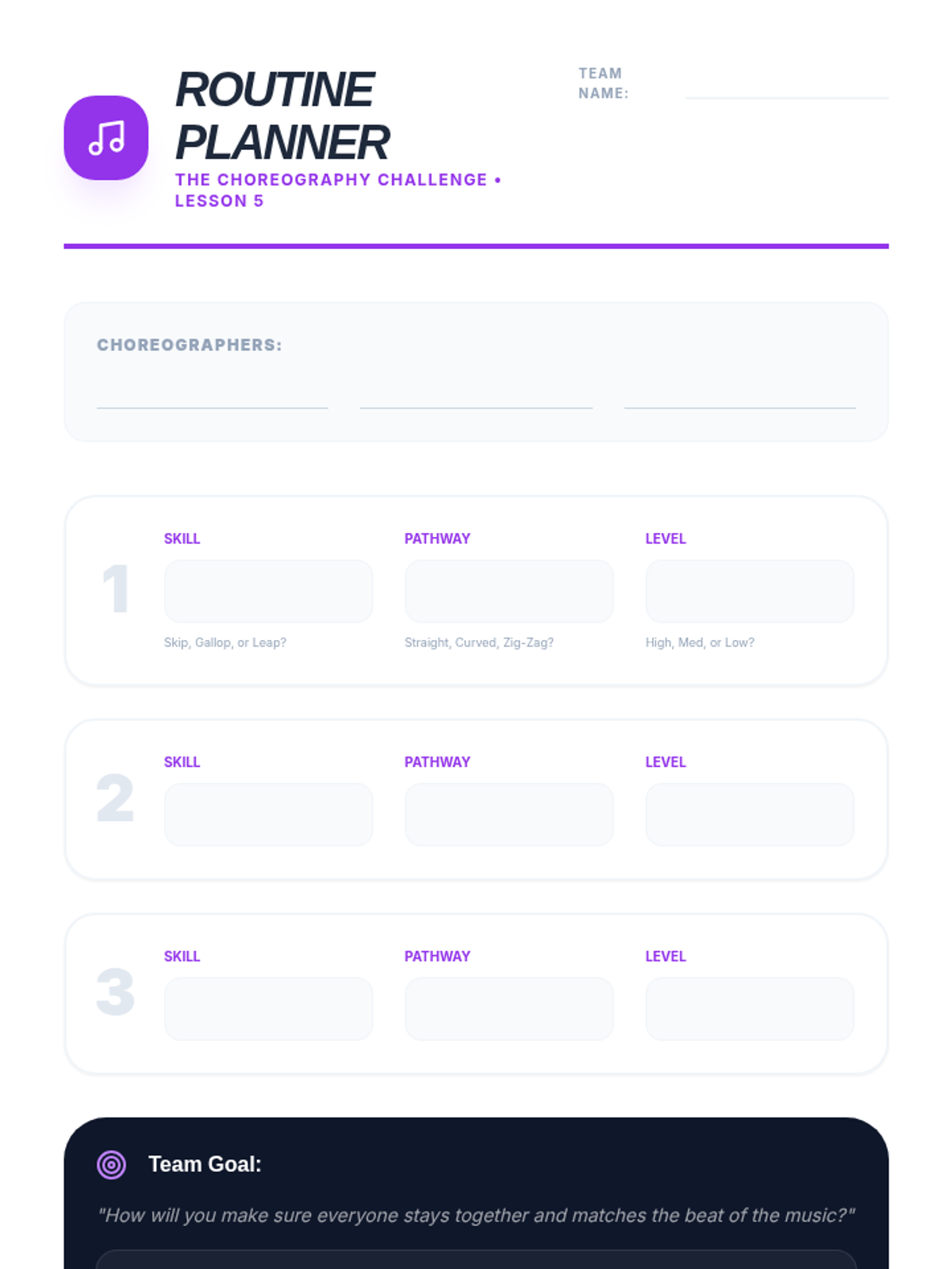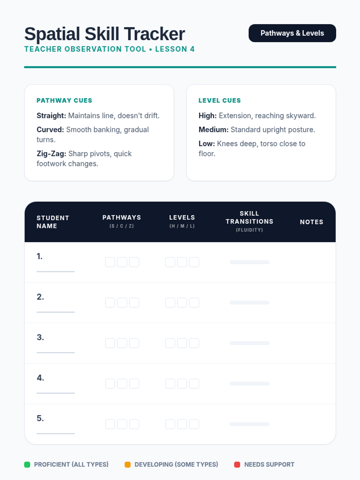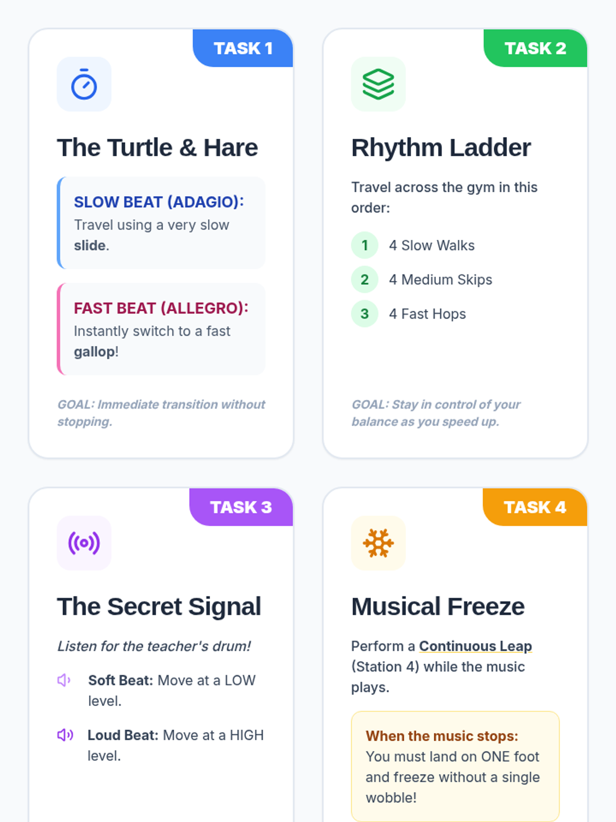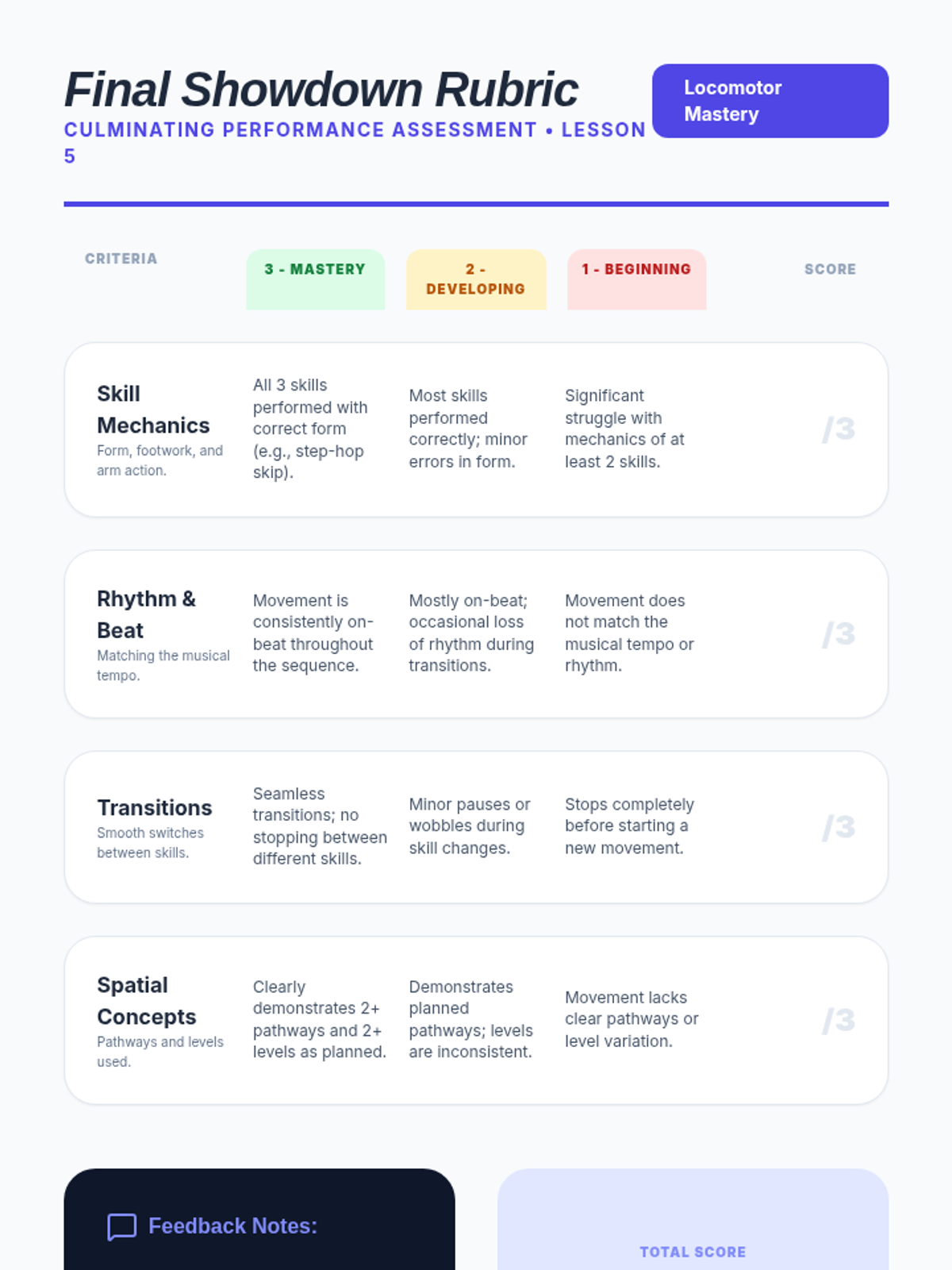 A 5-lesson sequence for 3rd-grade students focusing on refining locomotor skills (skipping, galloping, leaping) through the lens of rhythm, force, and spatial awareness. Students progress from individual skill mechanics to complex, choreographed sequences performed to music.