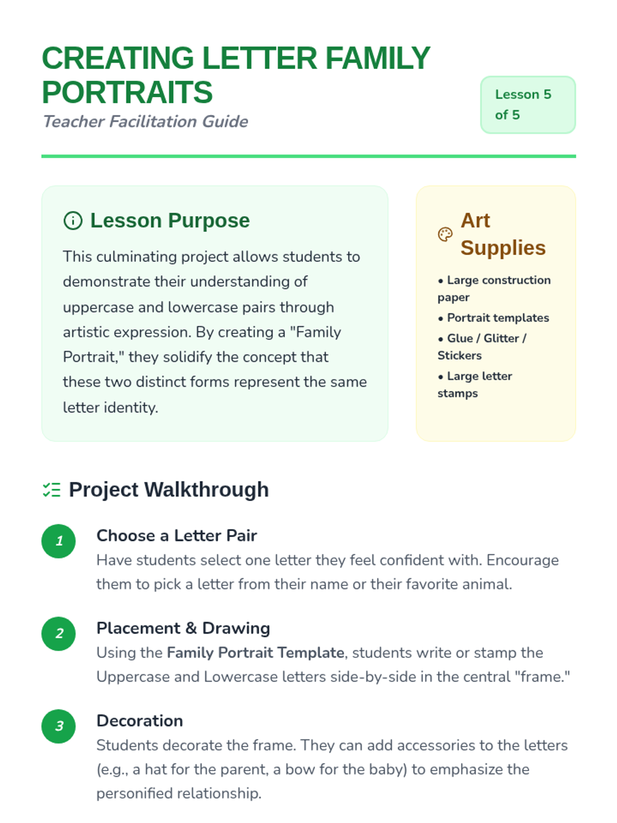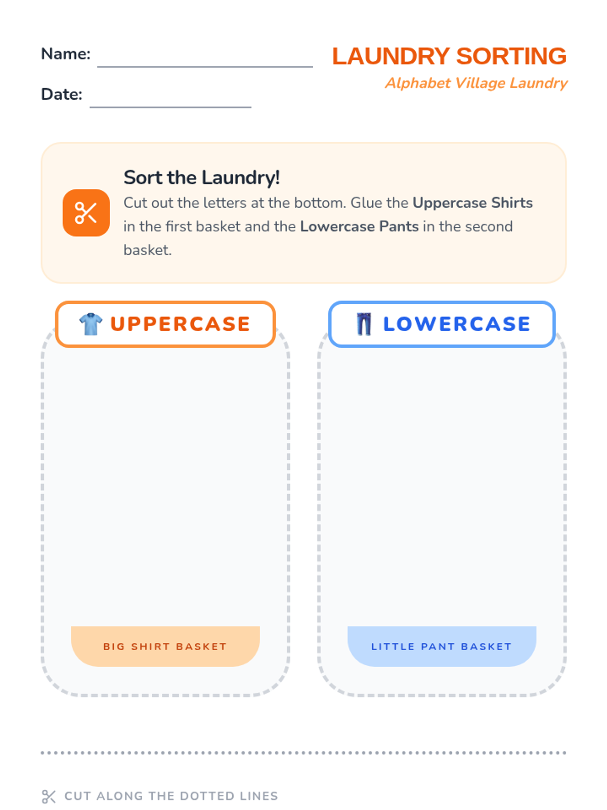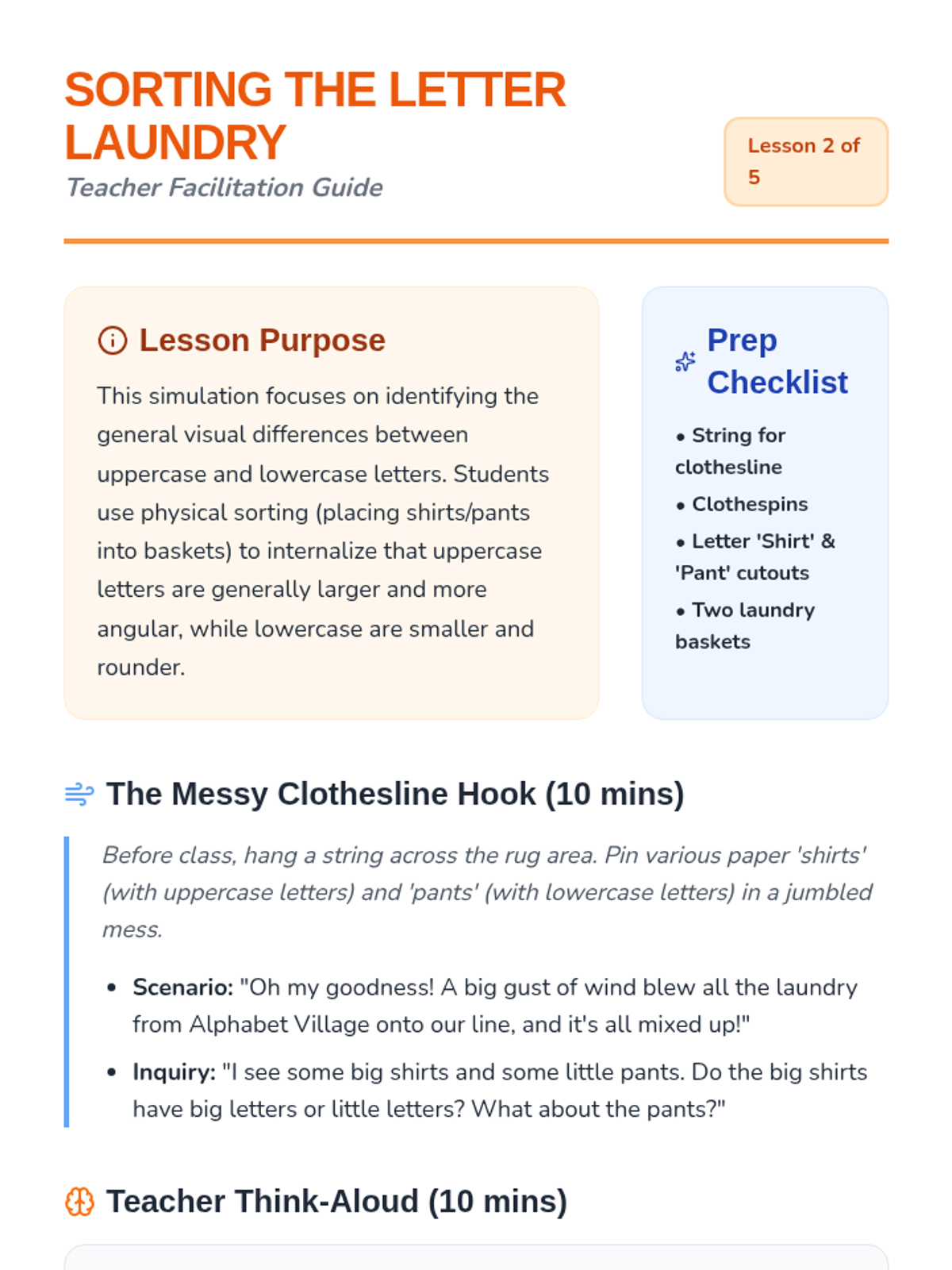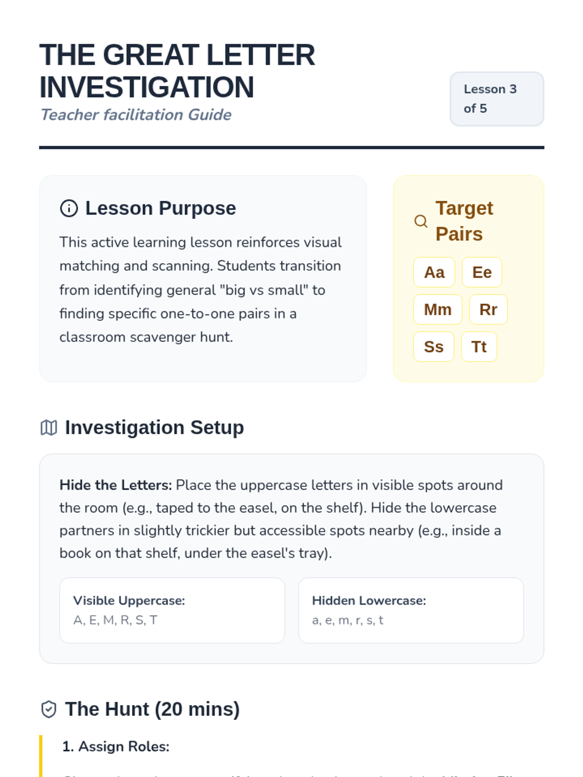 A Pre-K phonics sequence that introduces uppercase and lowercase letter pairs through playful, hands-on activities. Students progress from general big/small concepts to specific letter matching using laundry sorting, scavenger hunts, and art projects.