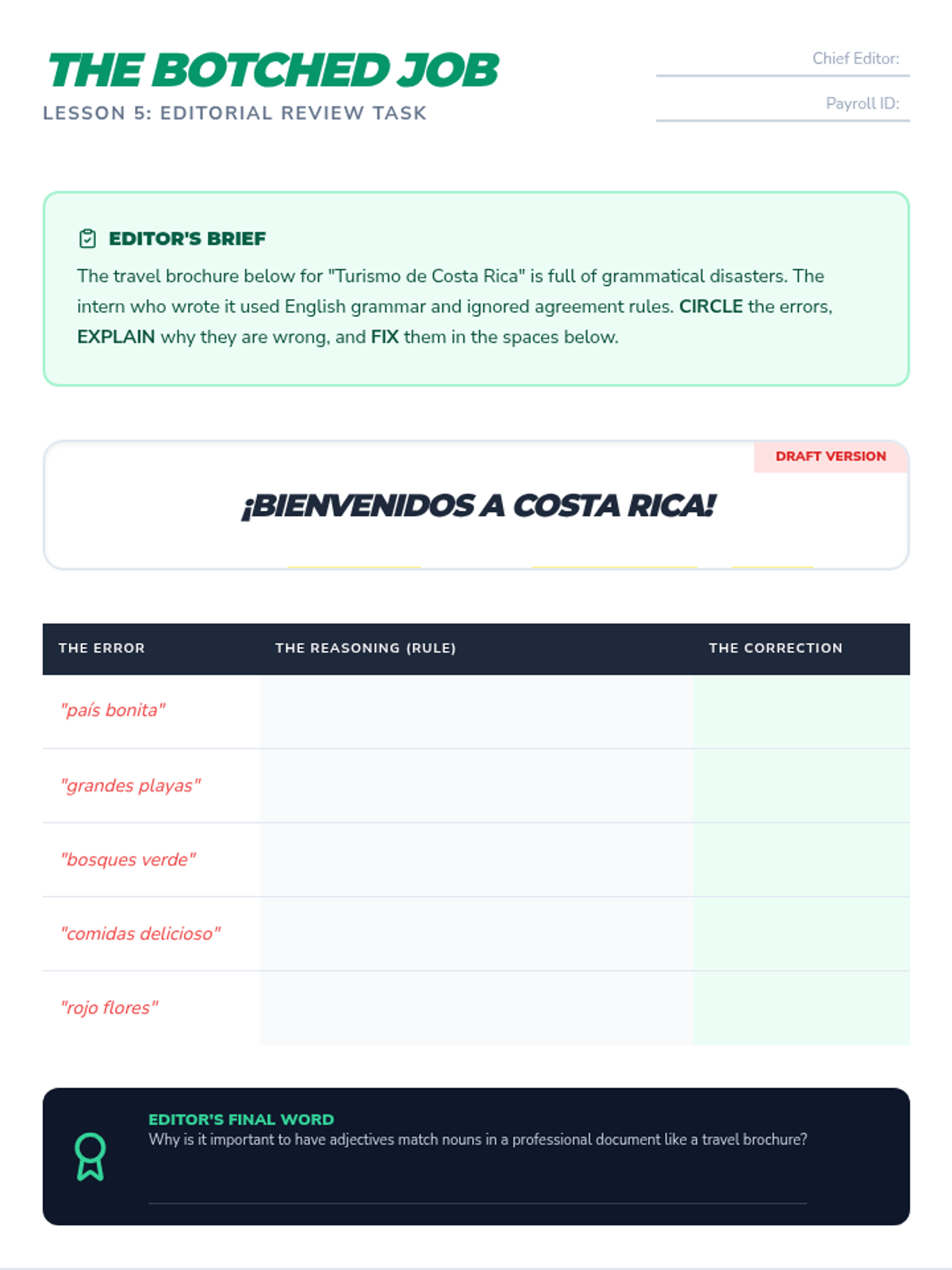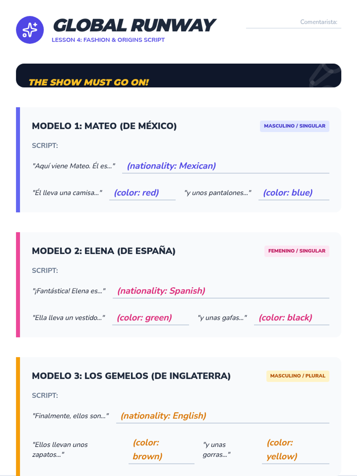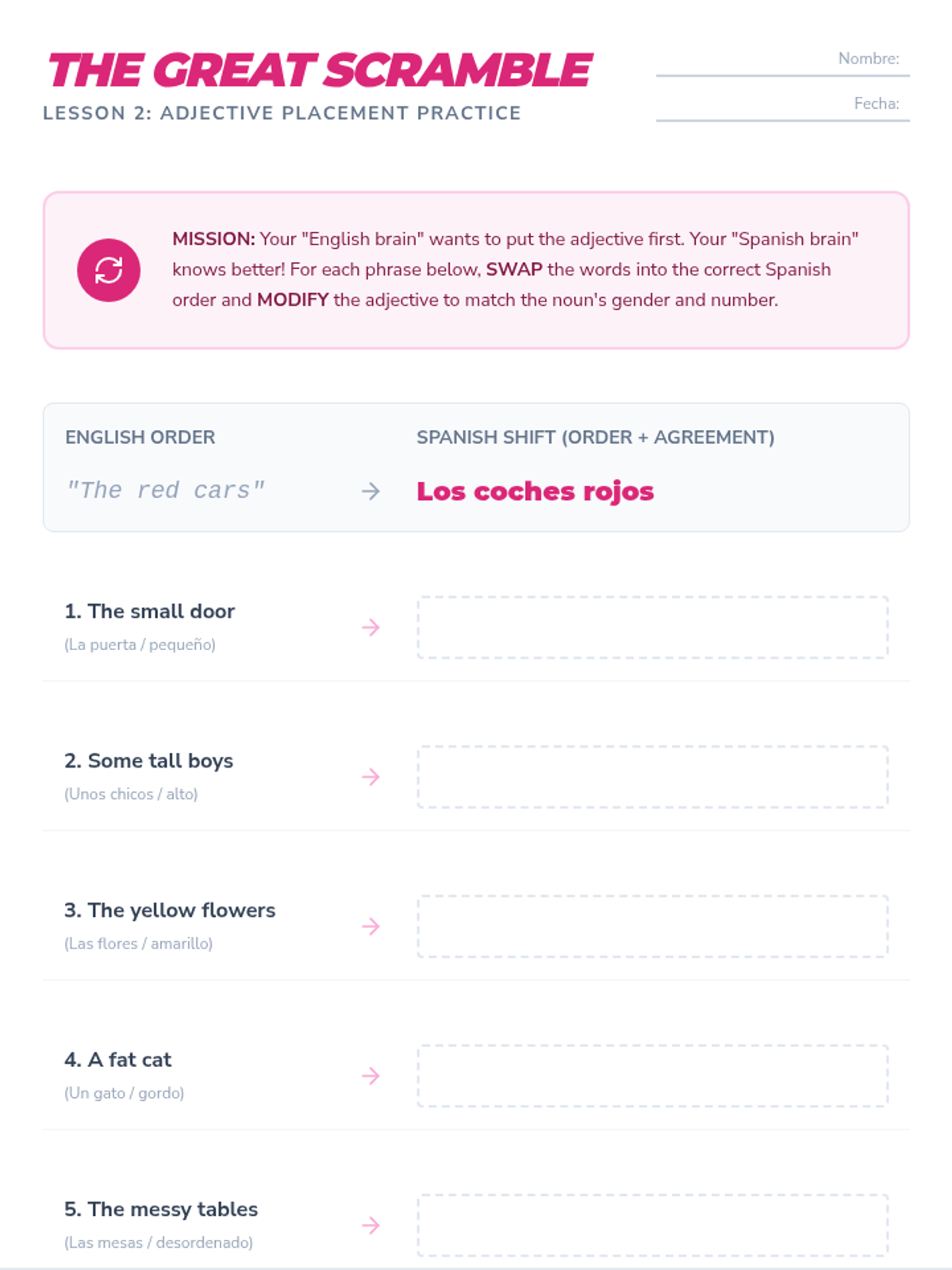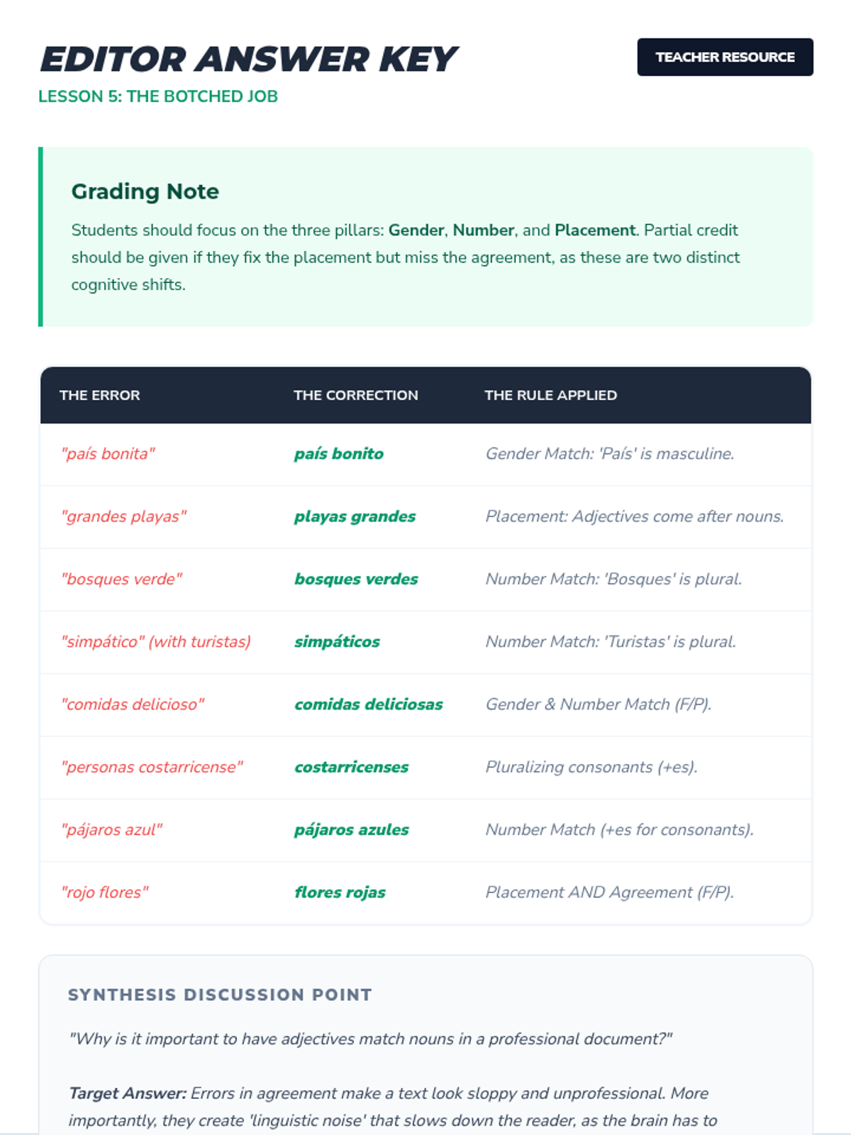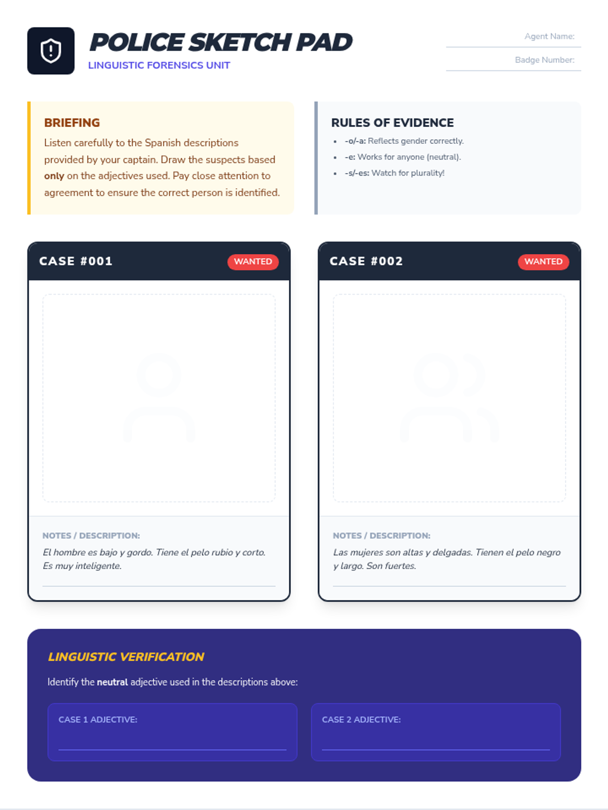 This sequence explores the mechanics of noun-adjective agreement in Spanish, focusing on gender, number, and placement rules. Students progress from inquiry-based discovery to practical application in describing people and correcting errors.