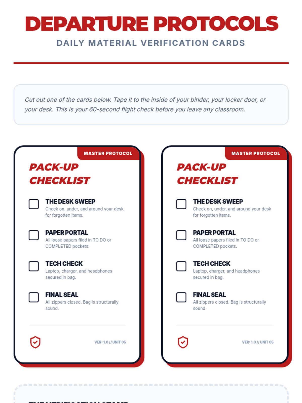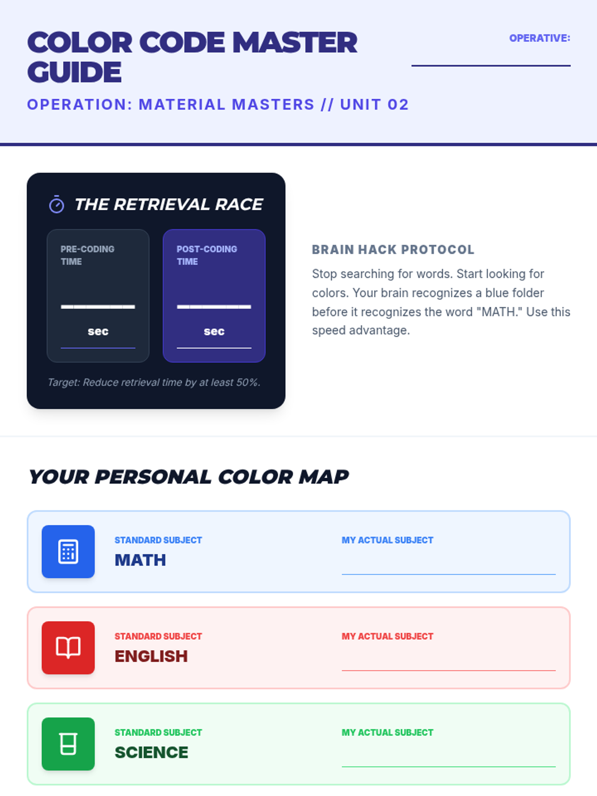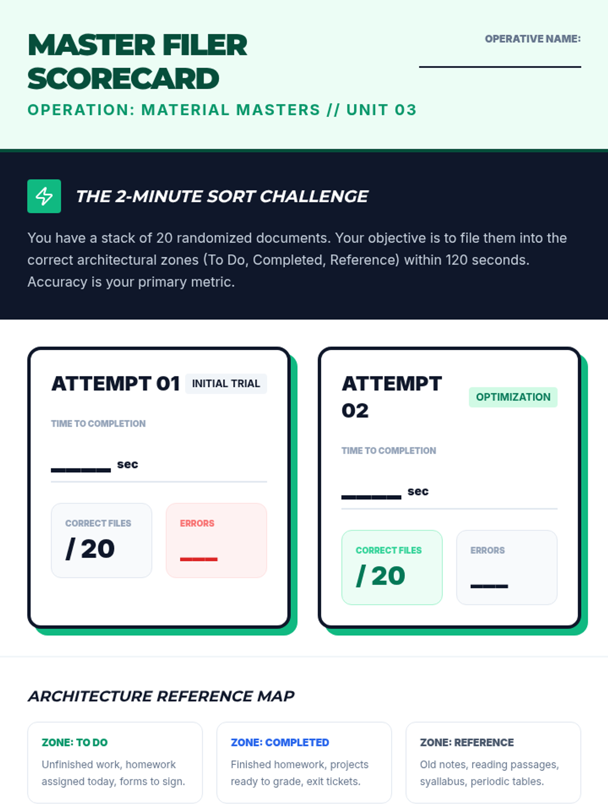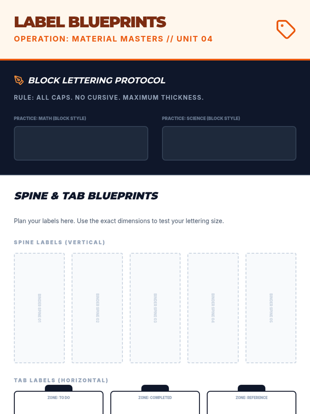 This sequence focuses on the fundamental skills of organizing personal academic materials, specifically backpacks and binder systems. Students begin by auditing their current organizational state, identifying pain points, and move through color-coding, binder architecture, labeling, and establishing daily routines.