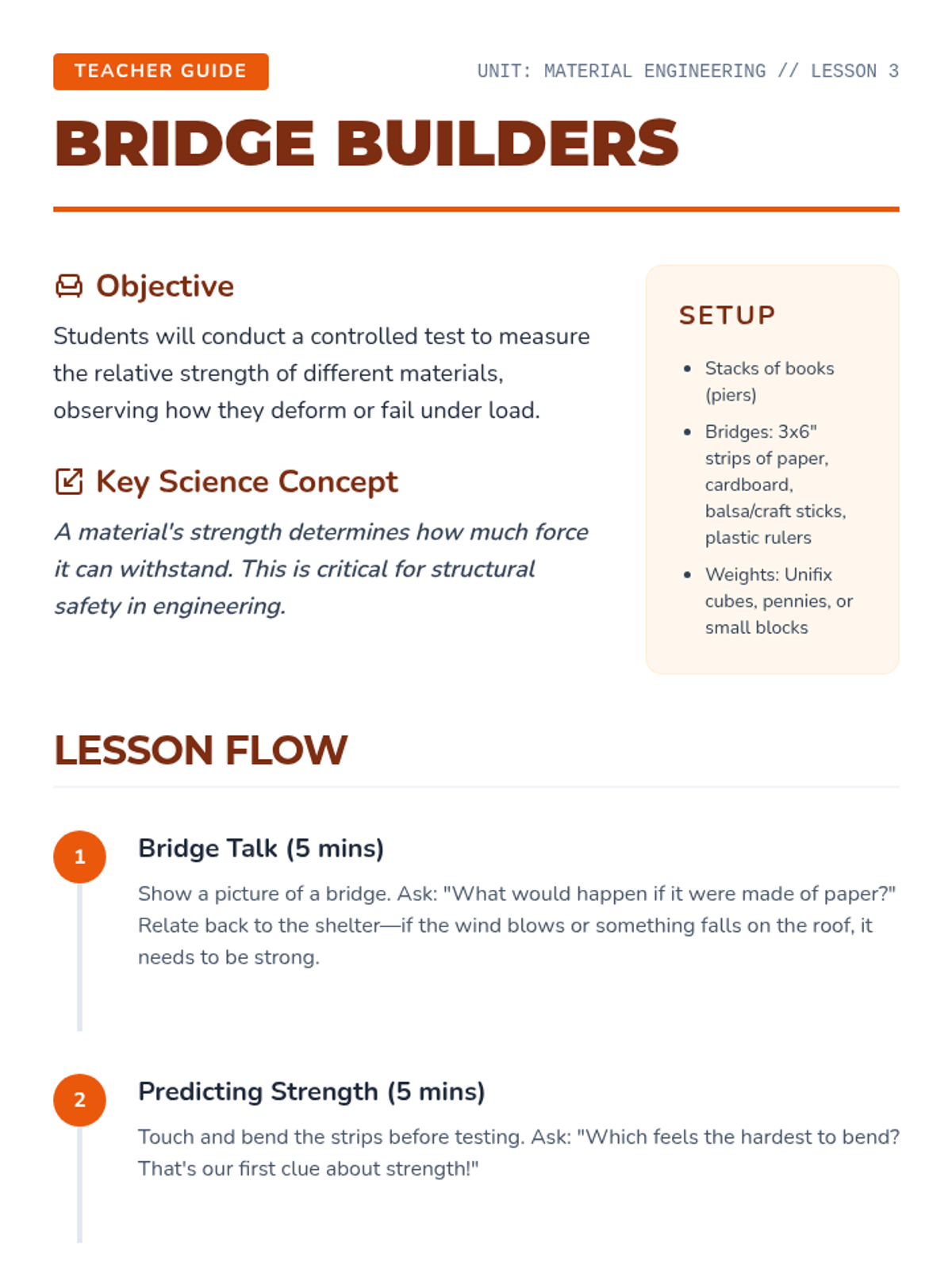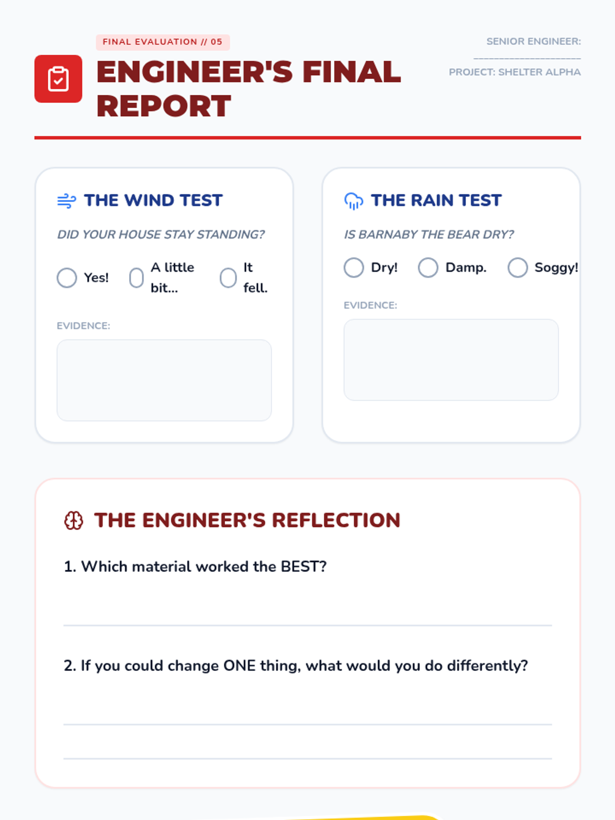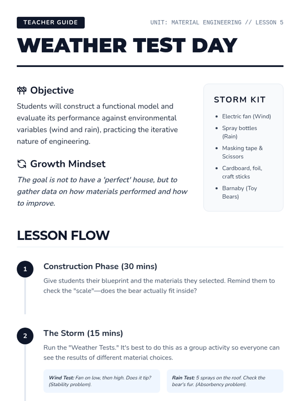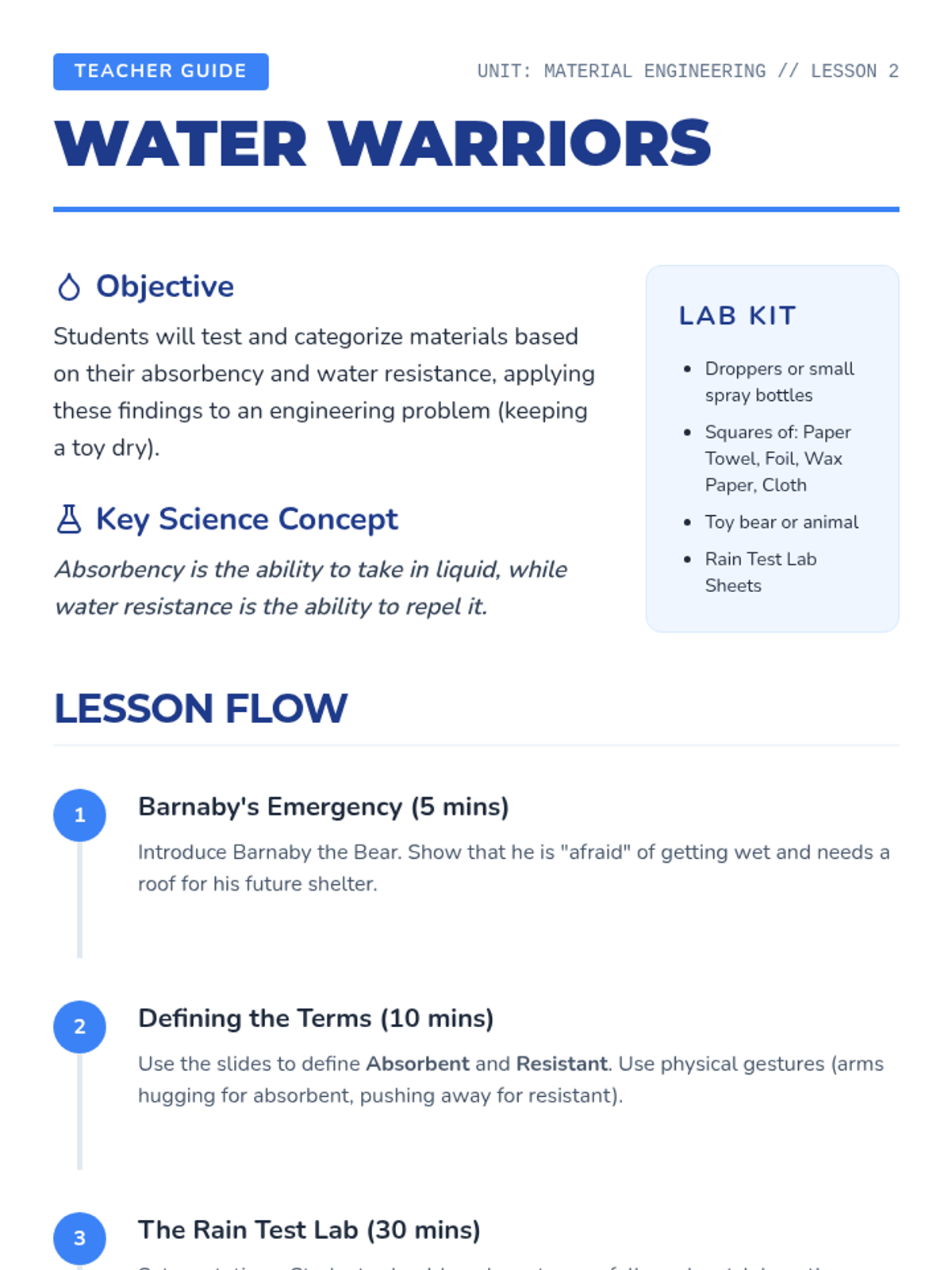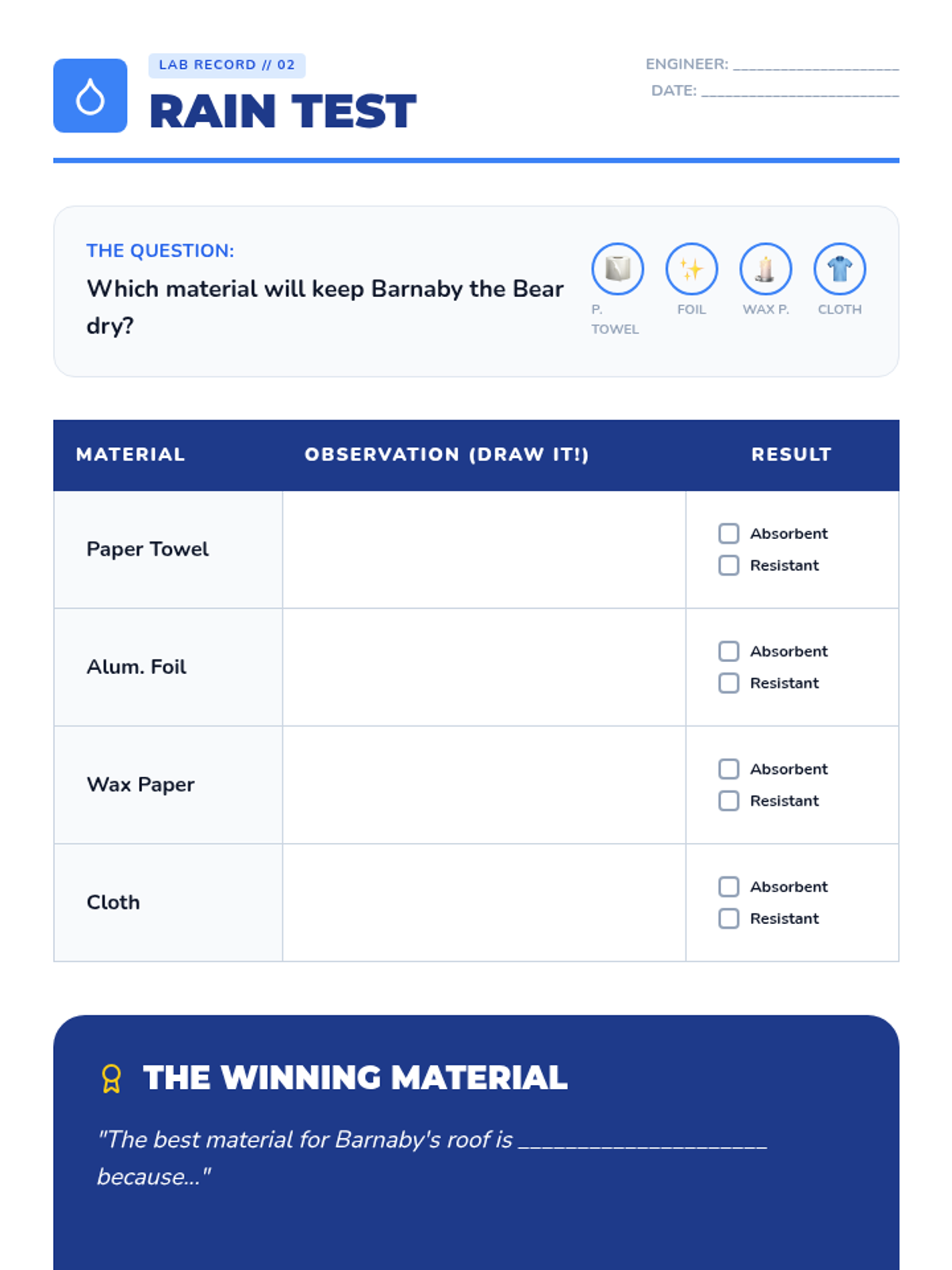 Students adopt the role of junior engineers to evaluate materials for specific purposes. They analyze everyday objects, test for water resistance and strength, and finally design and build a protective shelter for a toy animal.