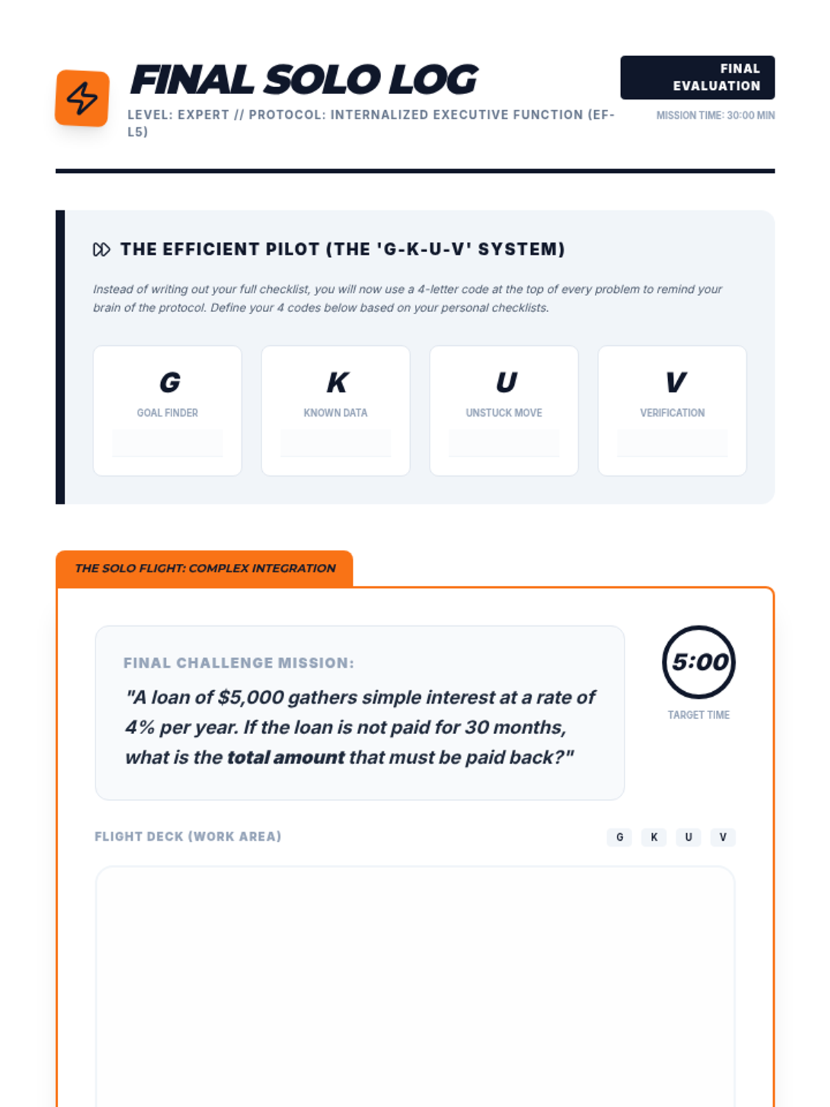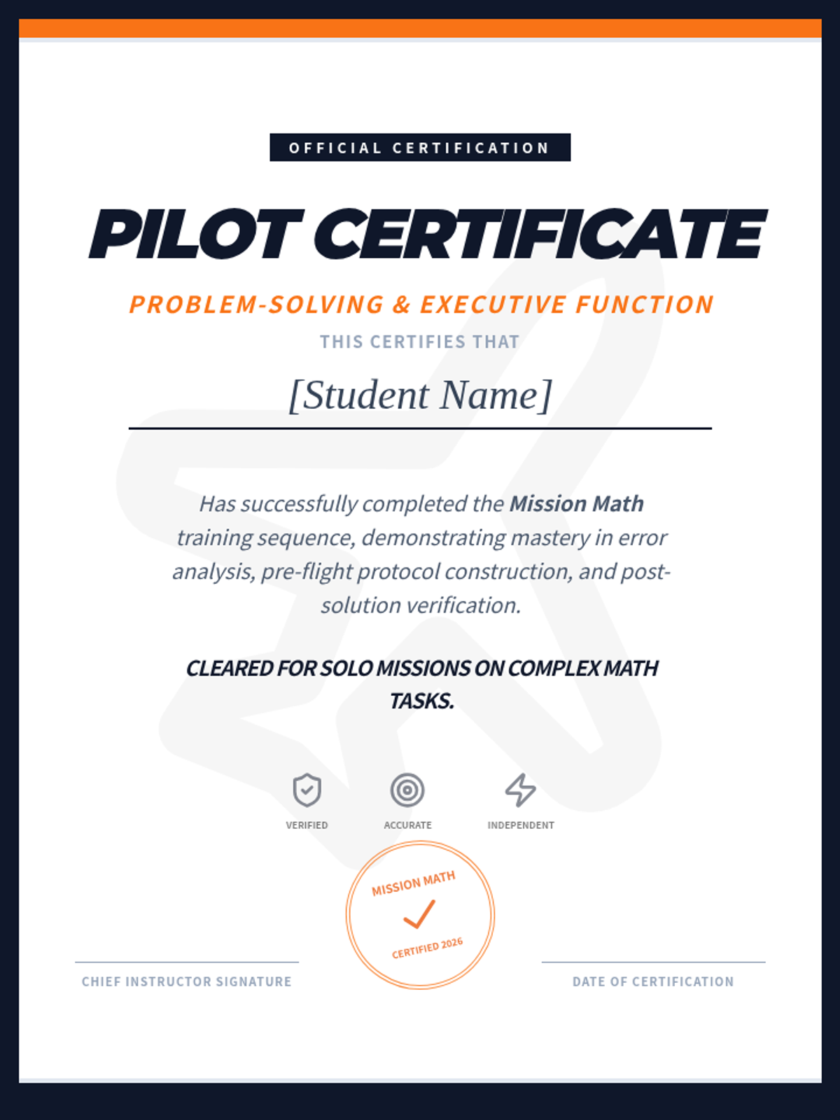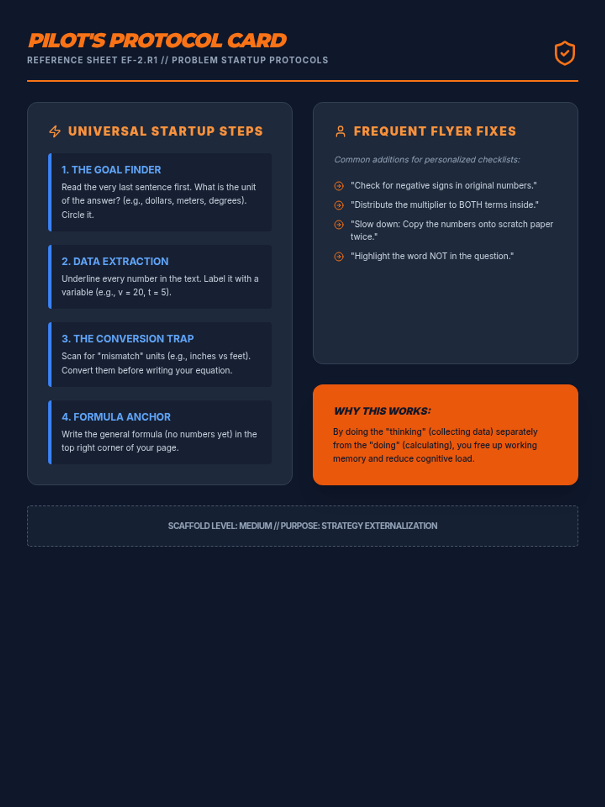 A specialized 12th-grade sequence focused on building executive function skills through math problem-solving. Students move from identifying personal error patterns to creating and internalizing 'Pre-Flight' and 'Landing' checklists to improve accuracy and independence in complex math tasks.