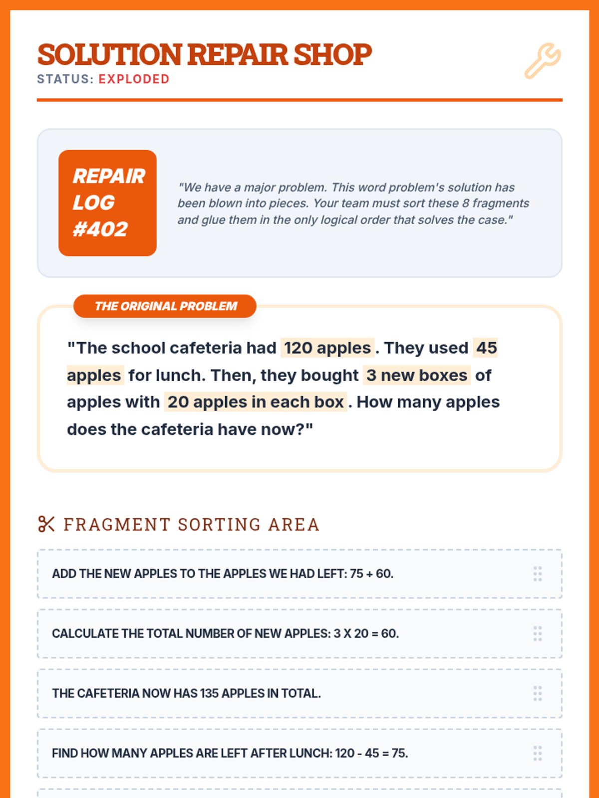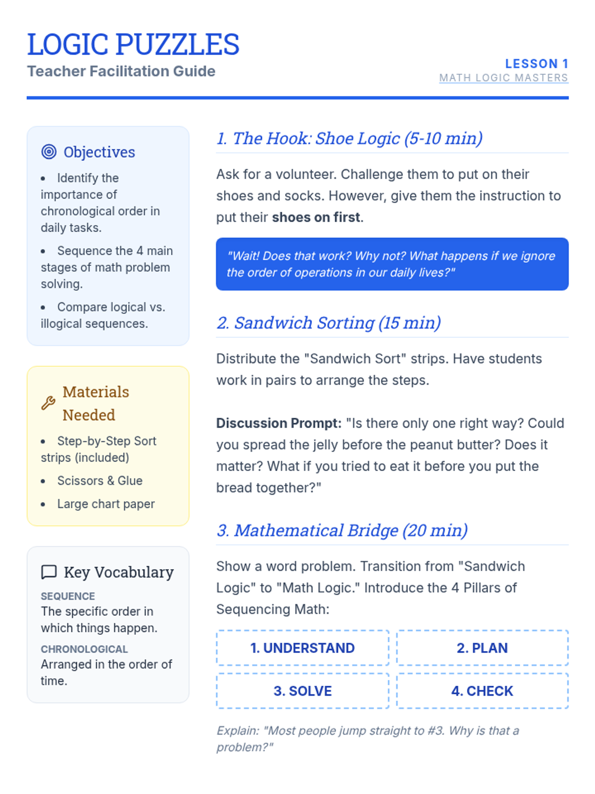 A specialized sequence for 4th-grade students to master complex math word problems by focusing on logical sequencing and verbalization before calculation. This unit targets executive functioning skills through games, role-play, and collaborative sorting activities.