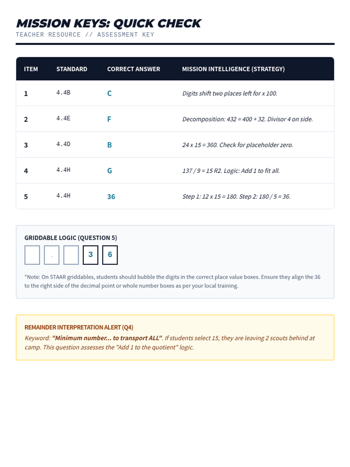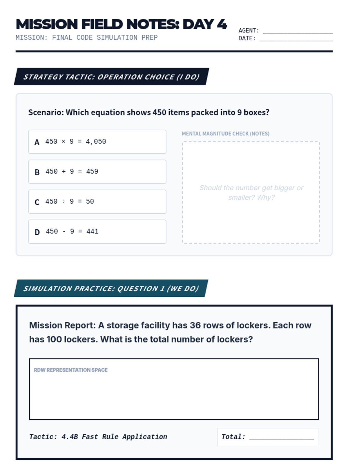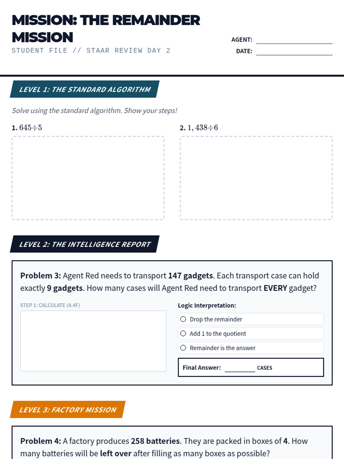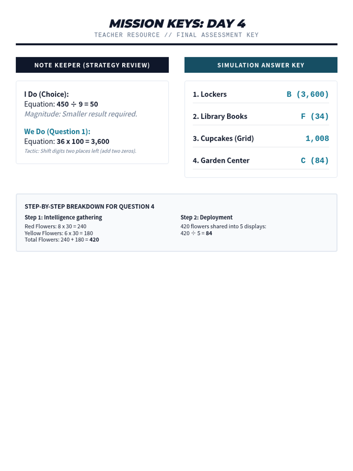 A 4-day intensive STAAR math review focused on multiplication and division standards for 4th grade. The unit uses a 'Math Mission' theme to engage students while covering complex multi-step problems and standard algorithms.