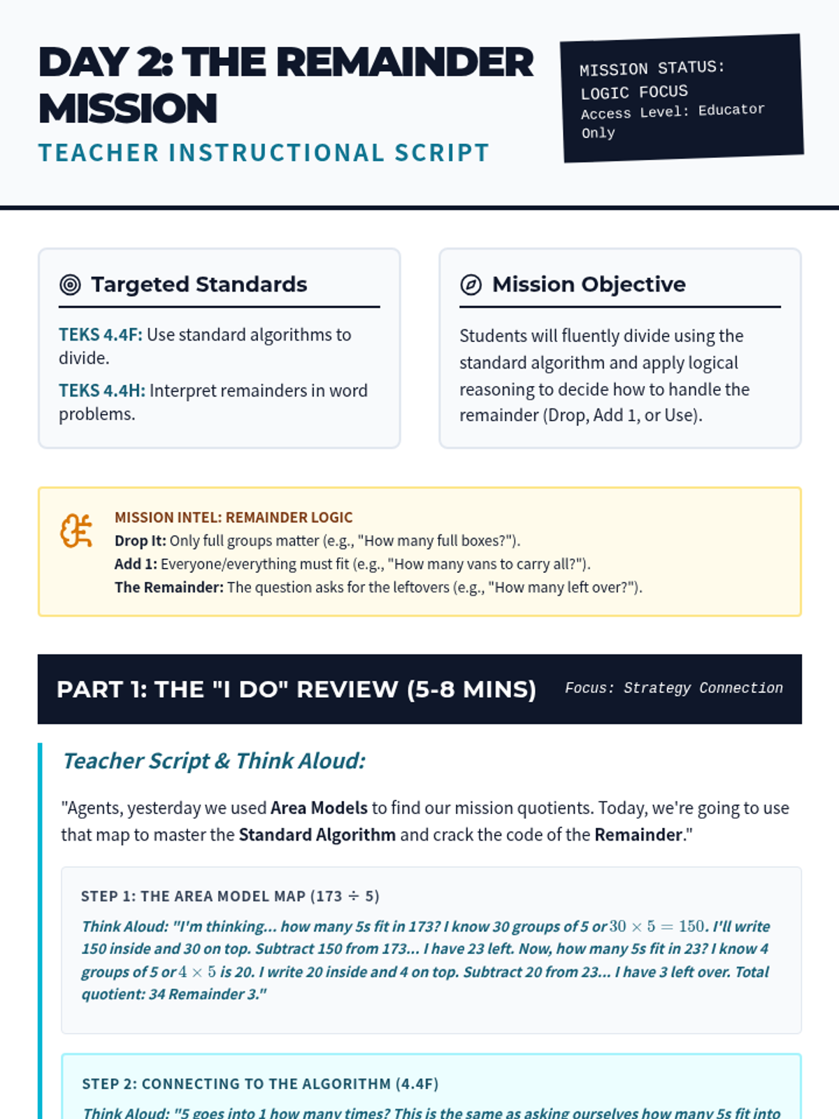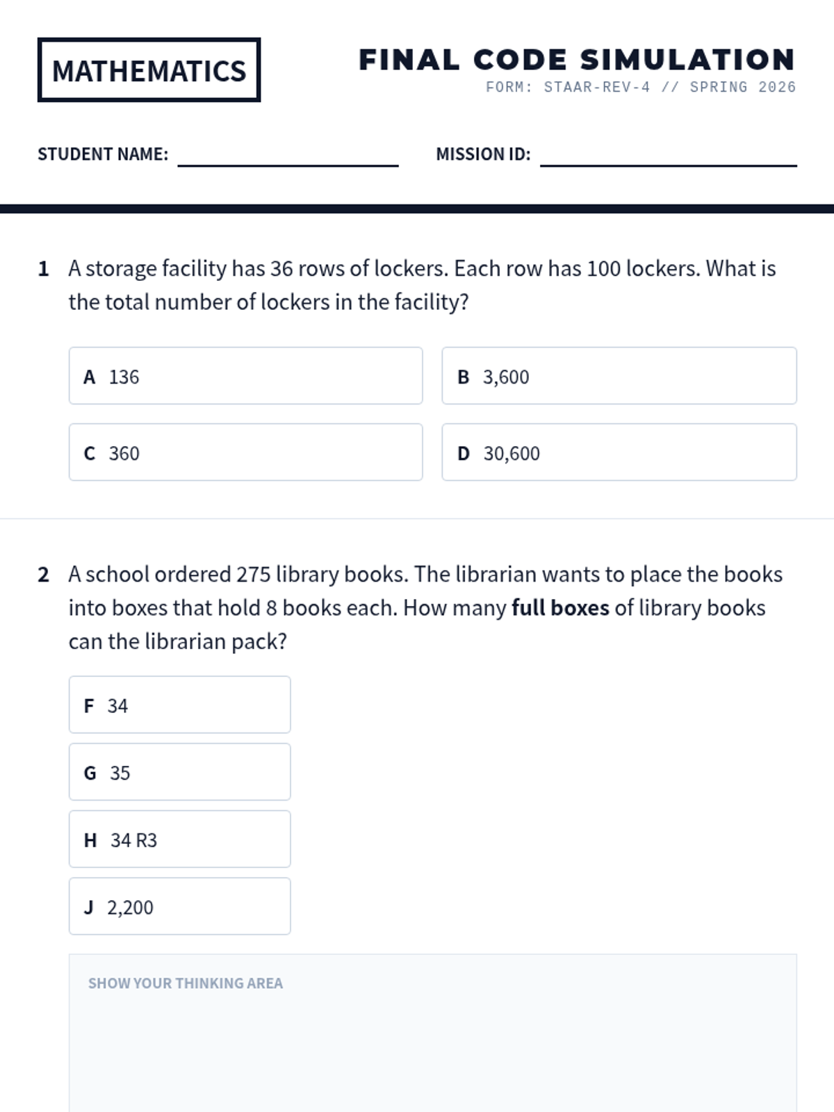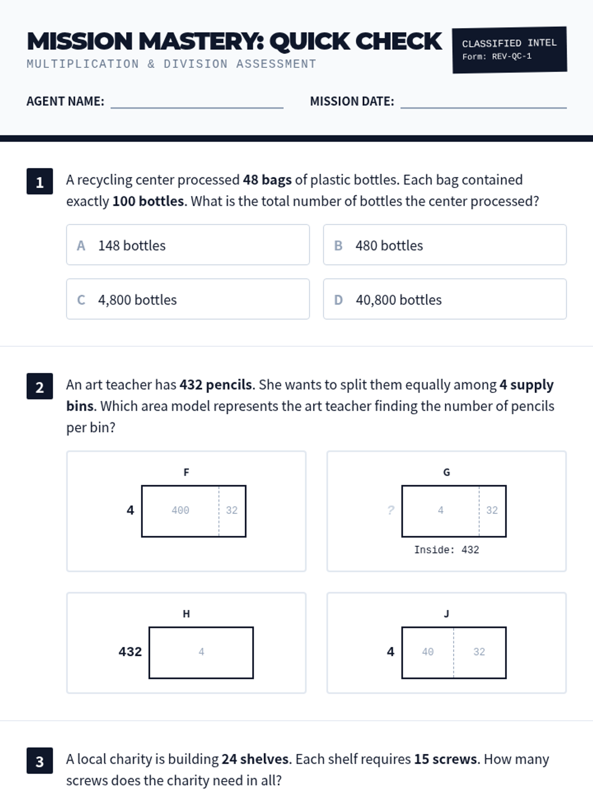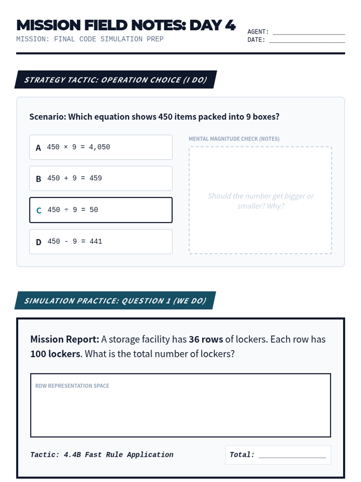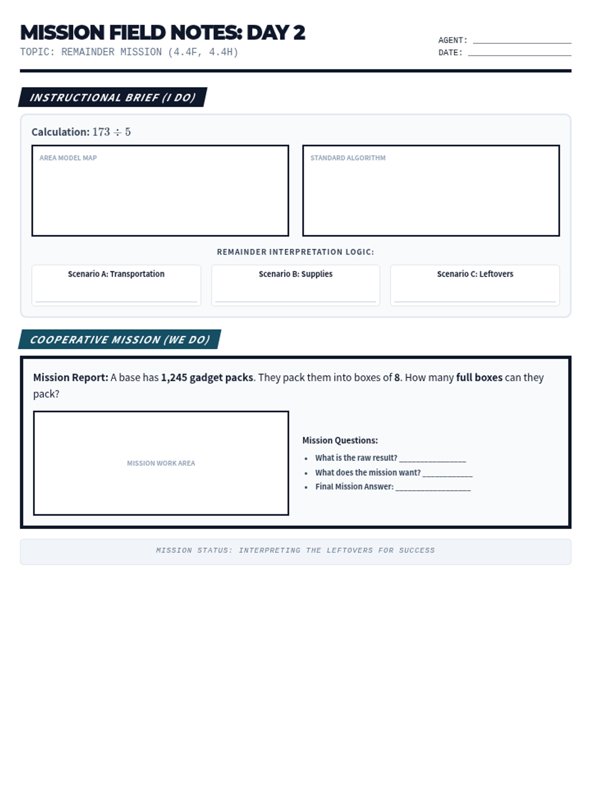 A 4-day intensive STAAR math review focused on multiplication and division standards for 4th grade. The unit uses a 'Math Mission' theme to engage students while covering complex multi-step problems and standard algorithms.