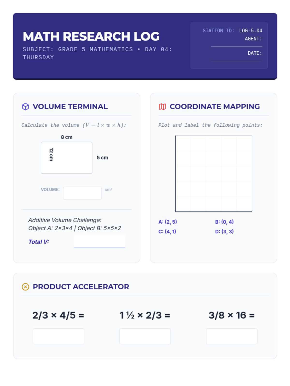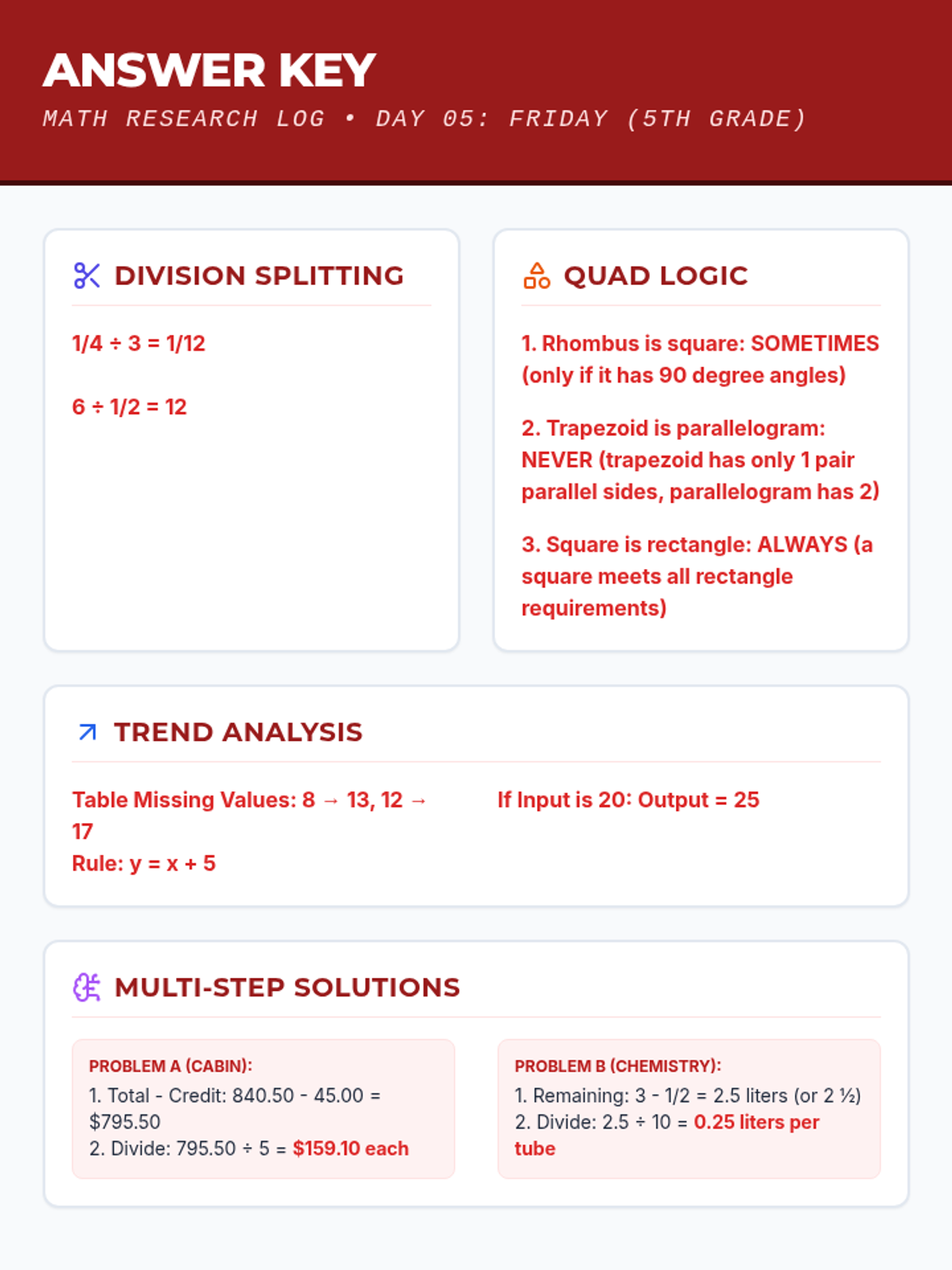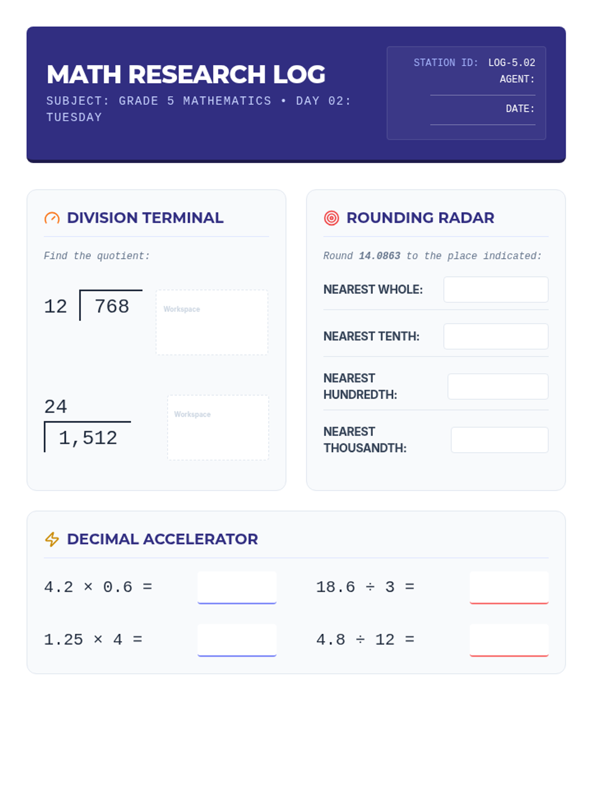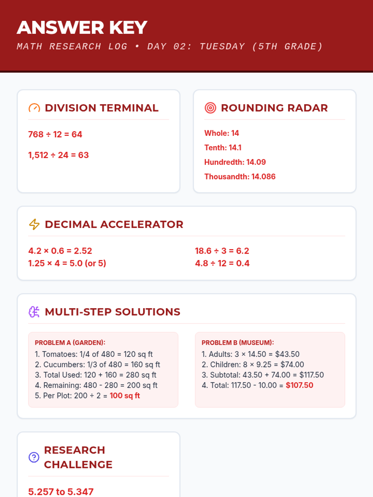 A rigorous week of spiral math review for 5th-grade students. Each day features a 2-page worksheet covering mixed standards—including decimal operations, fraction arithmetic, multi-digit division, and volume—along with complex multi-step word problems and detailed answer keys.