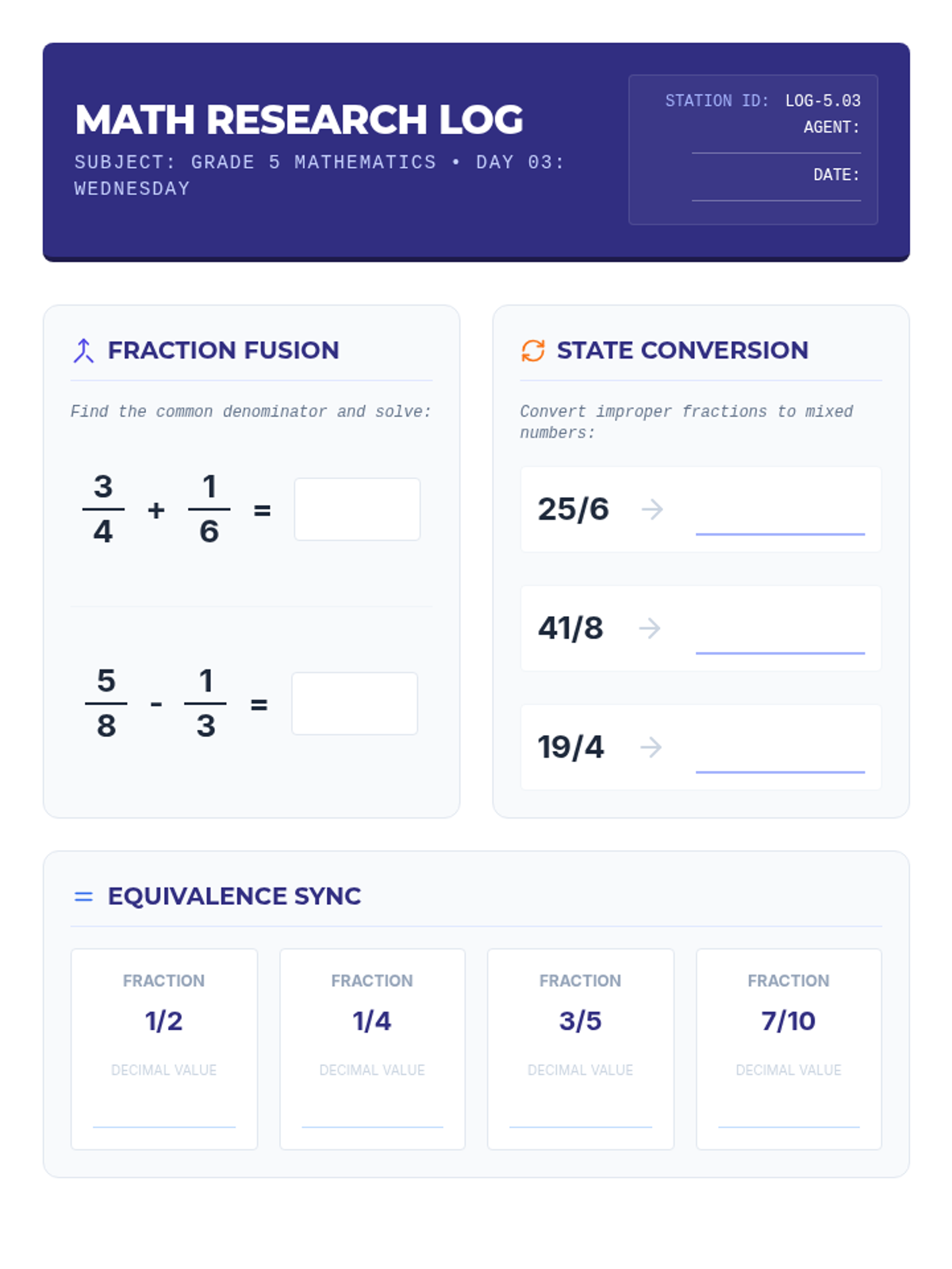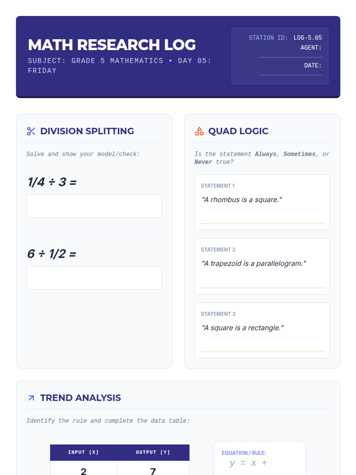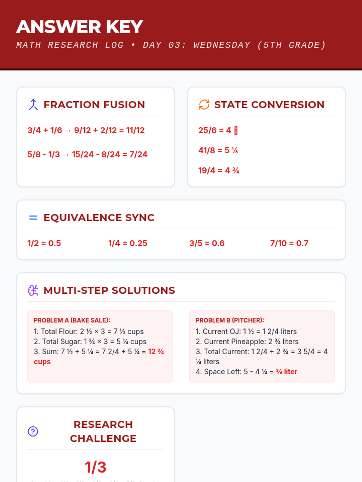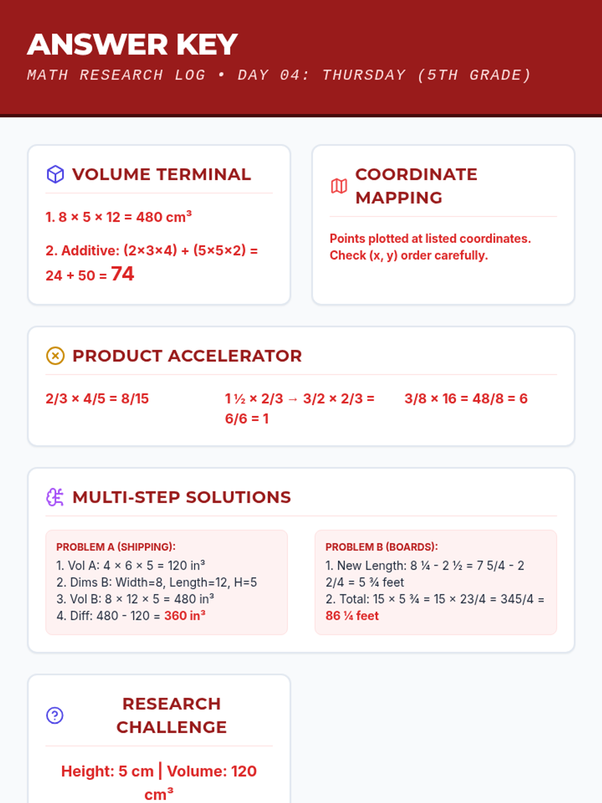 A rigorous week of spiral math review for 5th-grade students. Each day features a 2-page worksheet covering mixed standards—including decimal operations, fraction arithmetic, multi-digit division, and volume—along with complex multi-step word problems and detailed answer keys.
