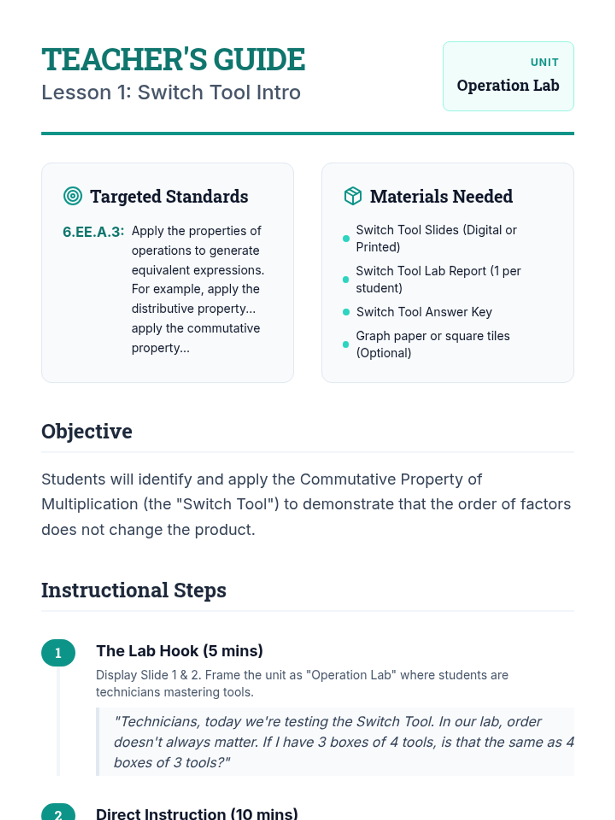 A 12-lesson Tier 2 intervention unit for 6th-grade students focusing on the properties of operations (Commutative, Associative, and Distributive). Students learn to use these properties as "tools" in an "Operation Lab" to simplify multiplication and division tasks, progressing from visual models to mental math applications.