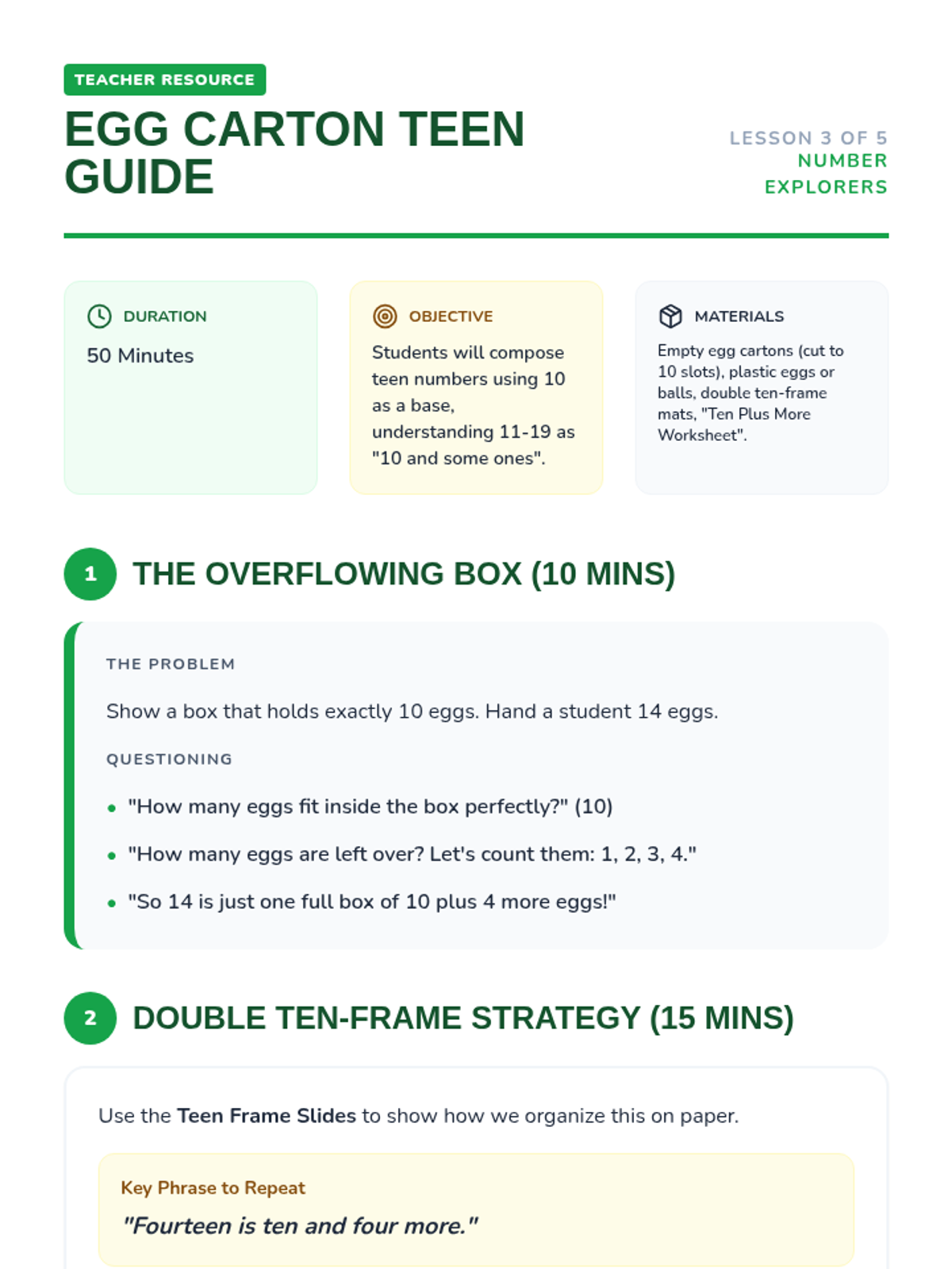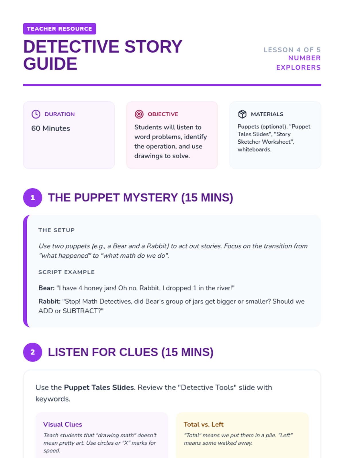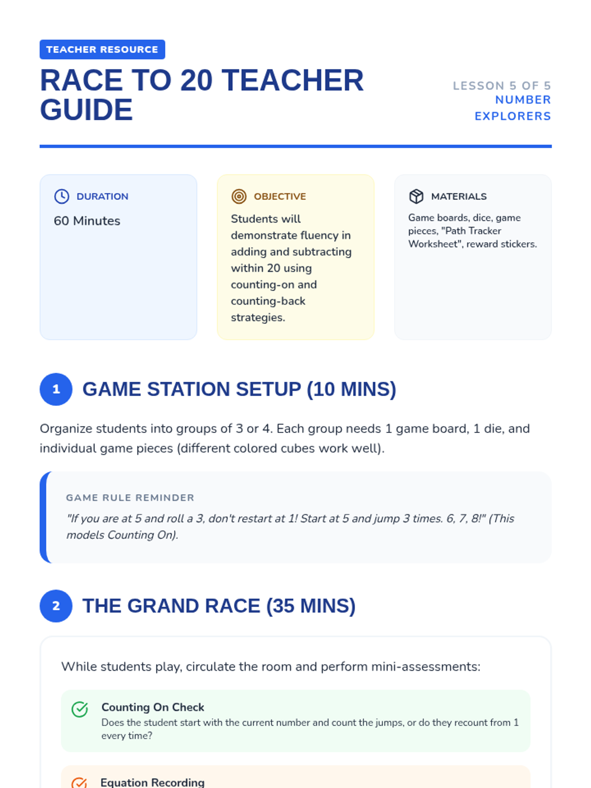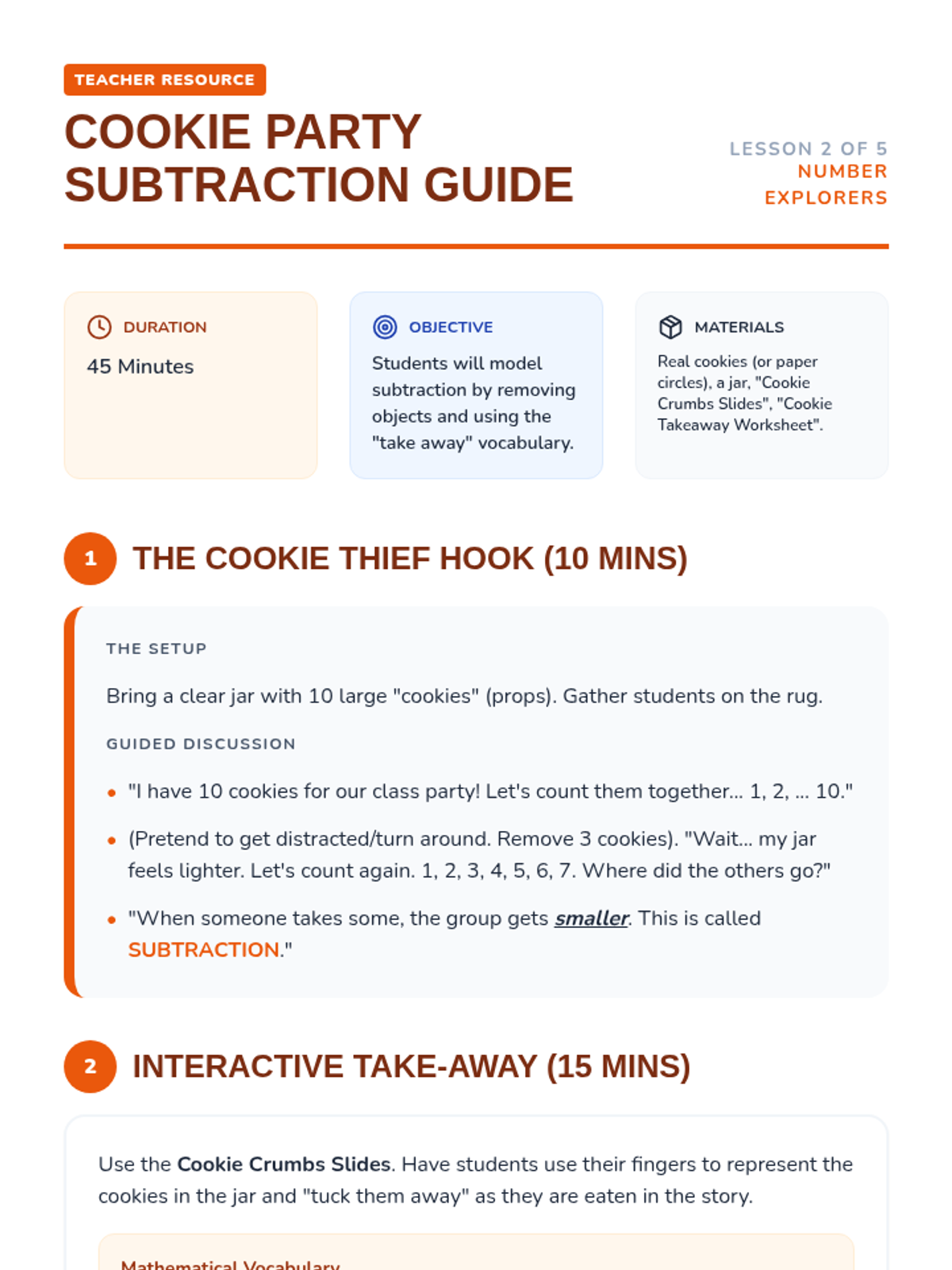 A foundational sequence for Kindergarten students to master addition and subtraction up to 20 through concrete activities, pictorial representations, and math stories. Students will build a strong understanding of joining, taking away, and the structure of teen numbers.