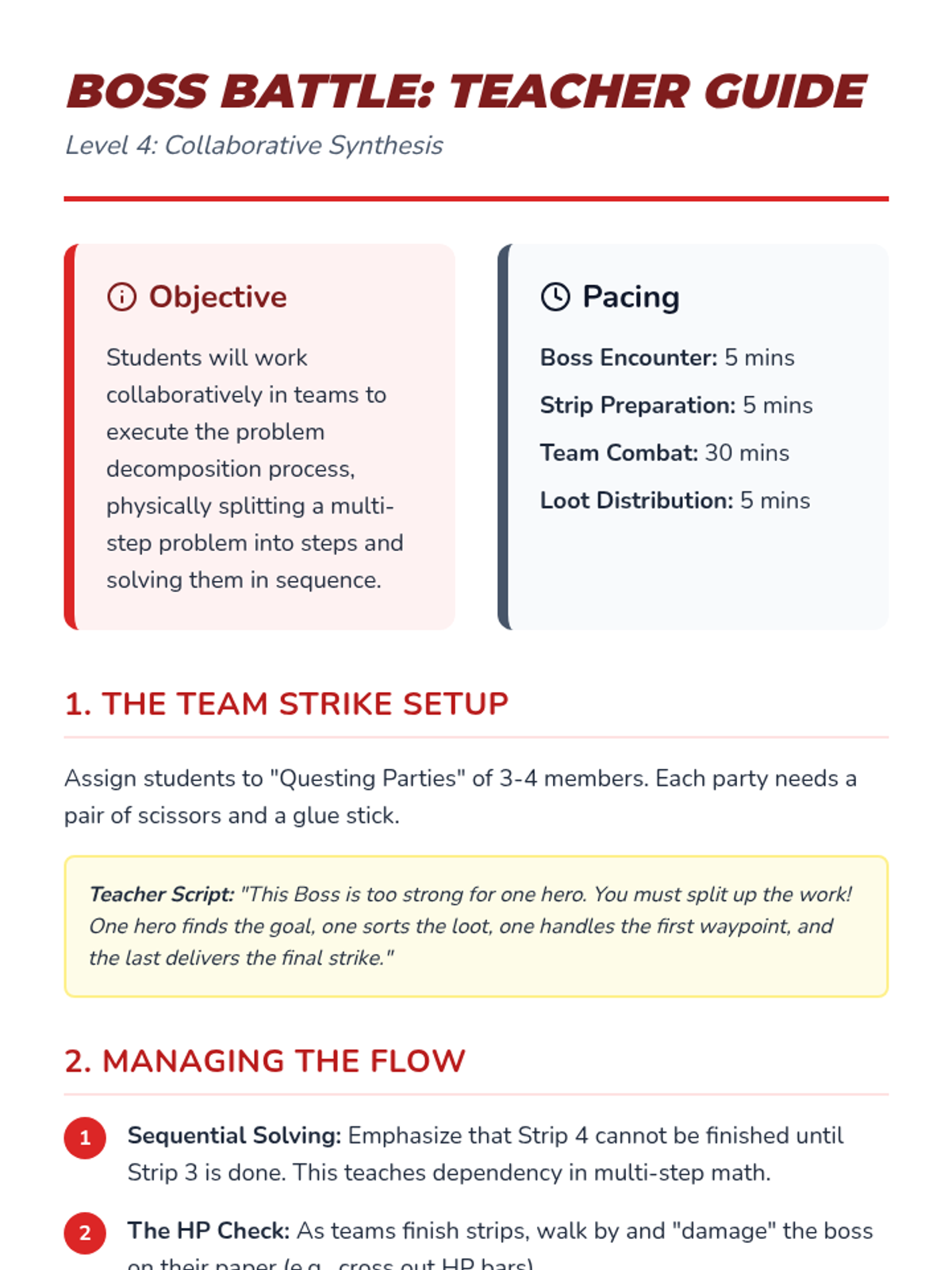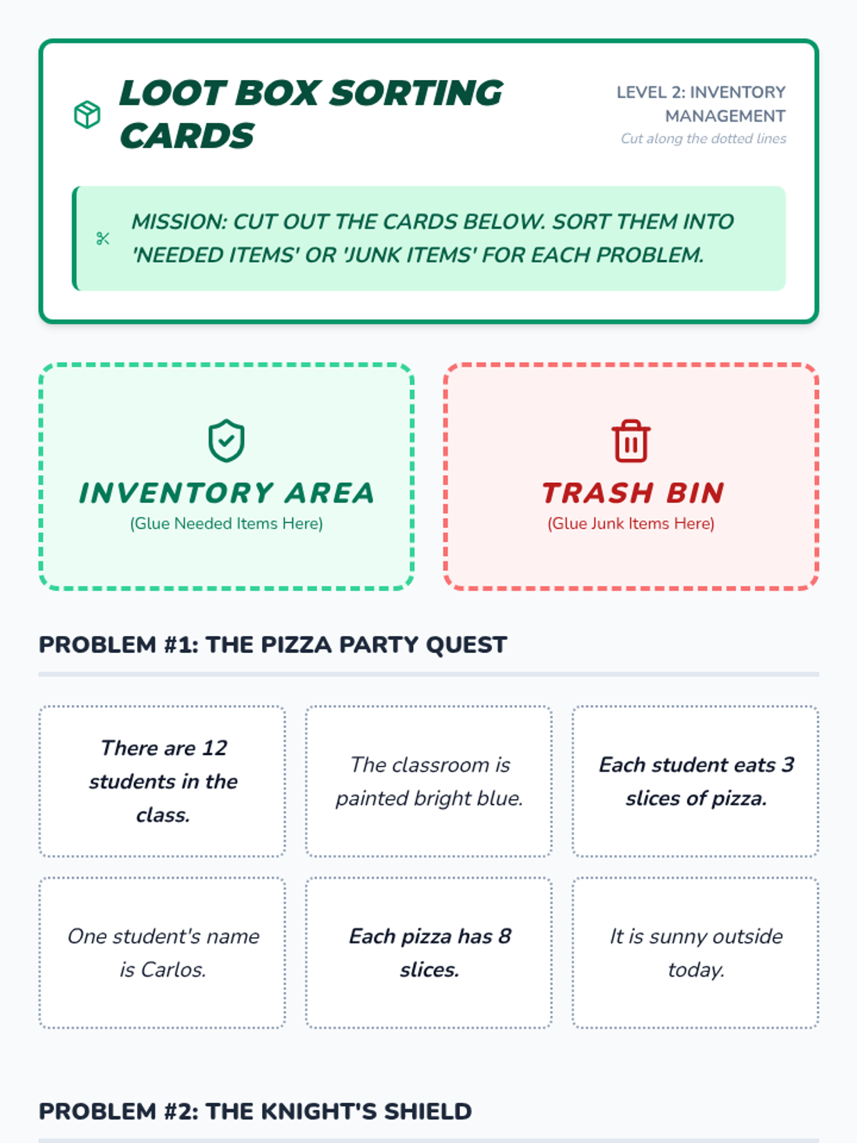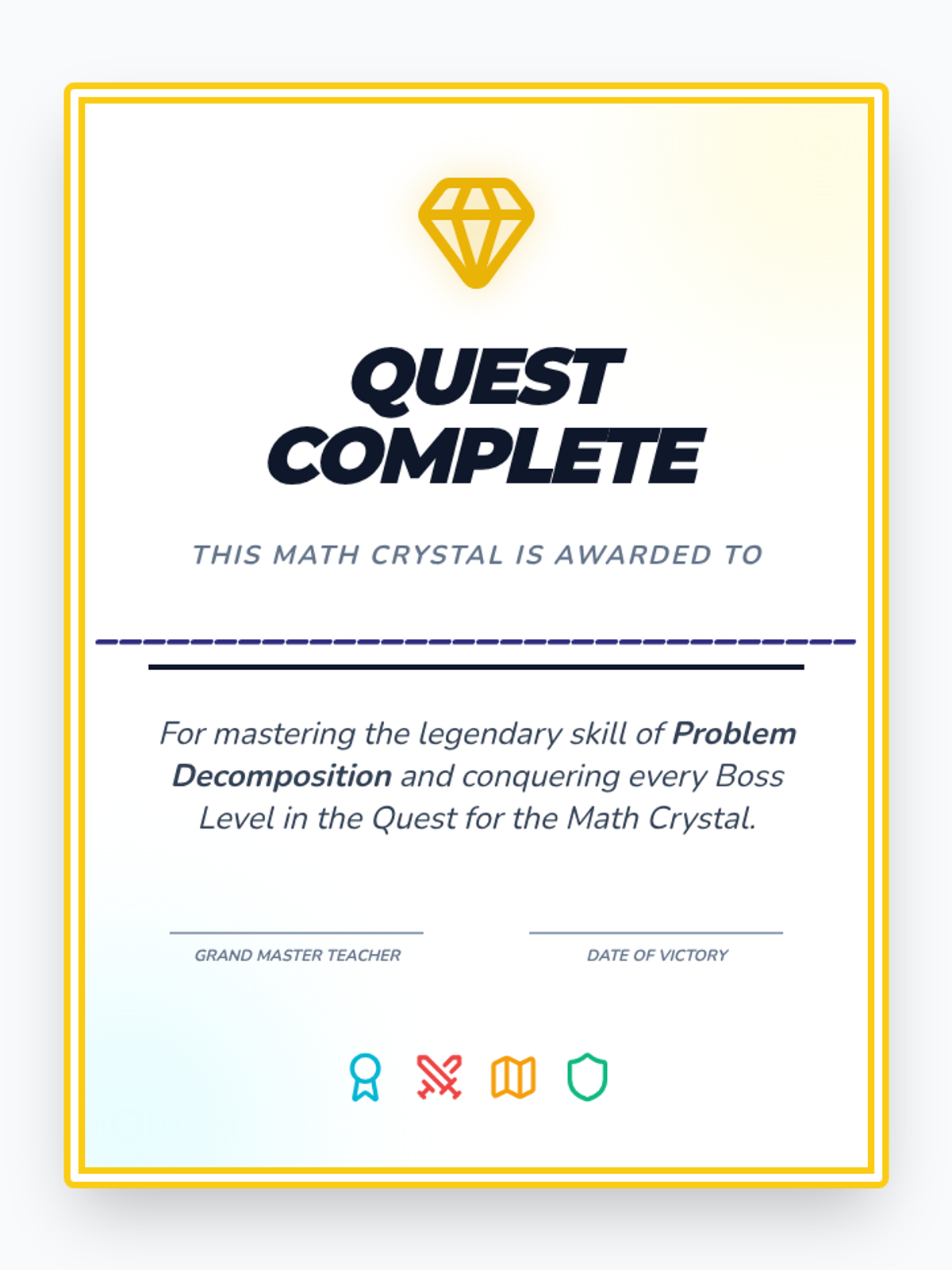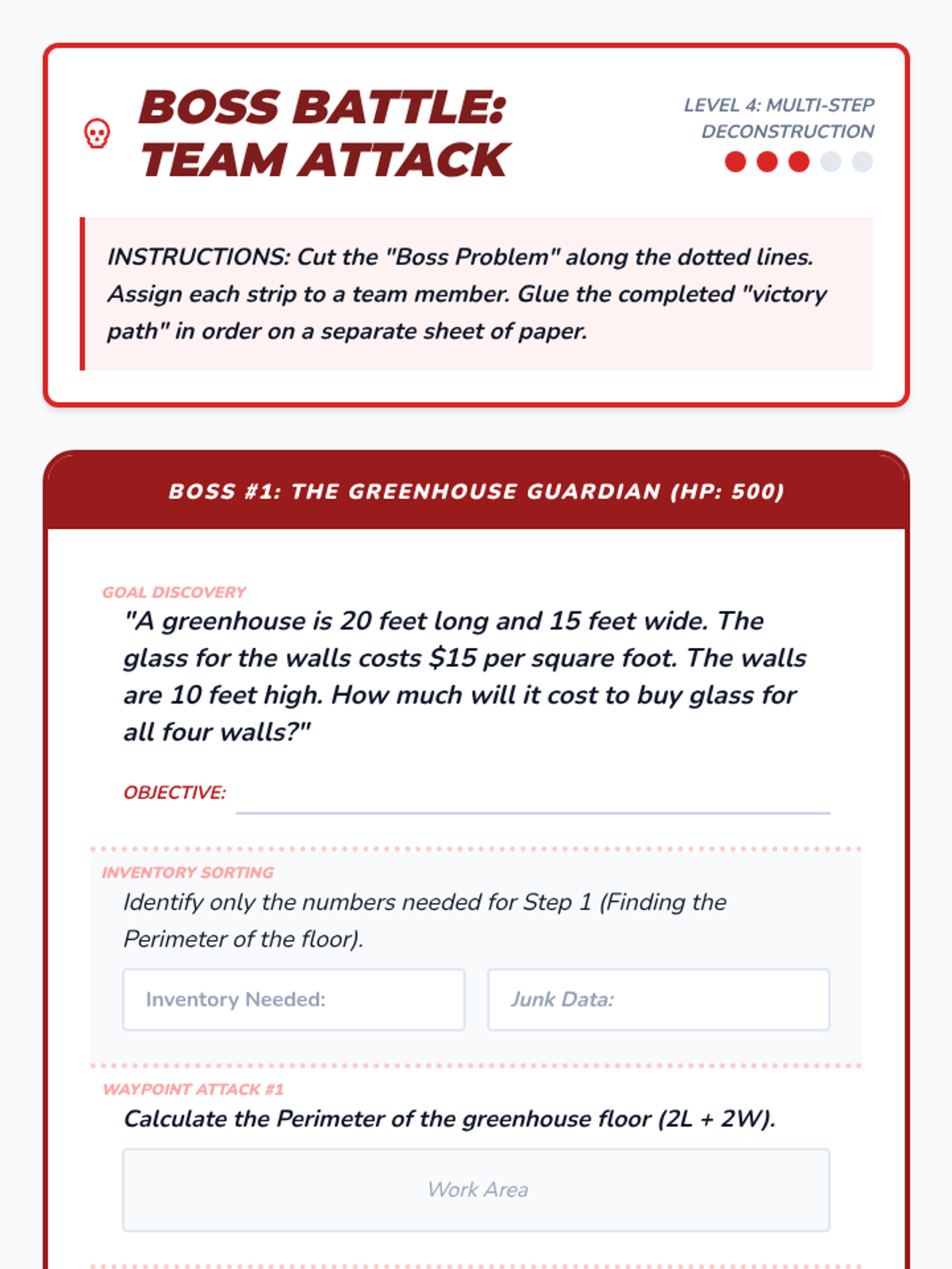 A gamified approach to mathematical problem decomposition, treating complex 7th-grade math problems as 'boss levels' to be unlocked through sub-goal setting, task analysis, and information sorting. Students earn points and level up as they master the executive function skills required for multi-step problem solving.