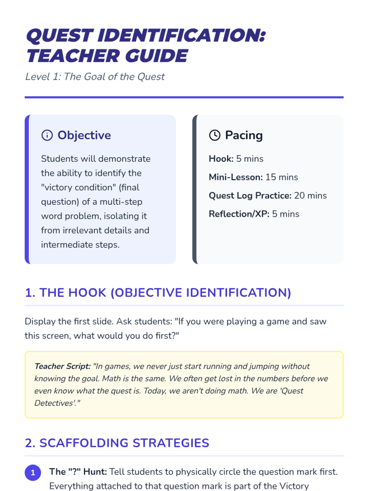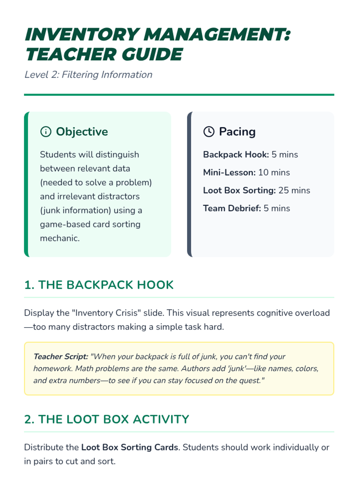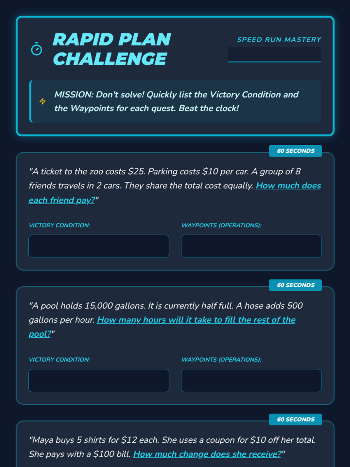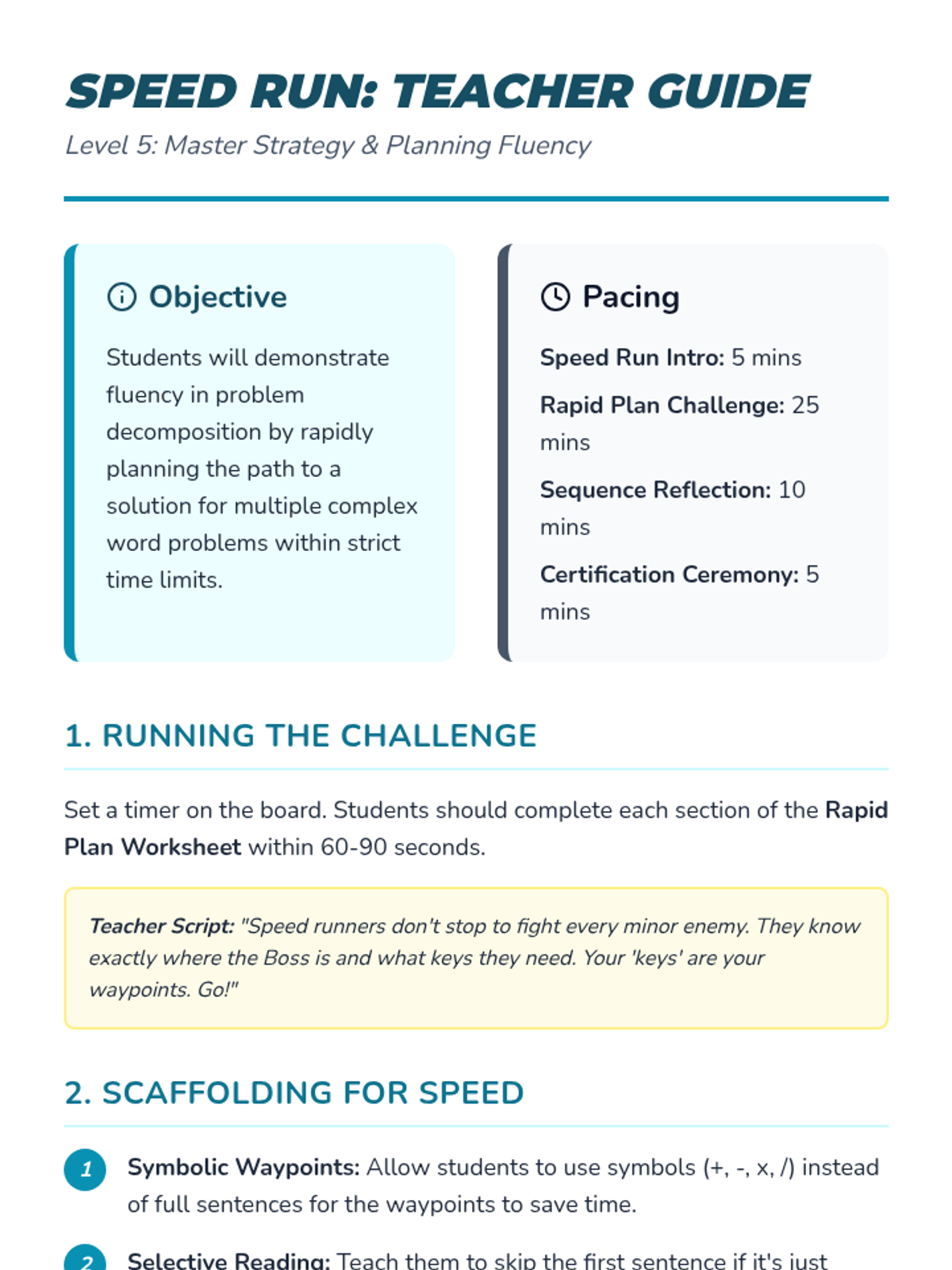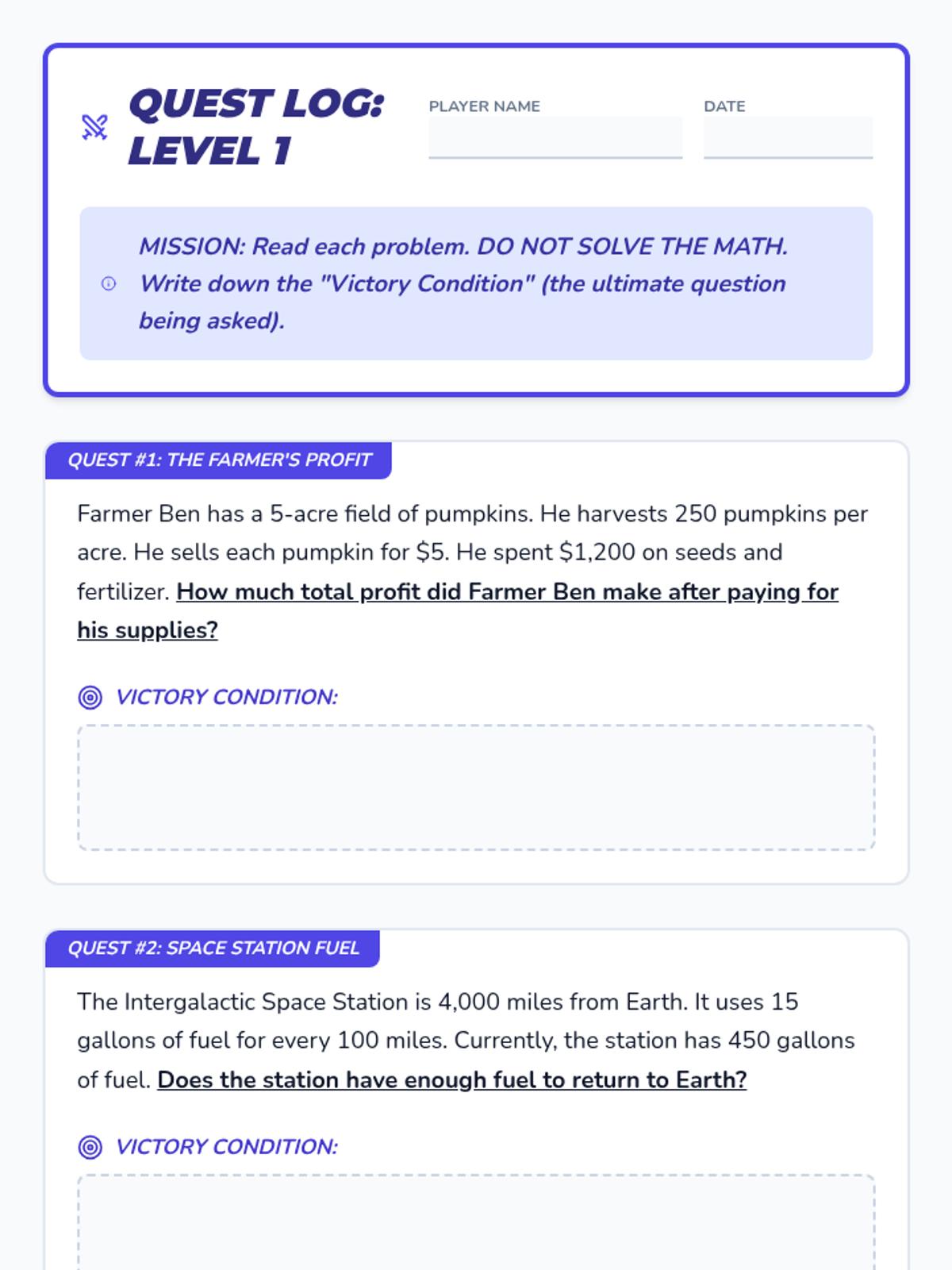 A gamified approach to mathematical problem decomposition, treating complex 7th-grade math problems as 'boss levels' to be unlocked through sub-goal setting, task analysis, and information sorting. Students earn points and level up as they master the executive function skills required for multi-step problem solving.