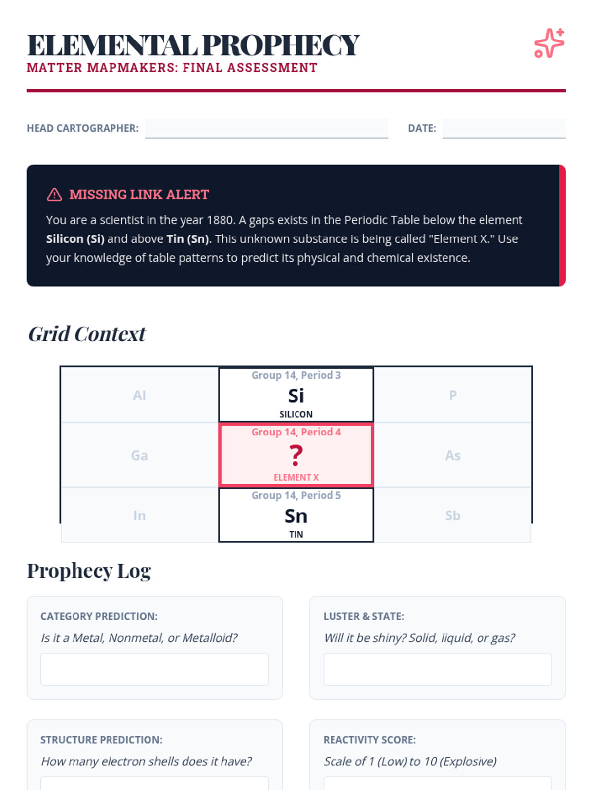 This sequence explores the Periodic Table as a logical map of the universe, moving from basic classification of matter to using the table as a predictive tool for scientific discovery. Students act as 'Elemental Cartographers' to uncover the patterns that govern the building blocks of matter.