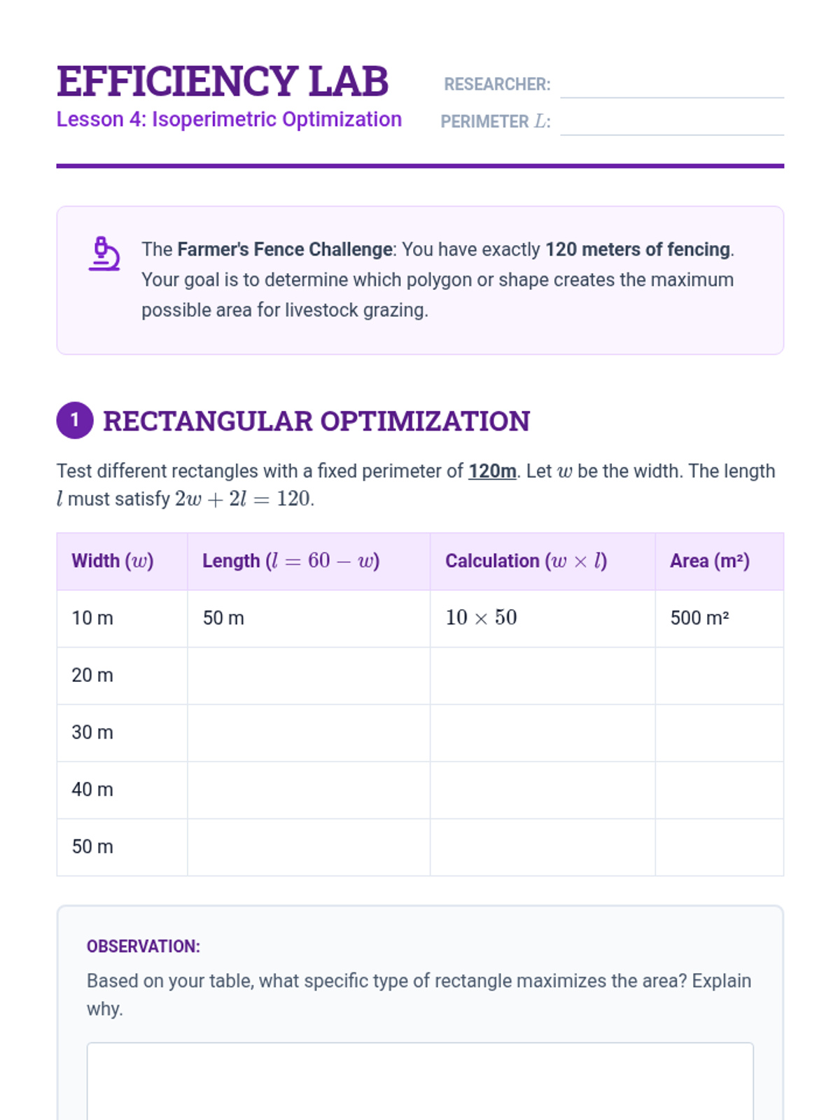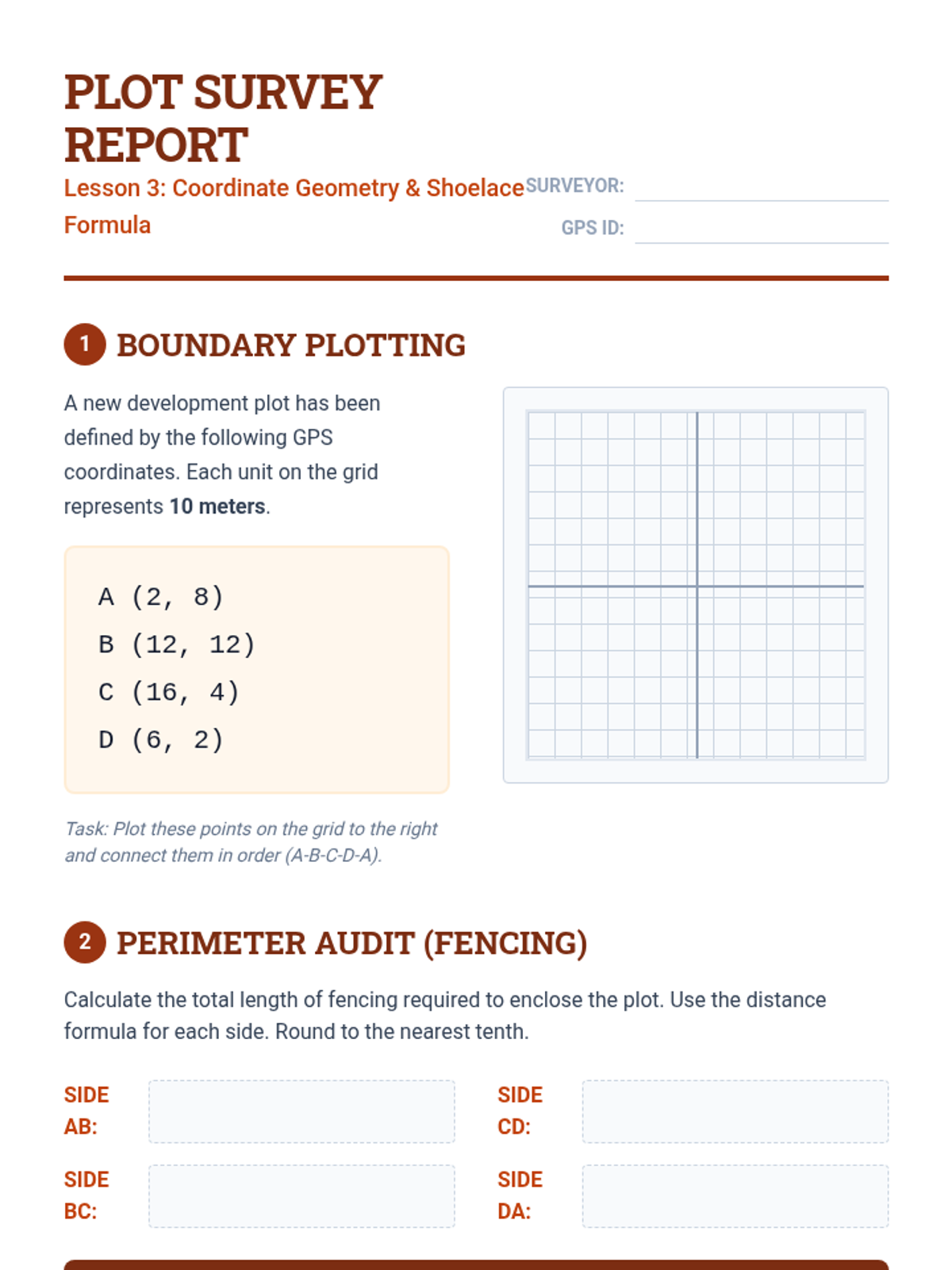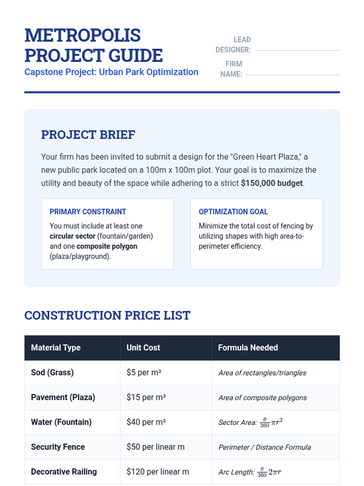 A 10th-grade geometry sequence focused on the practical application of area and perimeter formulas. Students transition from decomposing simple composite figures to optimizing space using the Shoelace formula and isoperimetric principles, culminating in an urban design project.