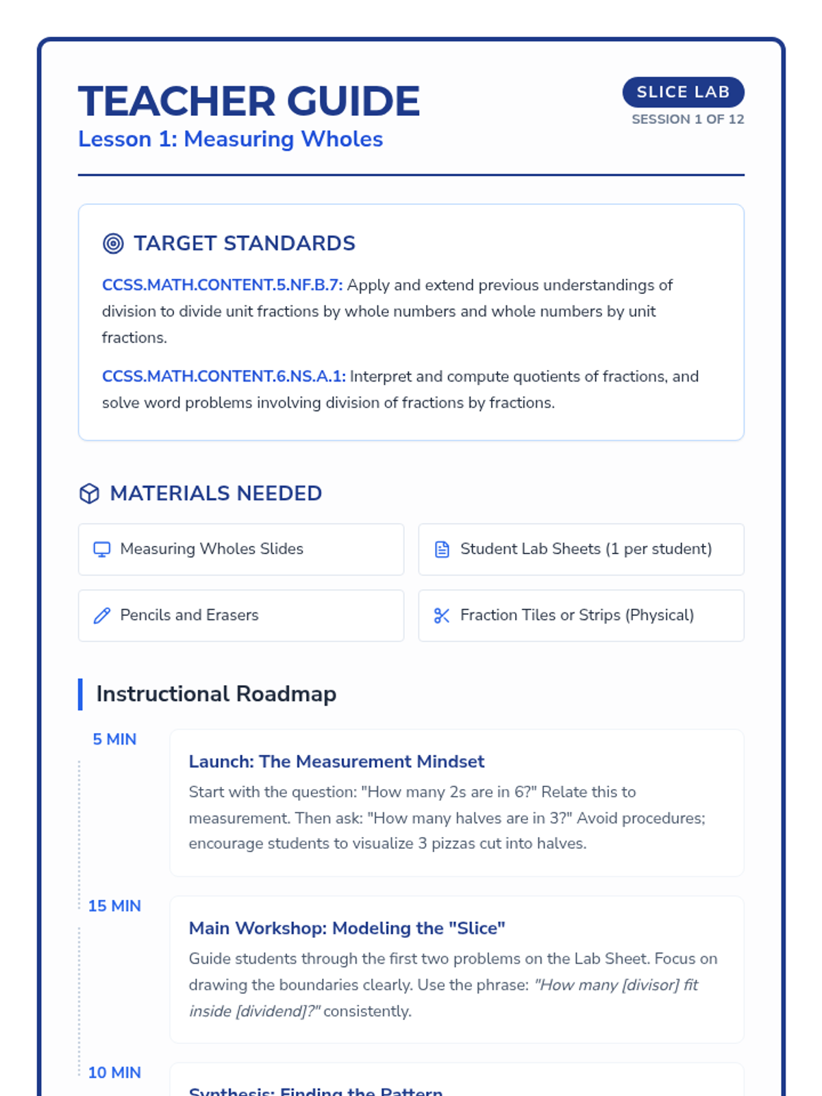 A 12-session tier 2 intervention sequence designed to build conceptual mastery of fraction division. Grounded in All Learners Network (ALN) principles, students progress from visual measurement models to the common denominator strategy and eventually the standard algorithm through deep reasoning and high-leverage concepts.