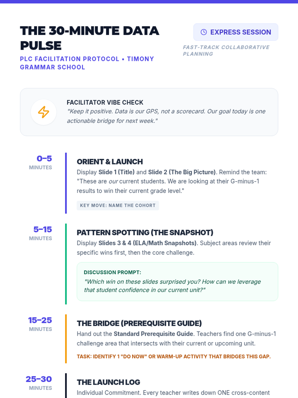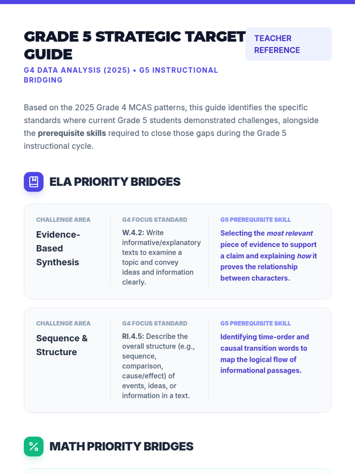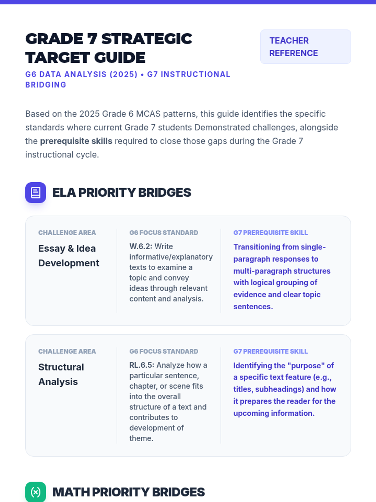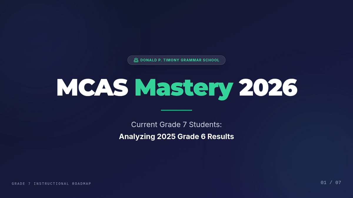 A strategic professional development sequence focused on analyzing Grade 5 MCAS data to drive Grade 6 instructional improvements. The materials emphasize growth mindset, data-driven targeting, and actionable classroom strategies for teachers.