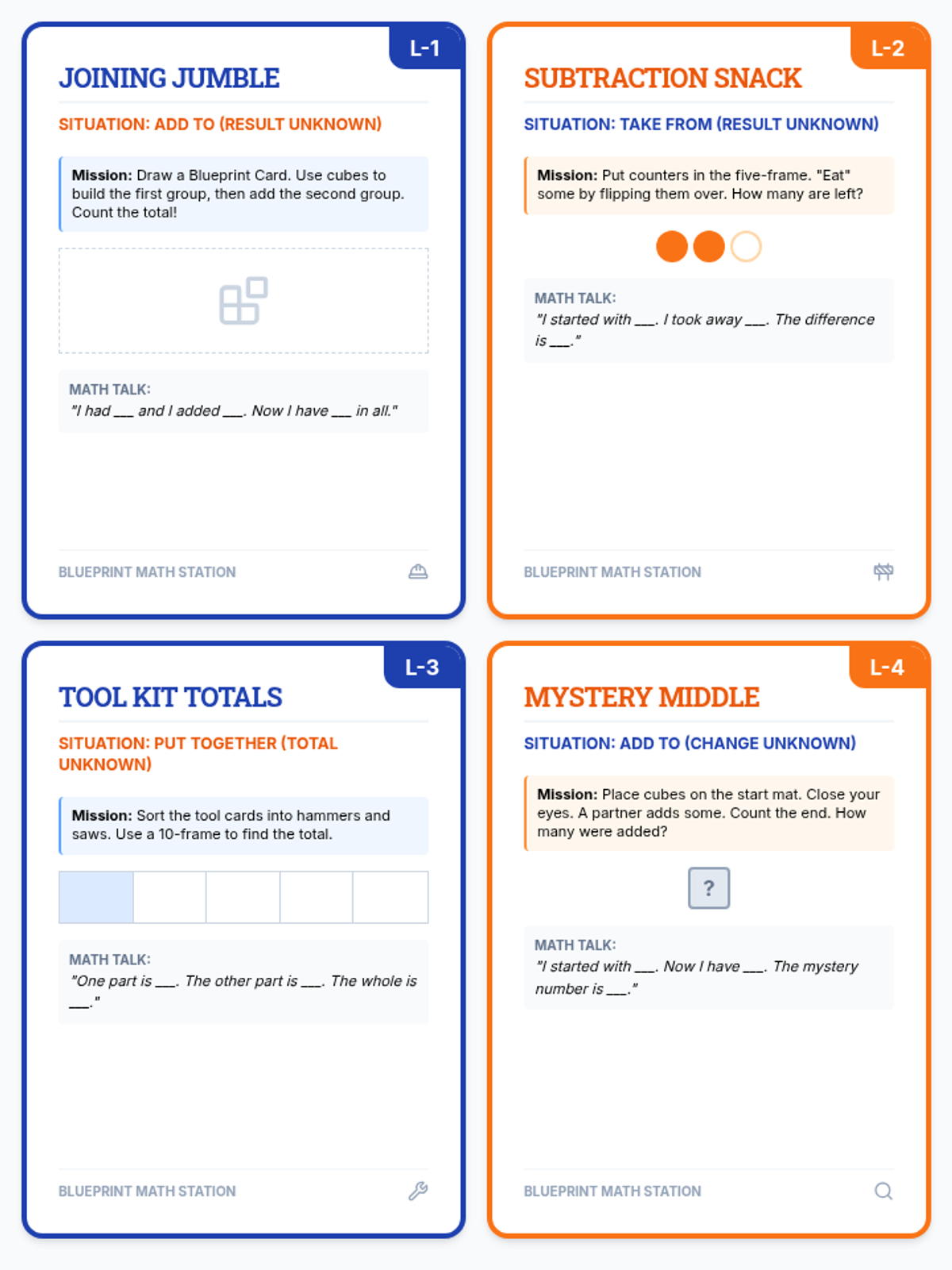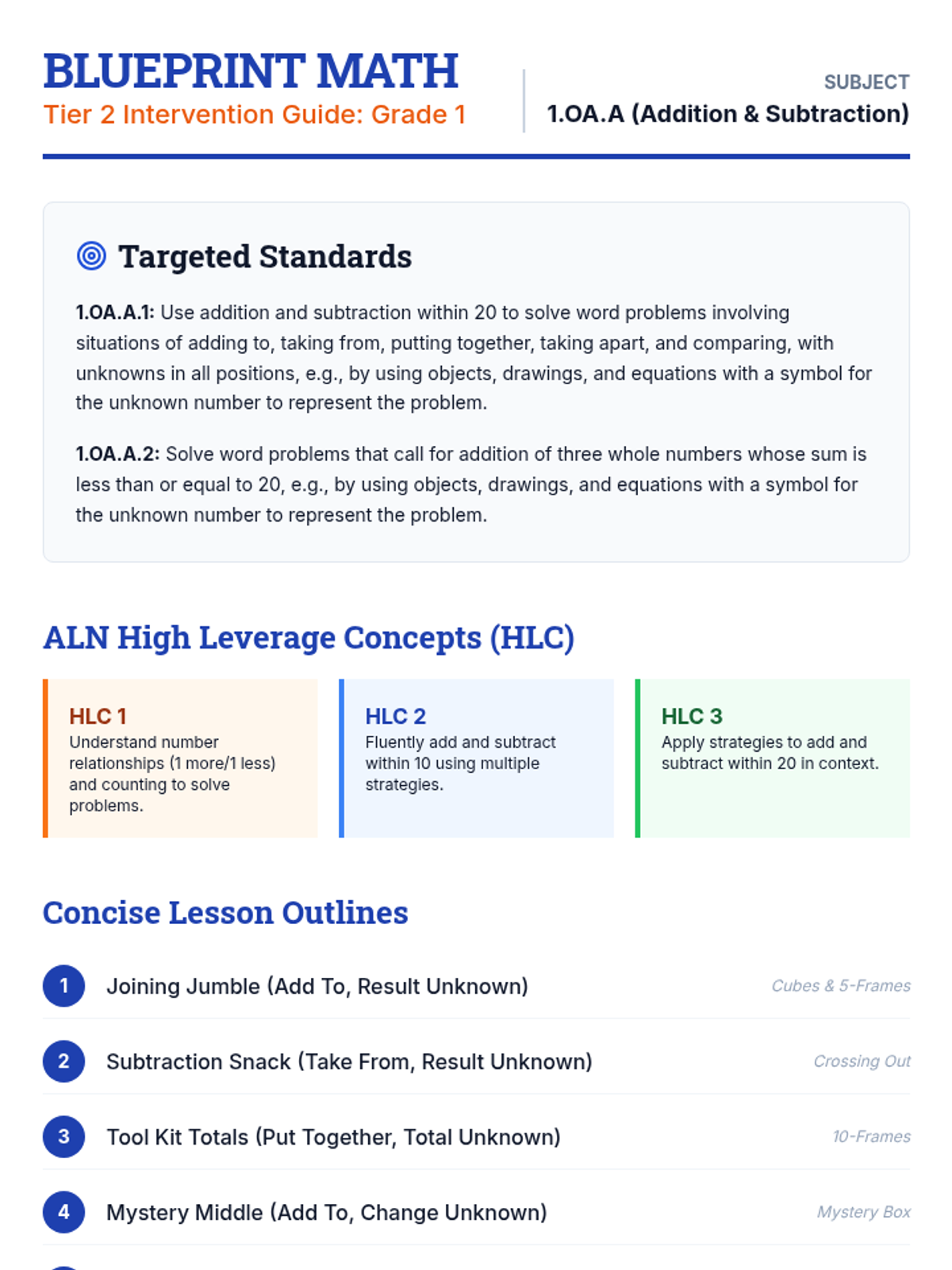 A comprehensive 12-lesson Tier 2 intervention sequence for first-grade students focused on 1.OA.A standards. The sequence utilizes All Learners Network (ALN) High Leverage Concepts and IM methods like five-frames, ten-frames, and tape diagrams to build conceptual understanding of addition and subtraction situations.