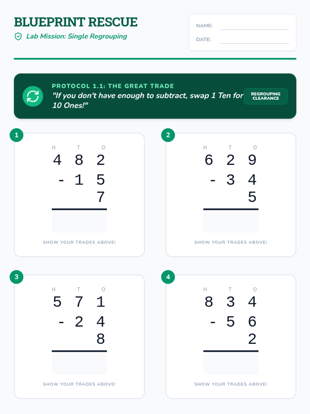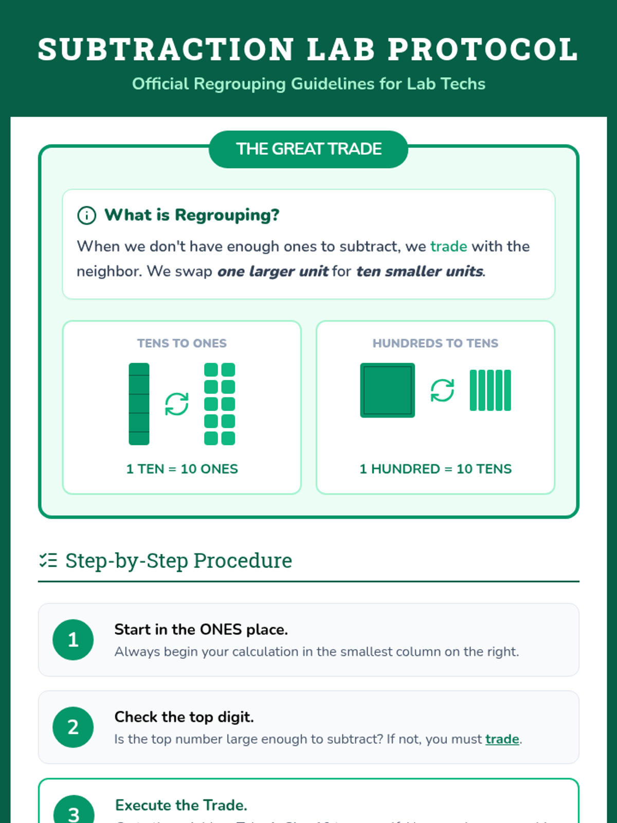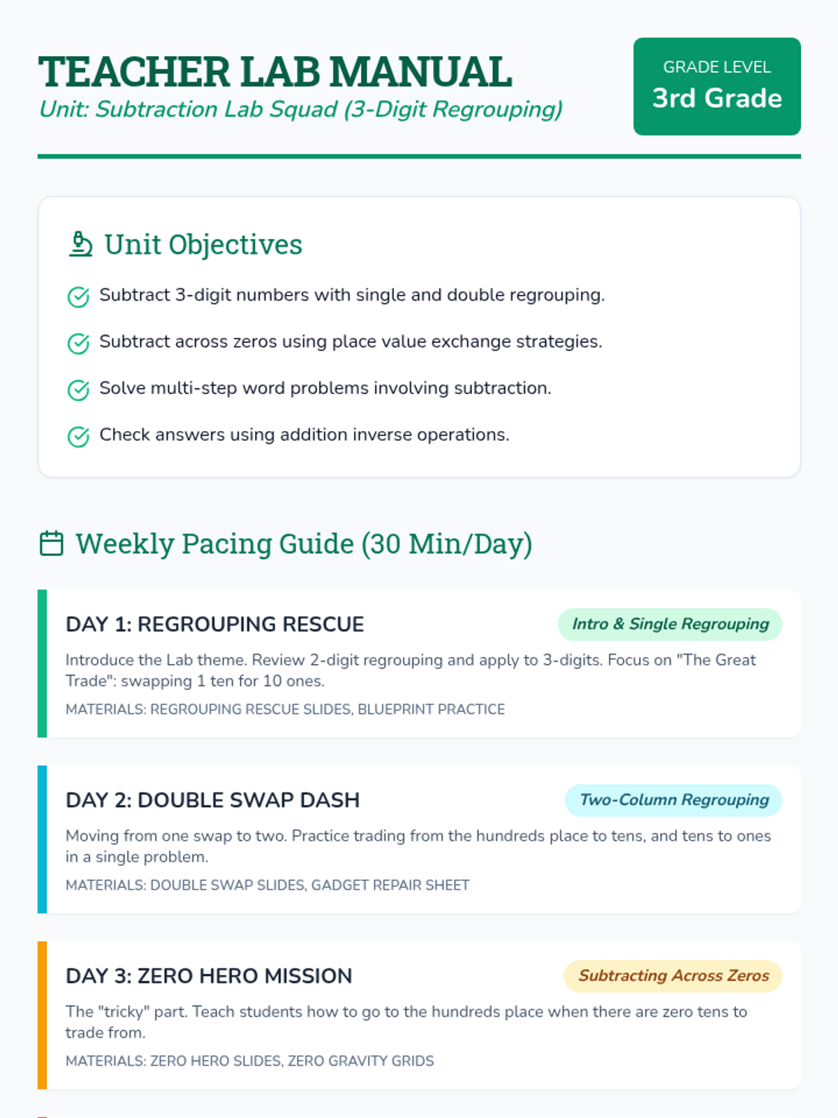 A comprehensive 5-day unit for 3rd-grade students to master 3-digit subtraction with regrouping. The sequence follows a 'Math Lab' theme, moving from single regrouping to double regrouping, subtracting across zeros, and multi-step word problems.