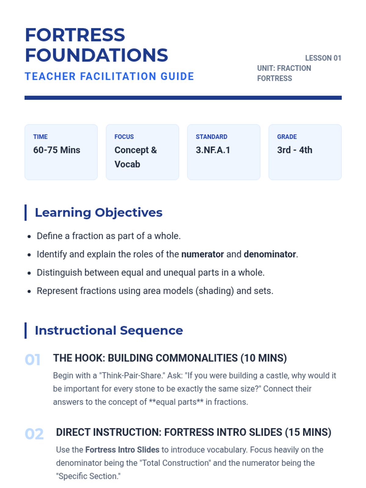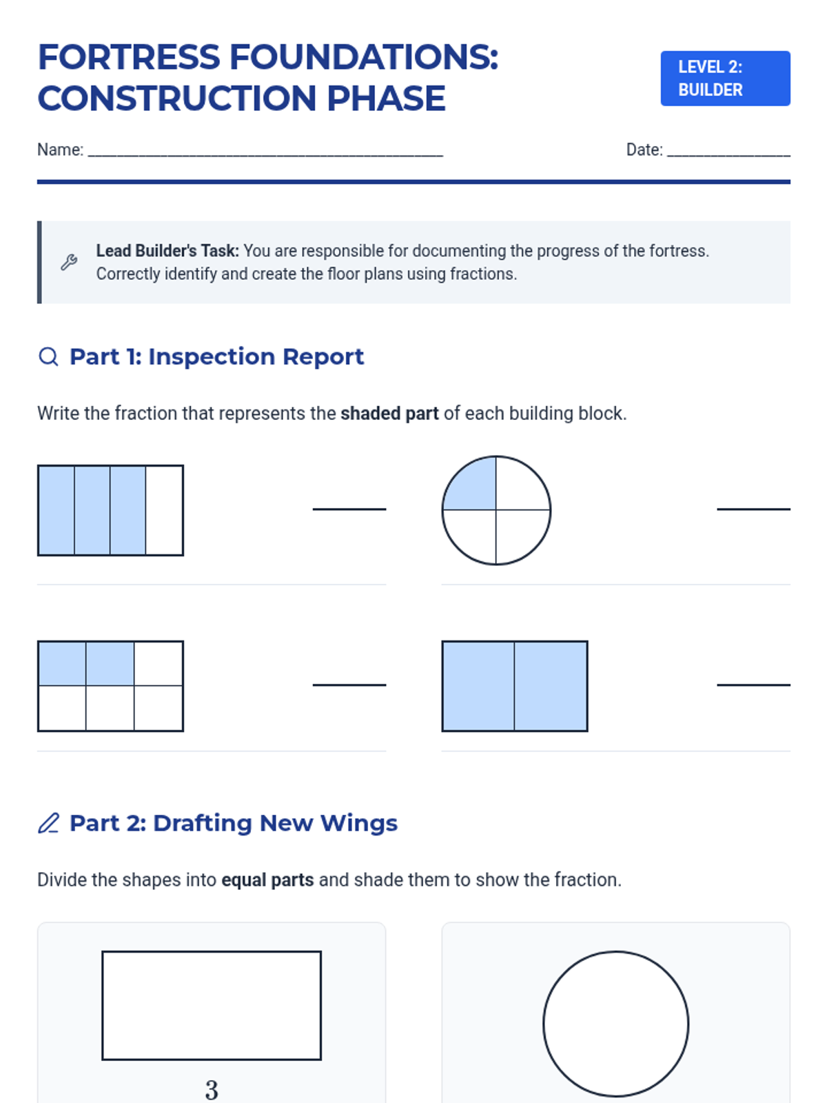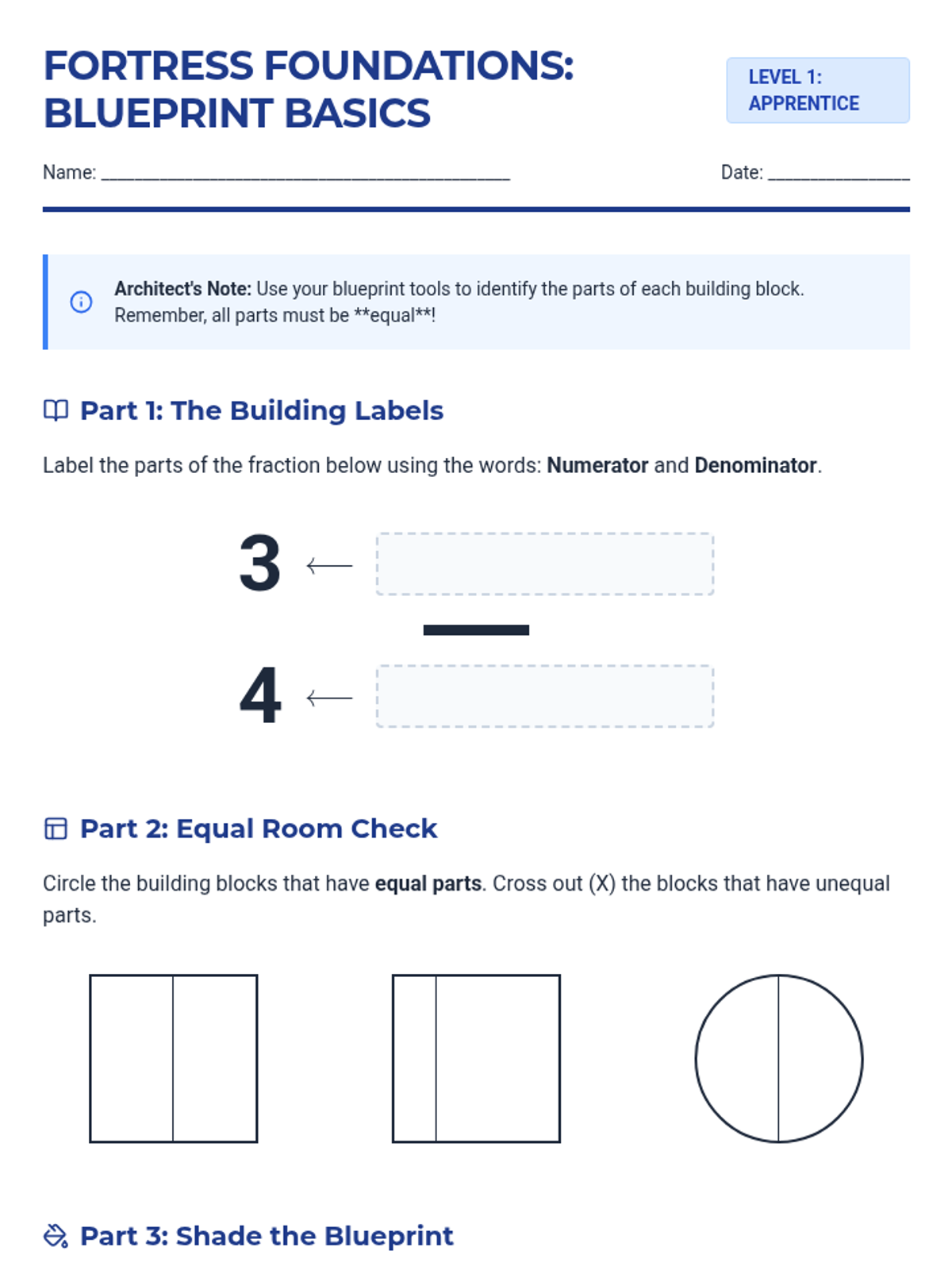 A comprehensive math unit on fractions, themed around architecture and building. Students progress from basic parts of a whole to equivalent fractions and comparisons through tiered, differentiated activities.