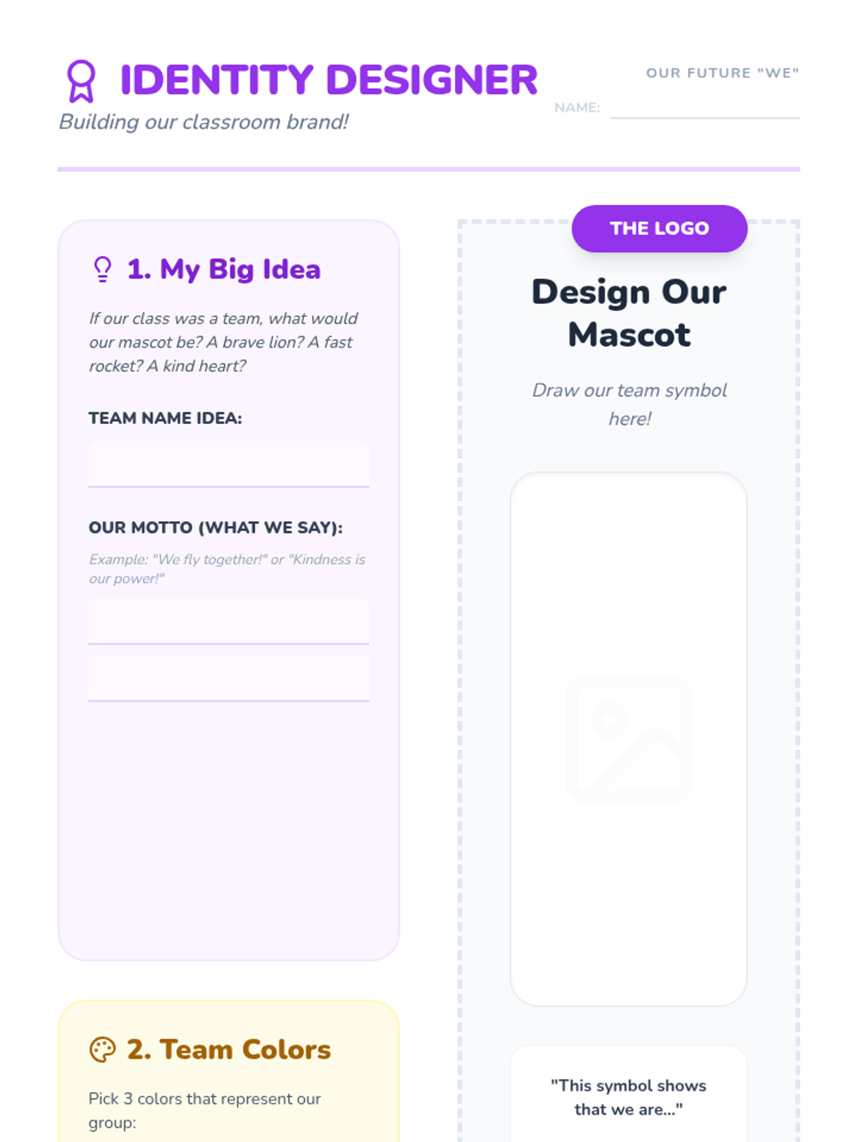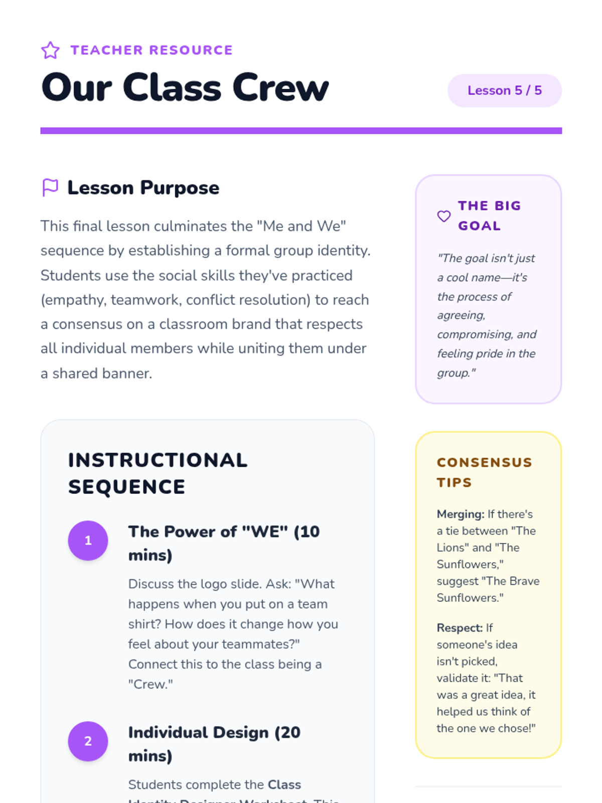 A 1st Grade Social Studies sequence focused on self and identity within a group. Students explore friendship, empathy, teamwork, conflict resolution, and shared classroom identity to answer: 'How can I be me and still be part of a we?'