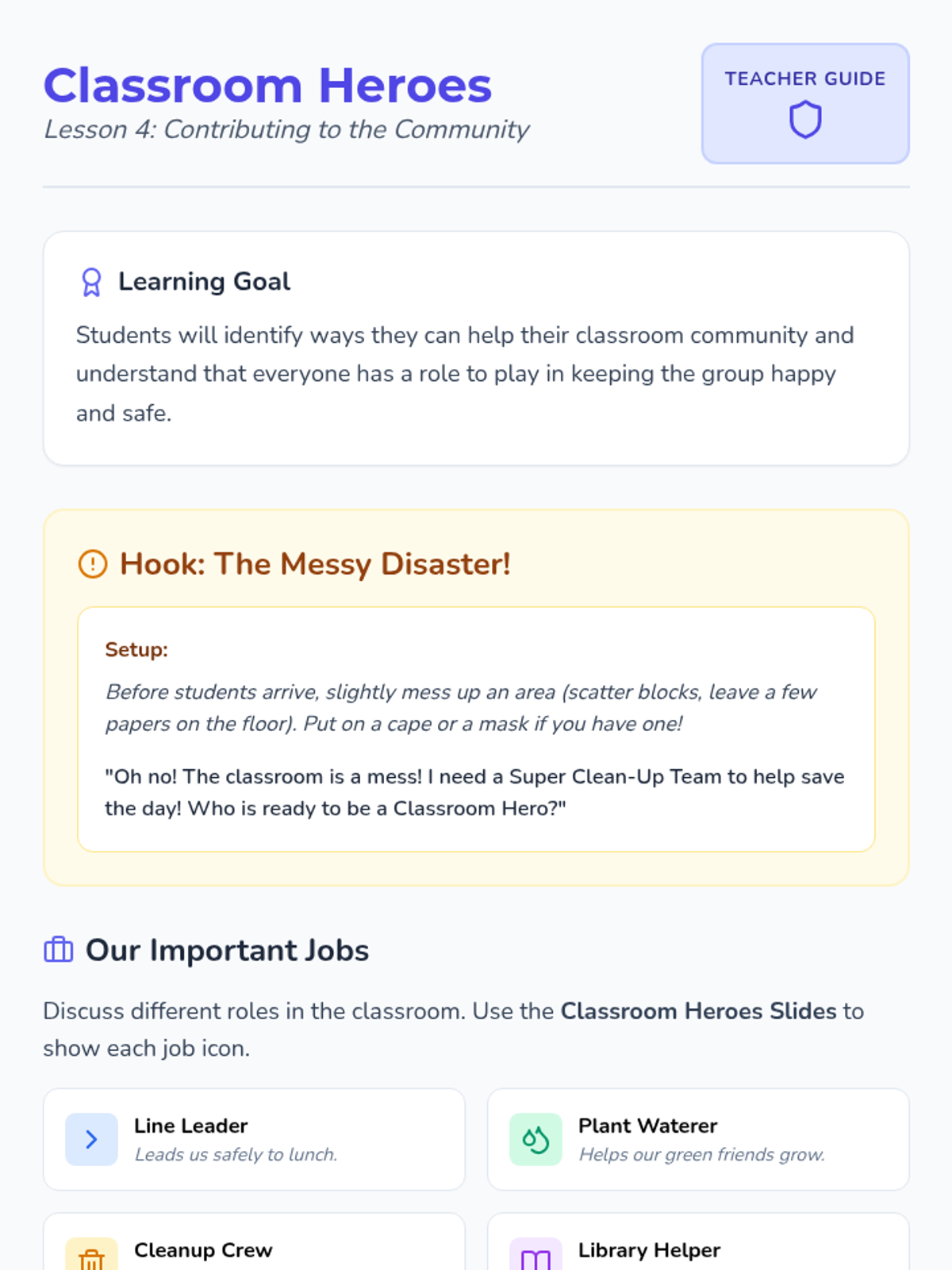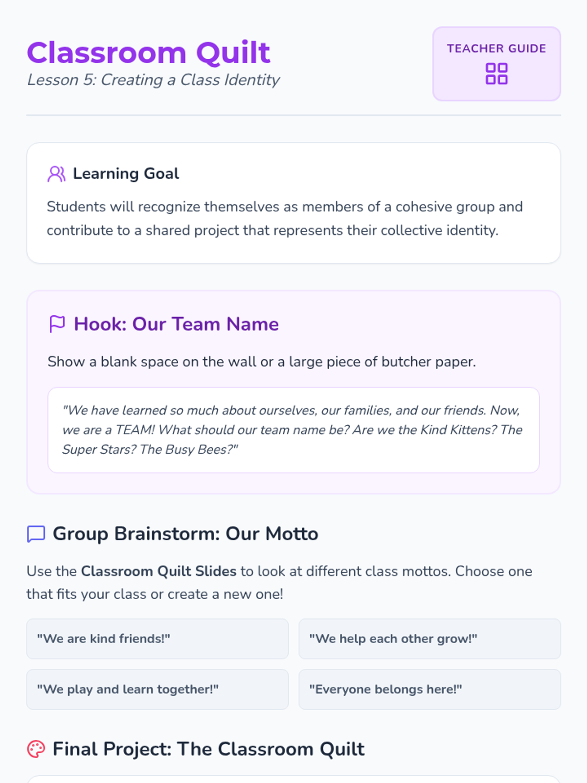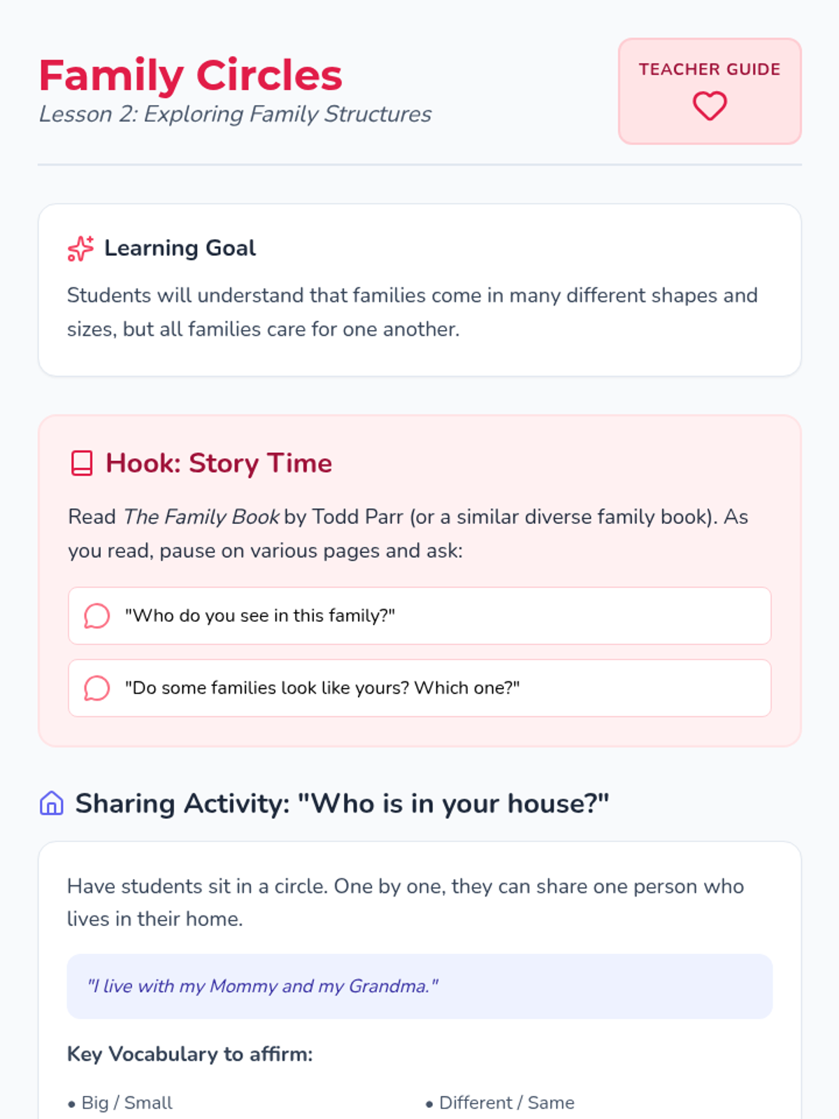 A Pre-K sequence exploring self and identity through relationships, family structures, friendship, and community roles. Students move from individual awareness to understanding their place within various groups, fostering a sense of belonging and appreciation for diversity.