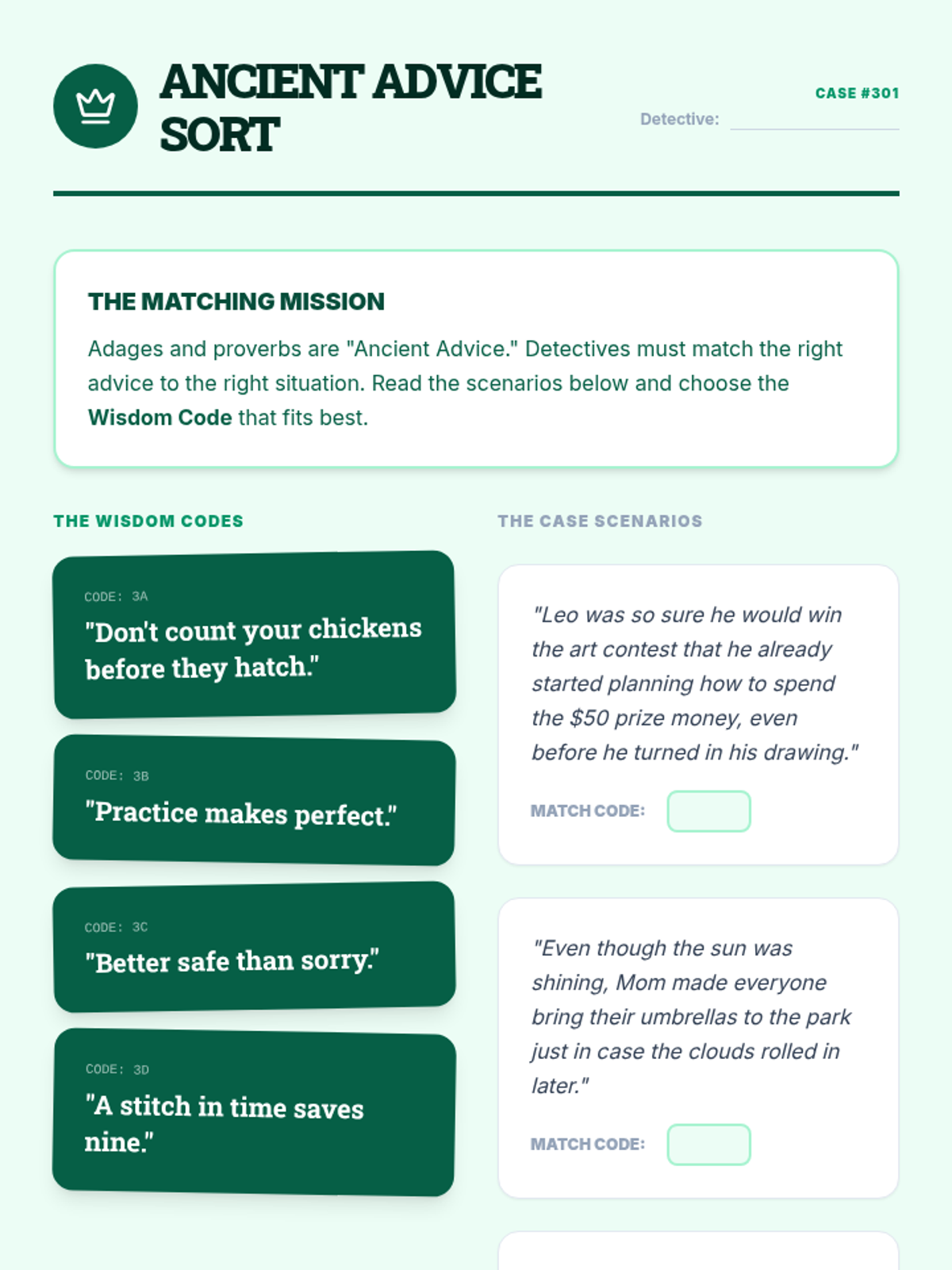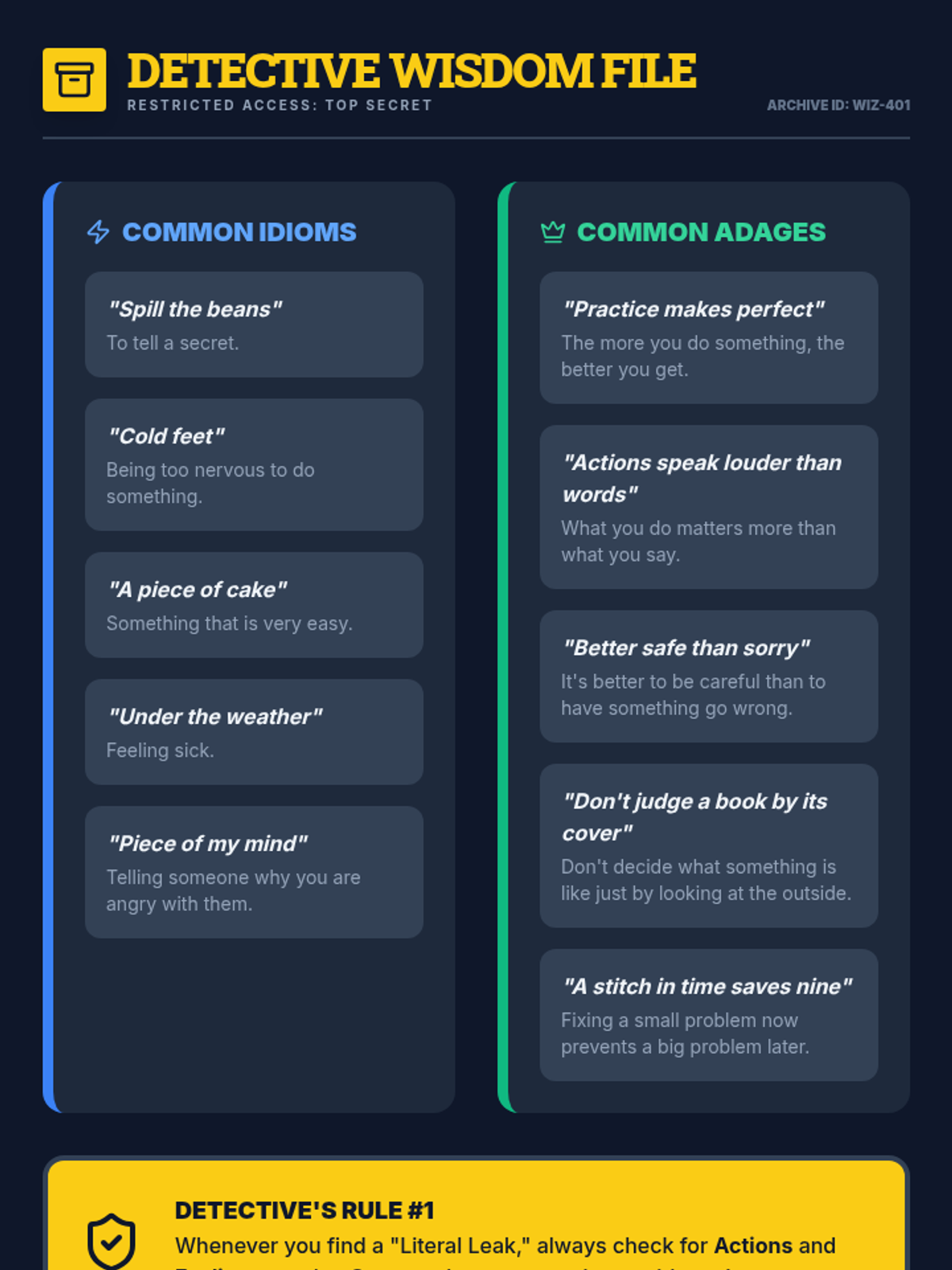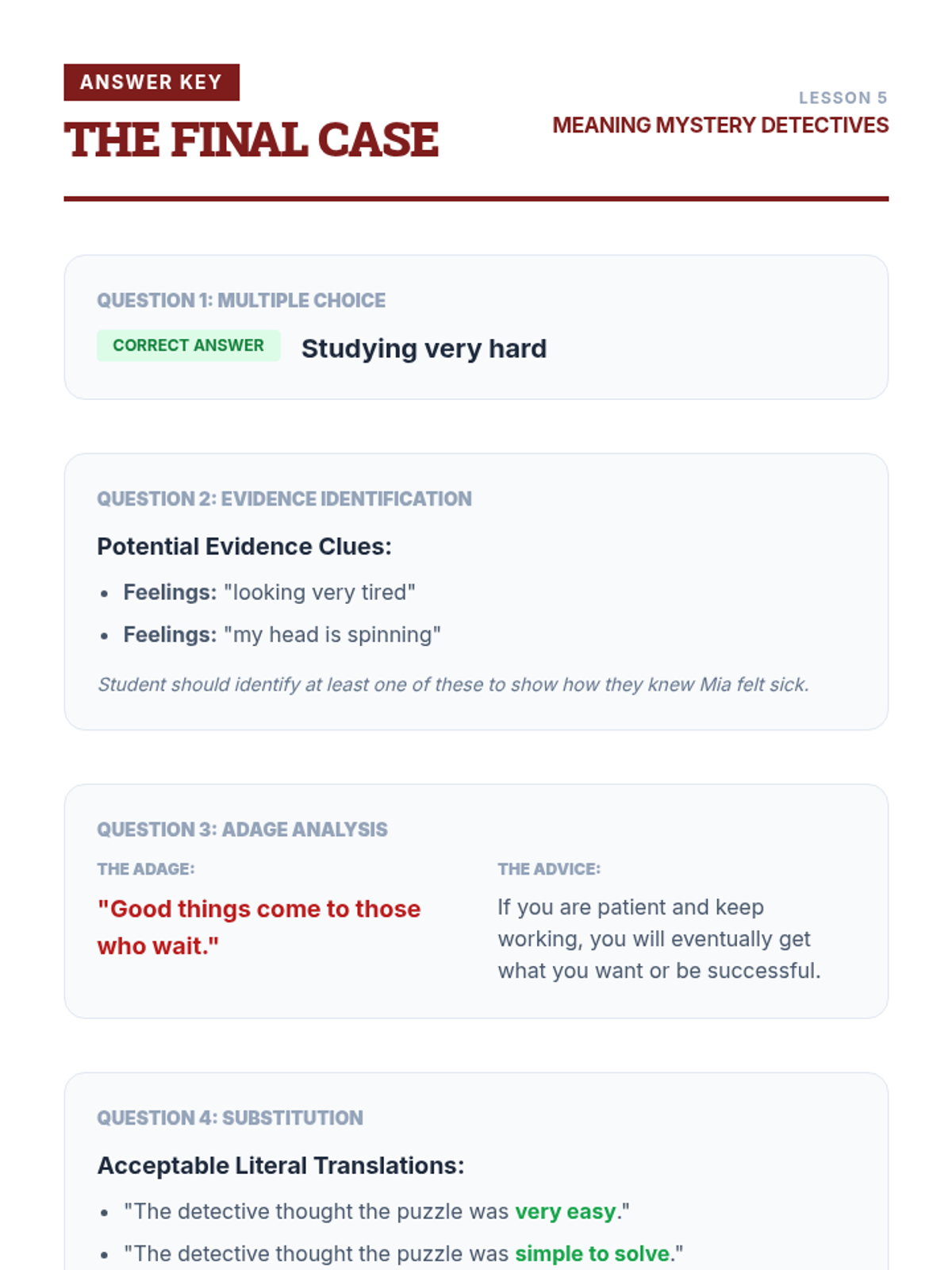 A 3rd-grade ELA sequence where students become 'Meaning Detectives' to decode idioms and adages using context clues. Through detective-themed activities, they move from identifying confusion points to applying wisdom from adages in real-world scenarios.