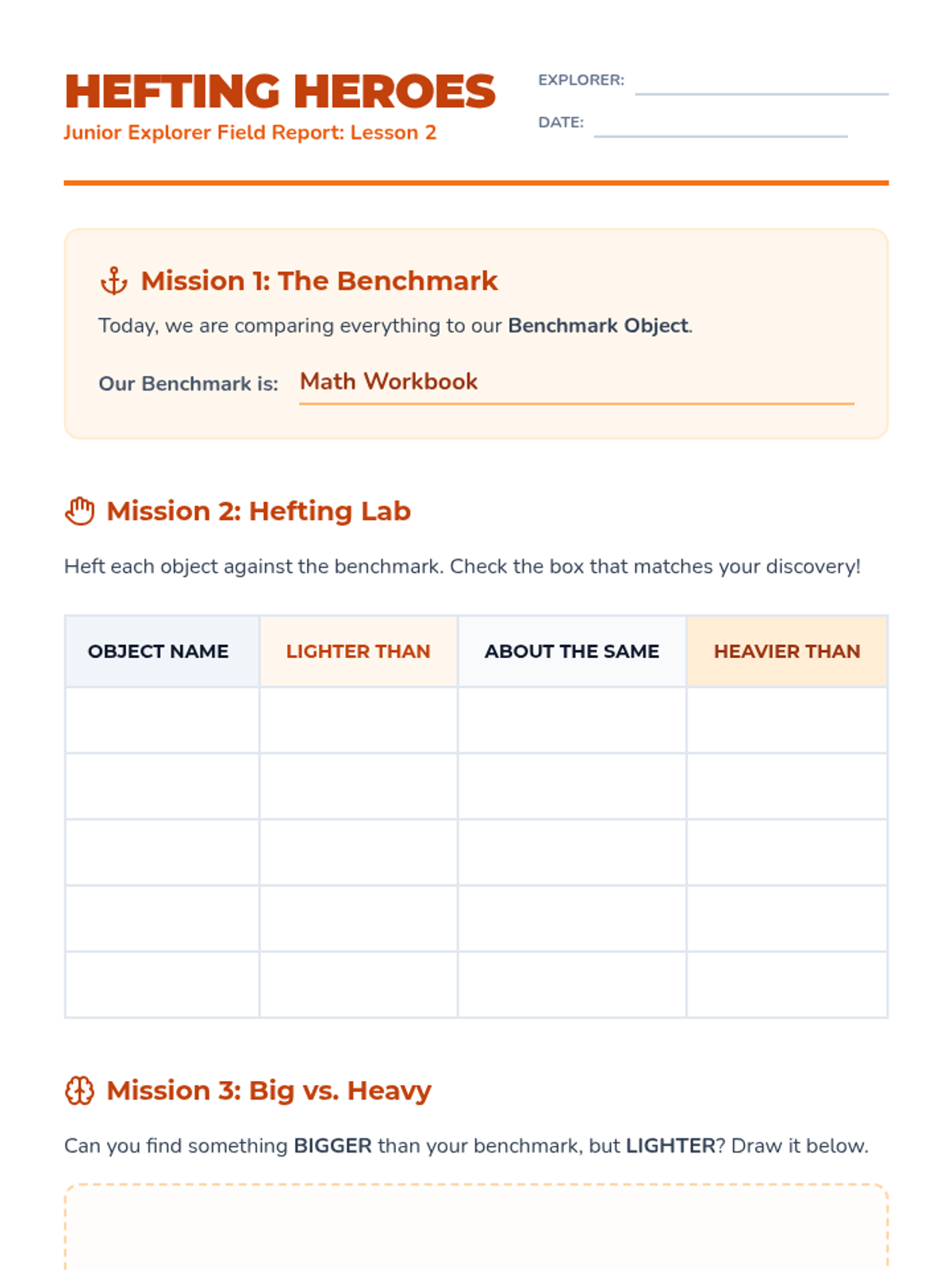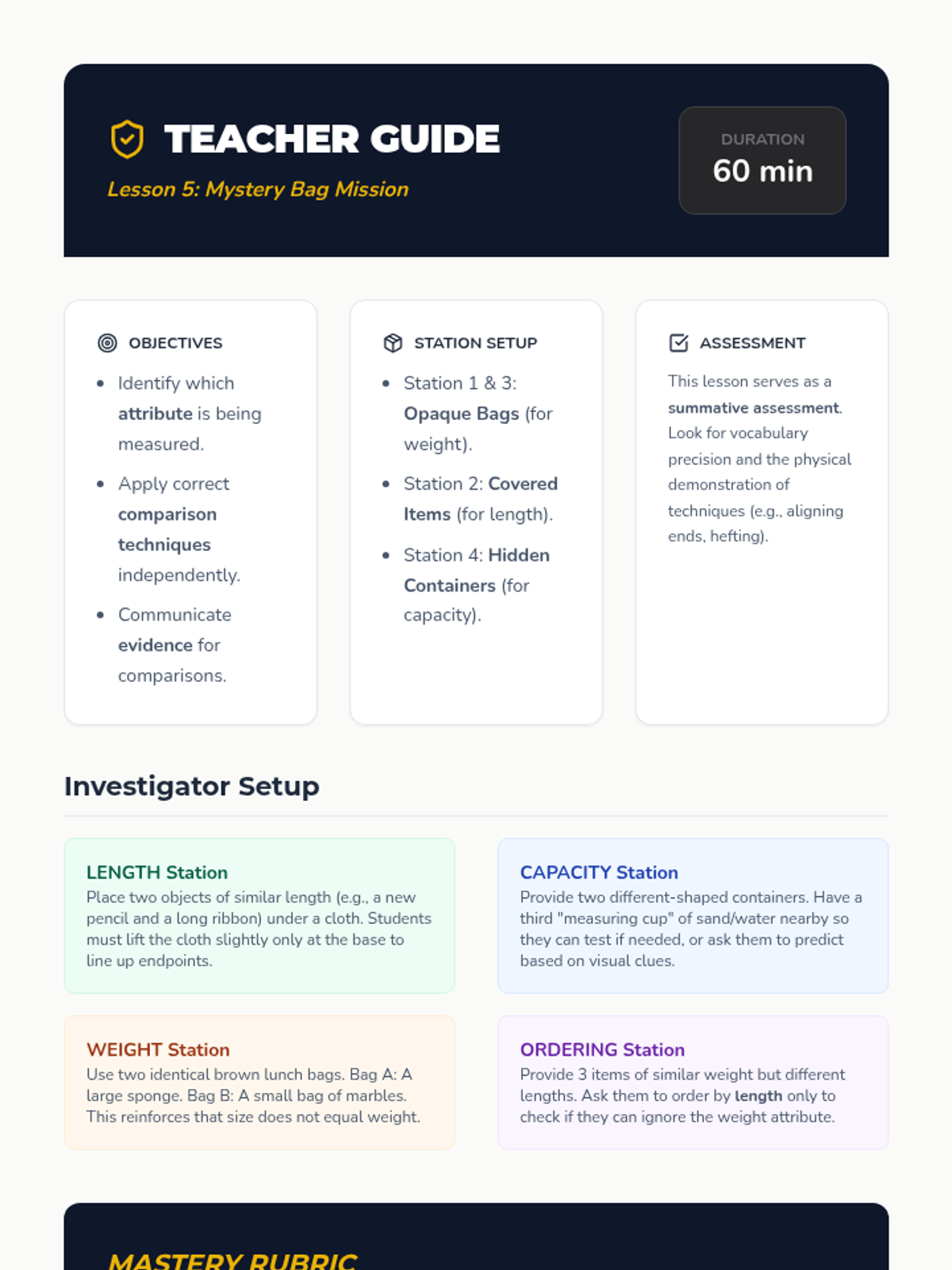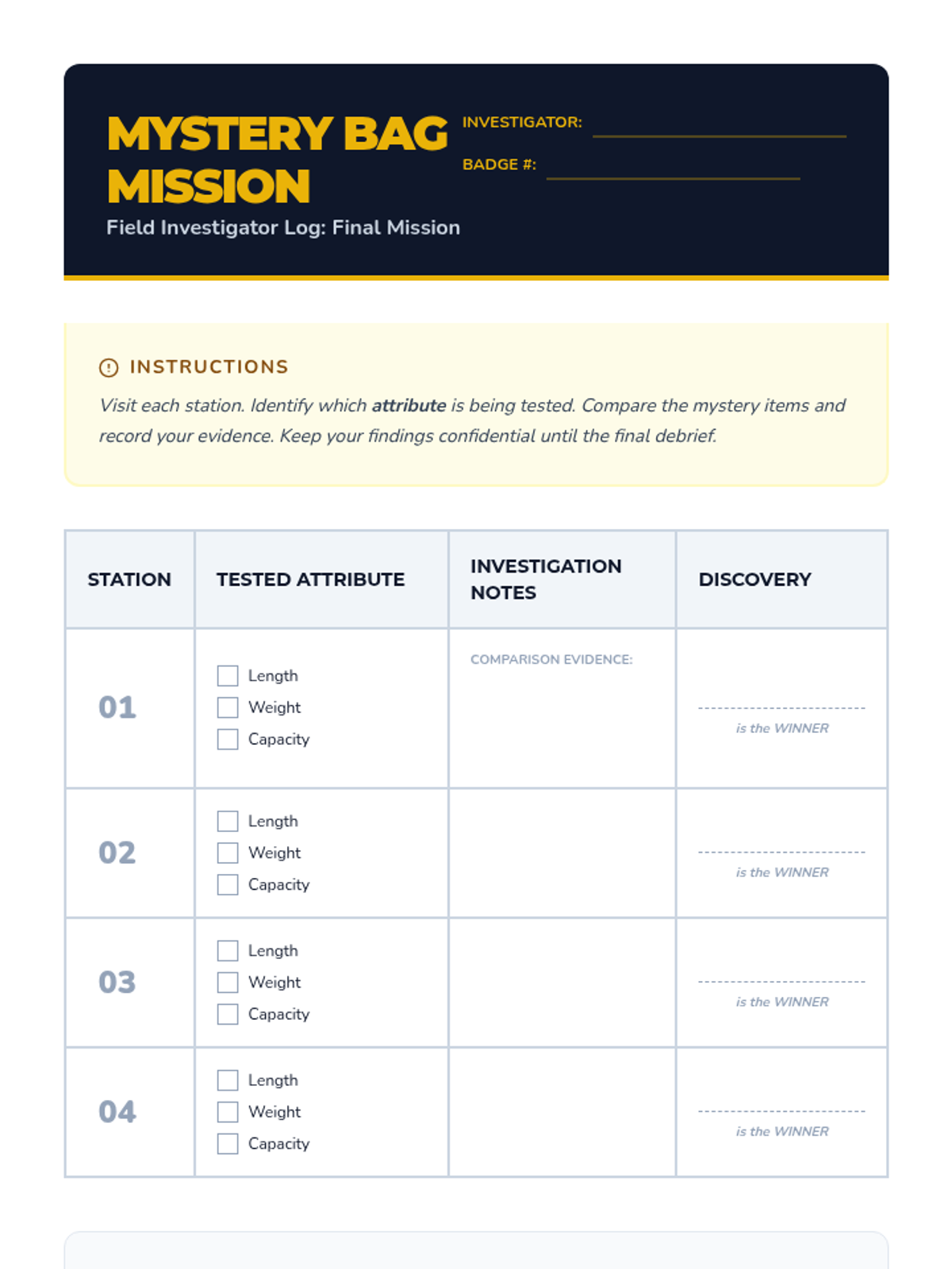A hands-on exploration of length, weight, and capacity for 2nd graders, focusing on direct comparison and foundational measurement vocabulary. Students use sensory estimation and physical manipulation to understand how objects differ in size and mass.