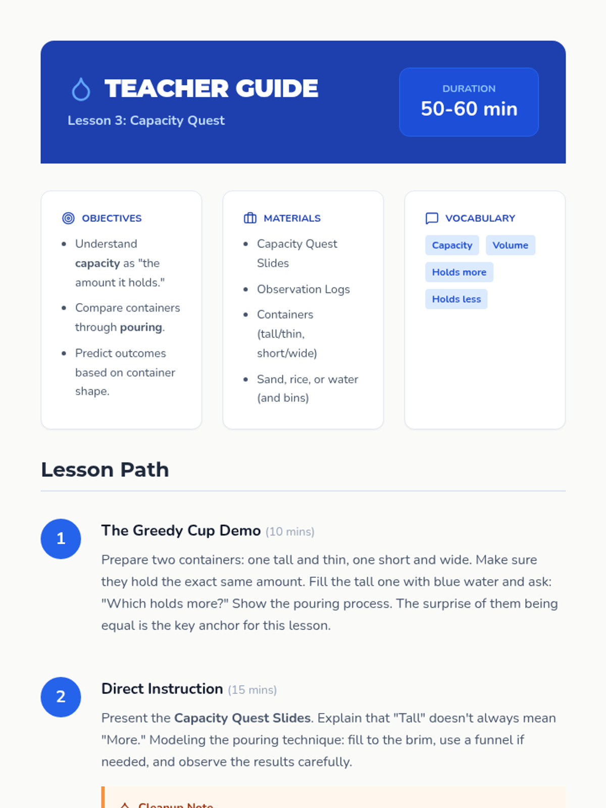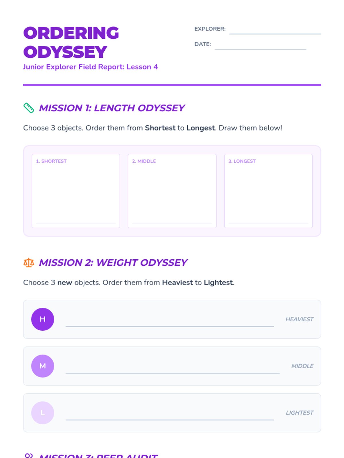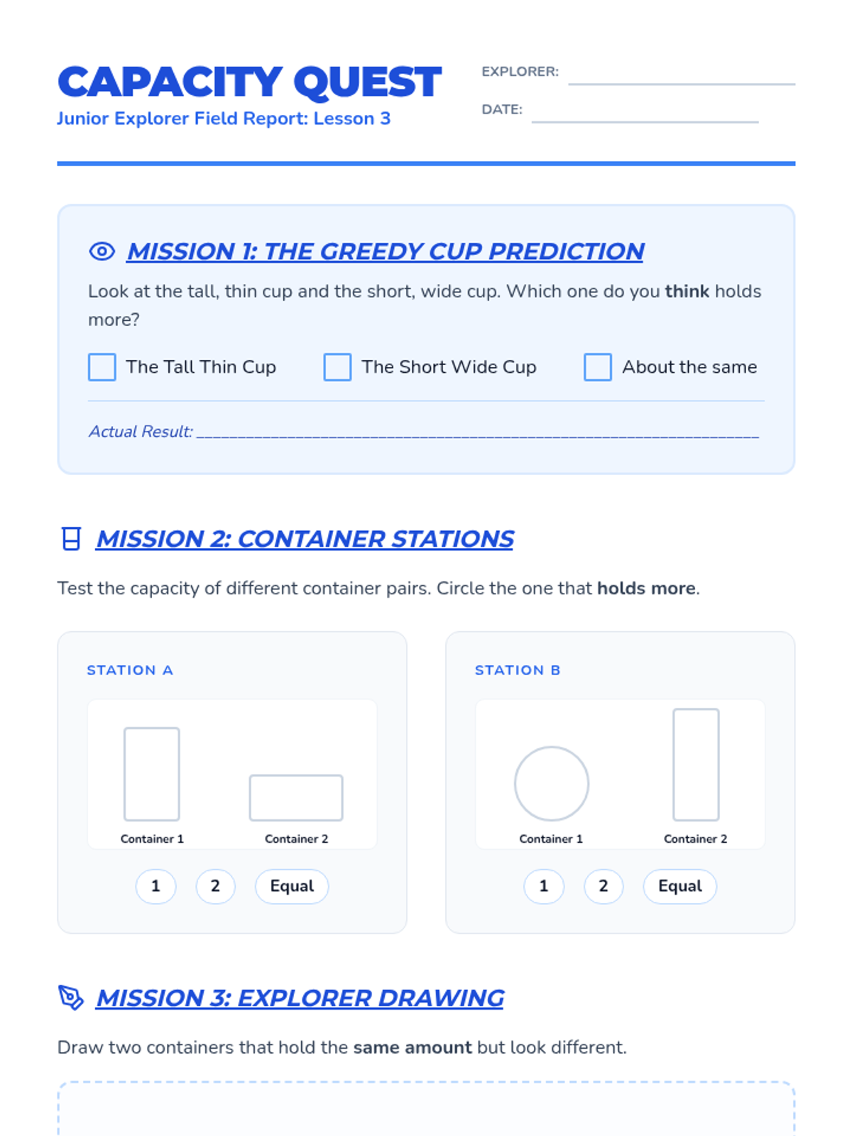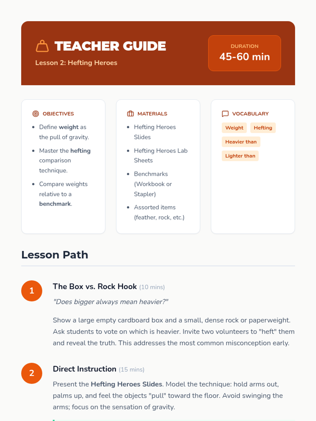 A hands-on exploration of length, weight, and capacity for 2nd graders, focusing on direct comparison and foundational measurement vocabulary. Students use sensory estimation and physical manipulation to understand how objects differ in size and mass.