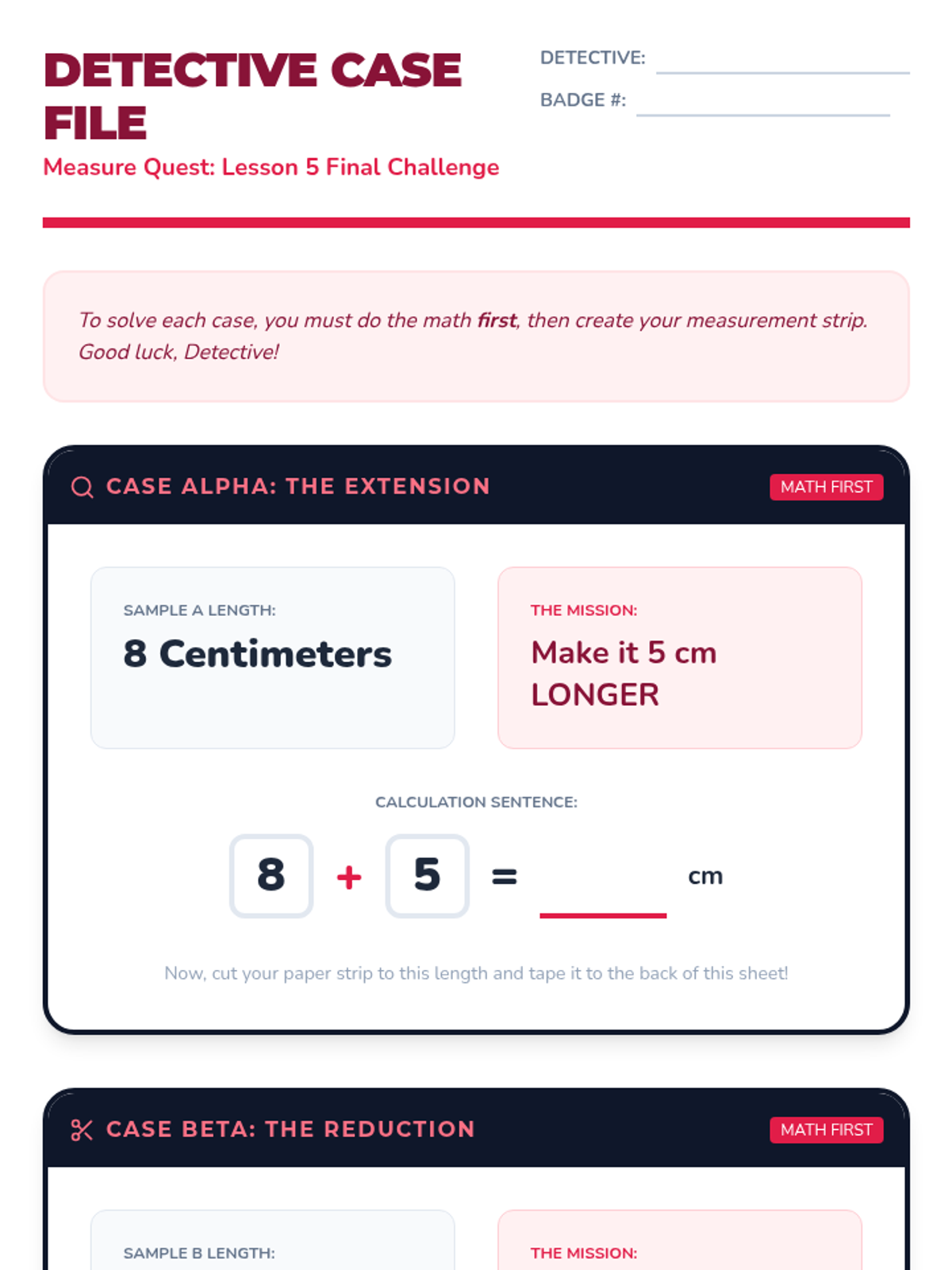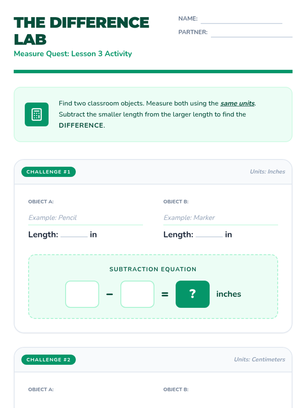 A hands-on sequence for 2nd graders focusing on estimation benchmarks, comparative measurement, and calculating length differences using subtraction. Students move from intuitive guessing to precise mathematical comparisons.