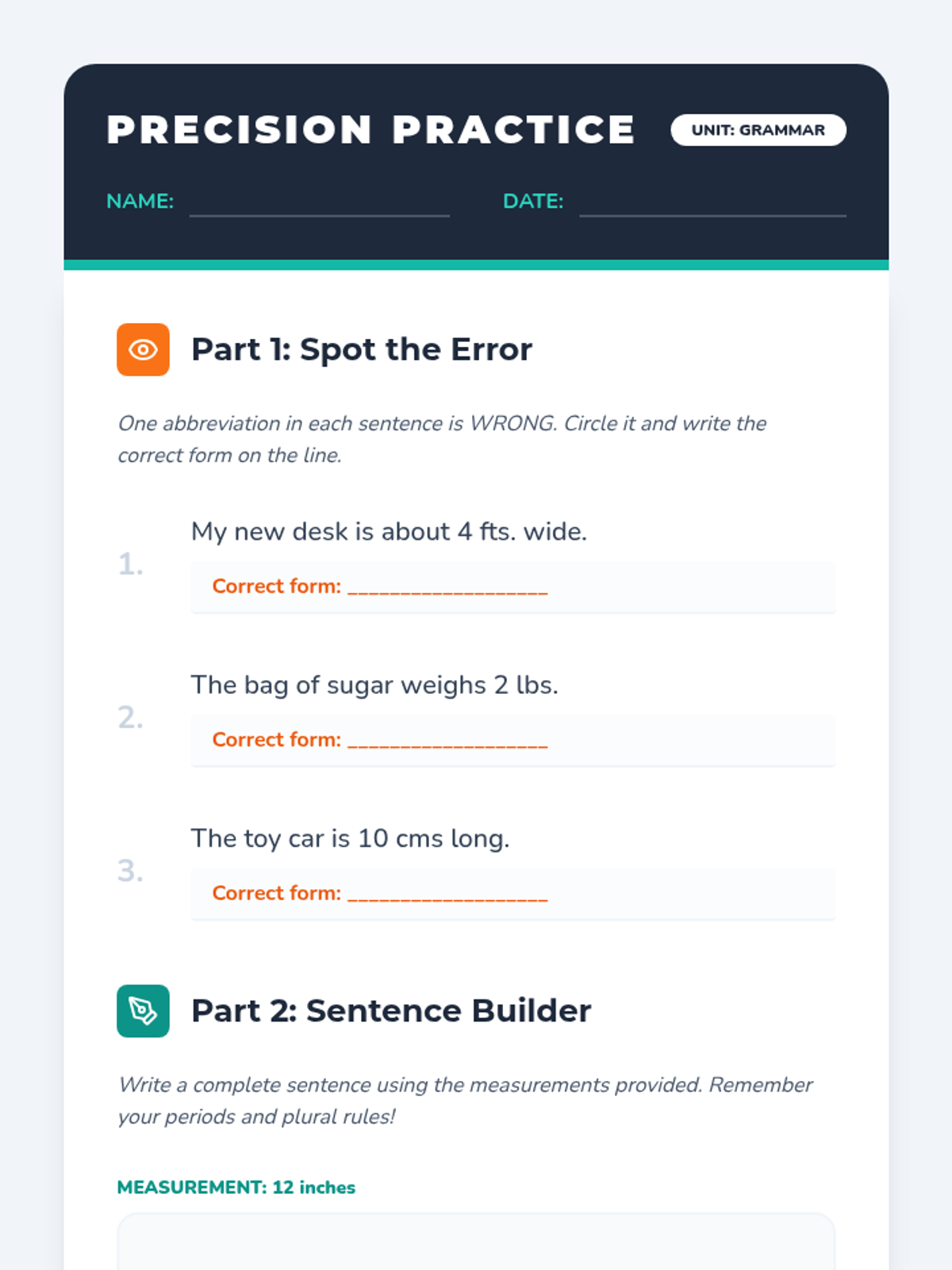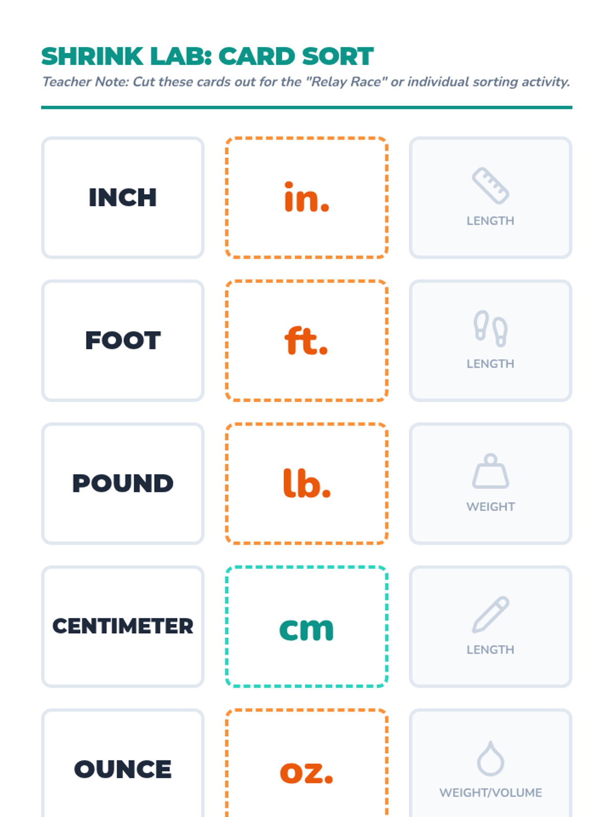 A 2nd-grade inquiry-based sequence exploring measurement abbreviations through the lens of 'The Shrink Lab.' Students investigate why and how we shorten measurement words in real-world contexts like recipes and blueprints.