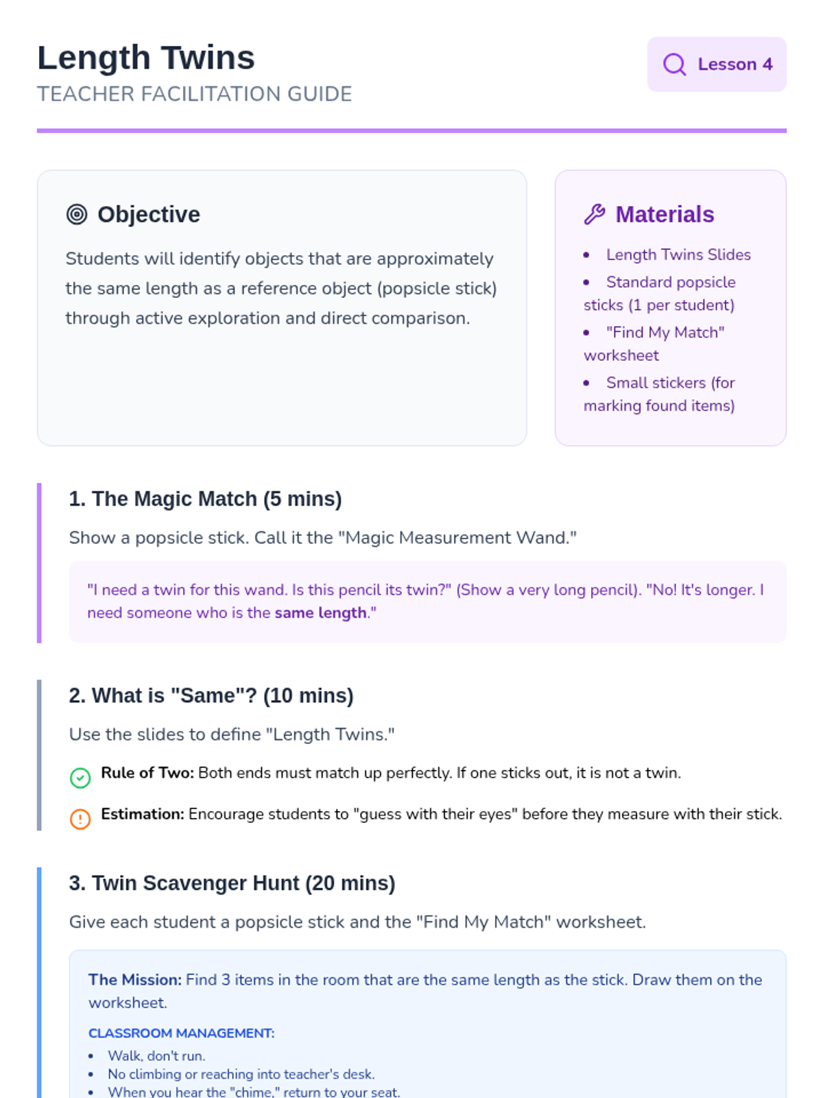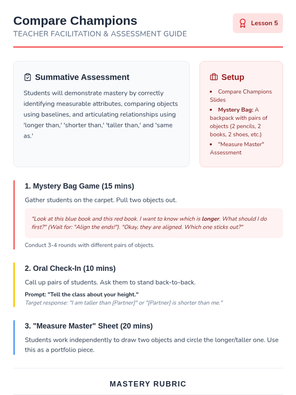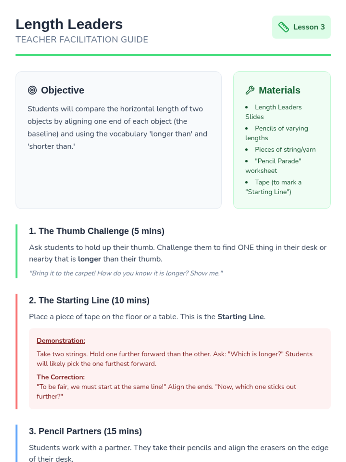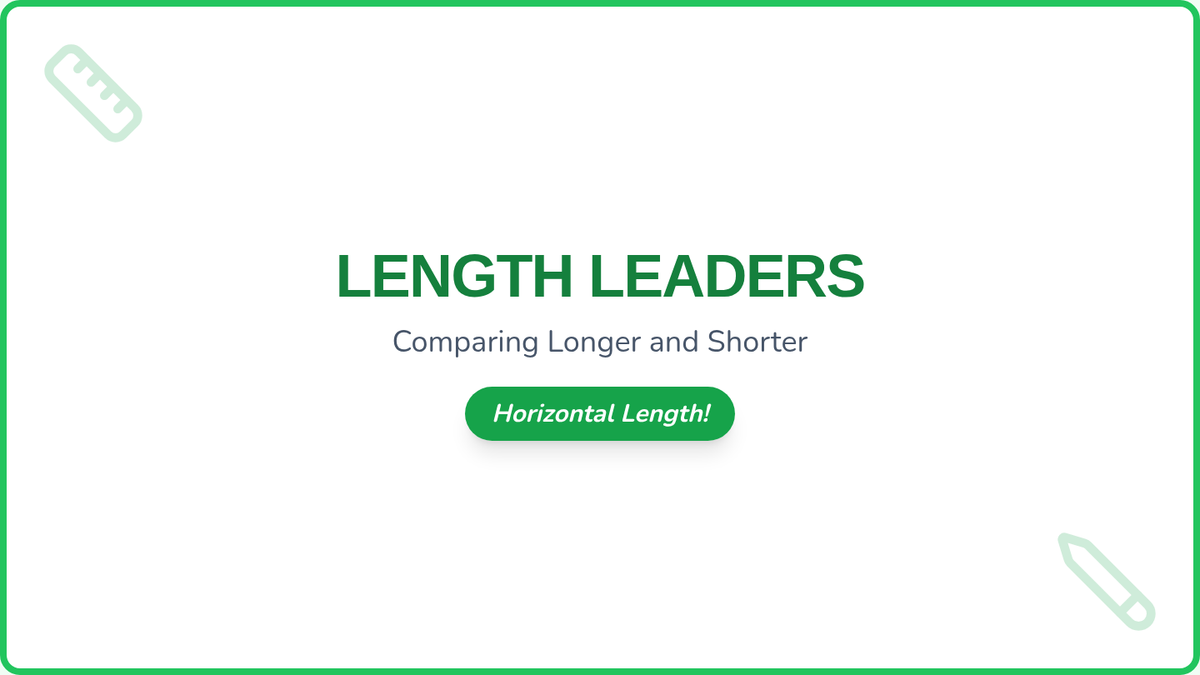 A foundational introduction to measurement for Kindergarten students, focusing on identifying measurable attributes and using direct comparison vocabulary like 'longer,' 'shorter,' 'taller,' and 'same.' Students will move from understanding what can be measured to accurately comparing objects using a common baseline.
