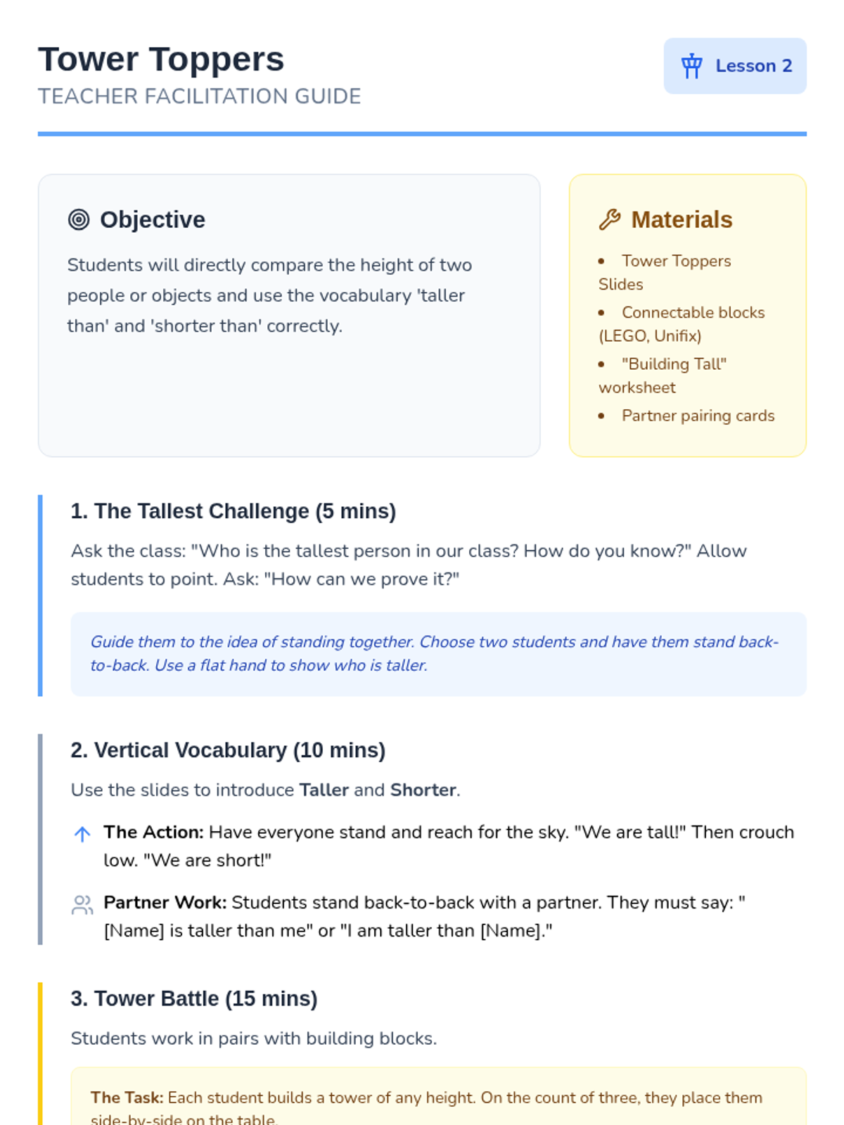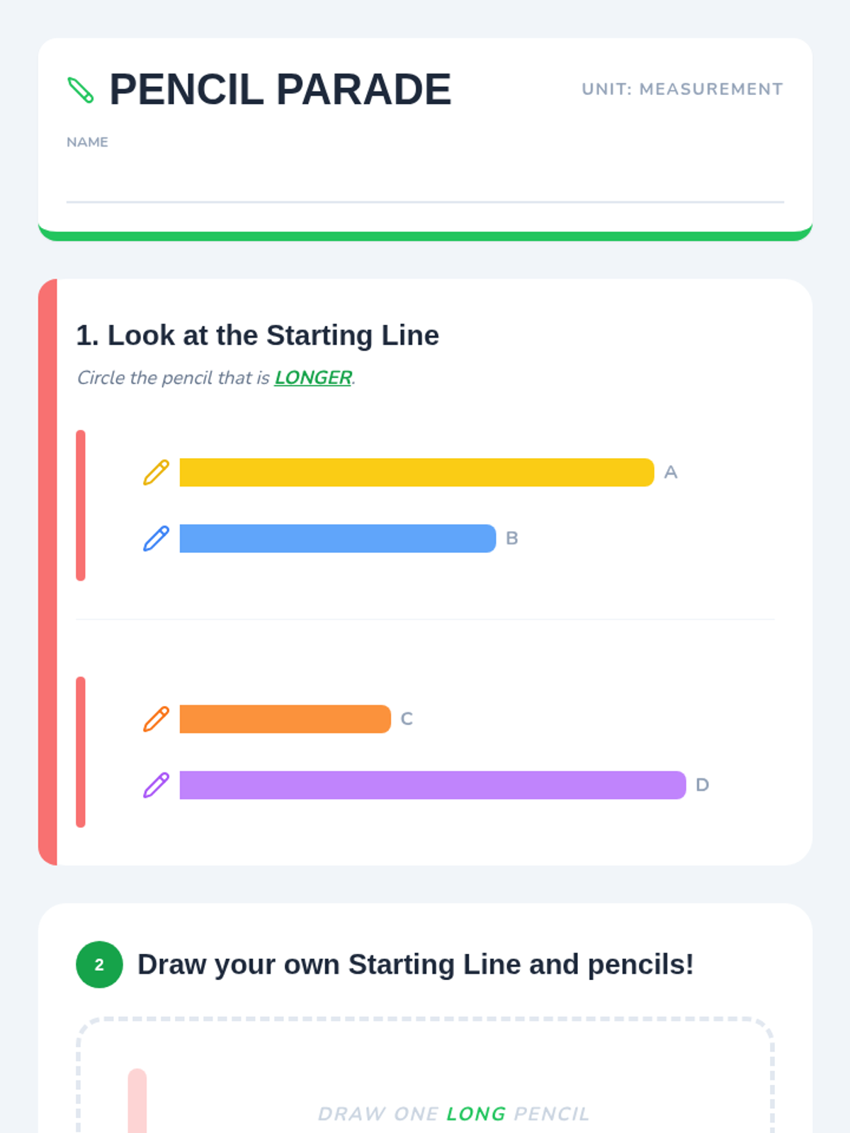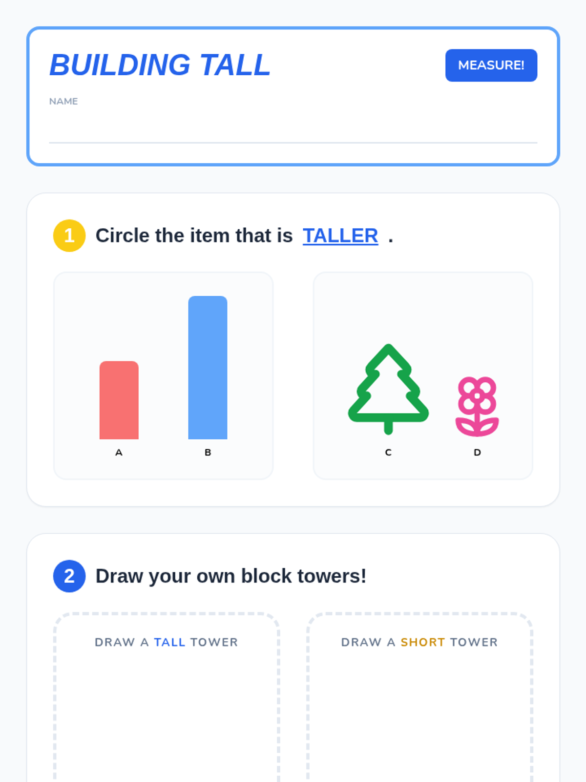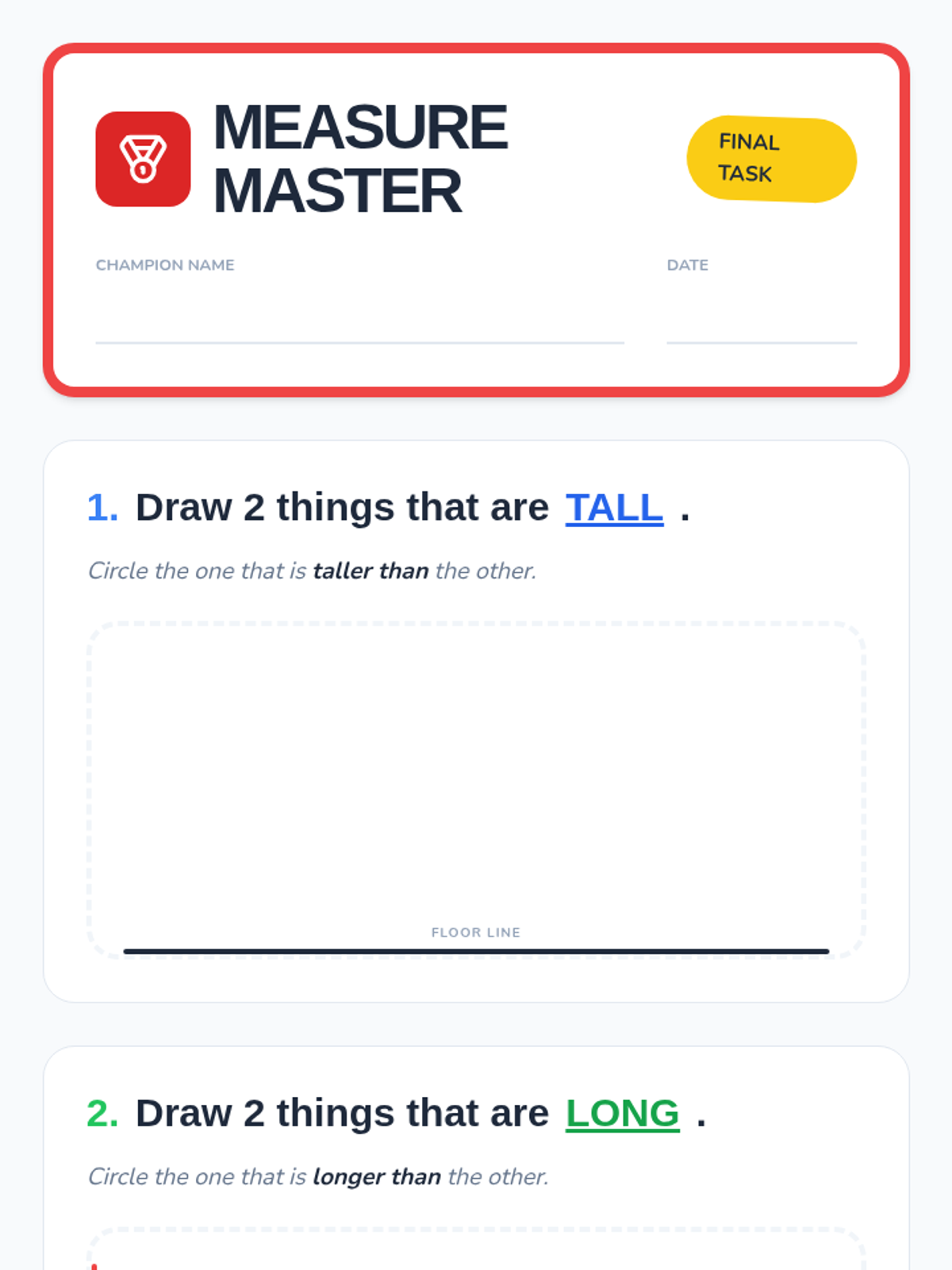 A foundational introduction to measurement for Kindergarten students, focusing on identifying measurable attributes and using direct comparison vocabulary like 'longer,' 'shorter,' 'taller,' and 'same.' Students will move from understanding what can be measured to accurately comparing objects using a common baseline.