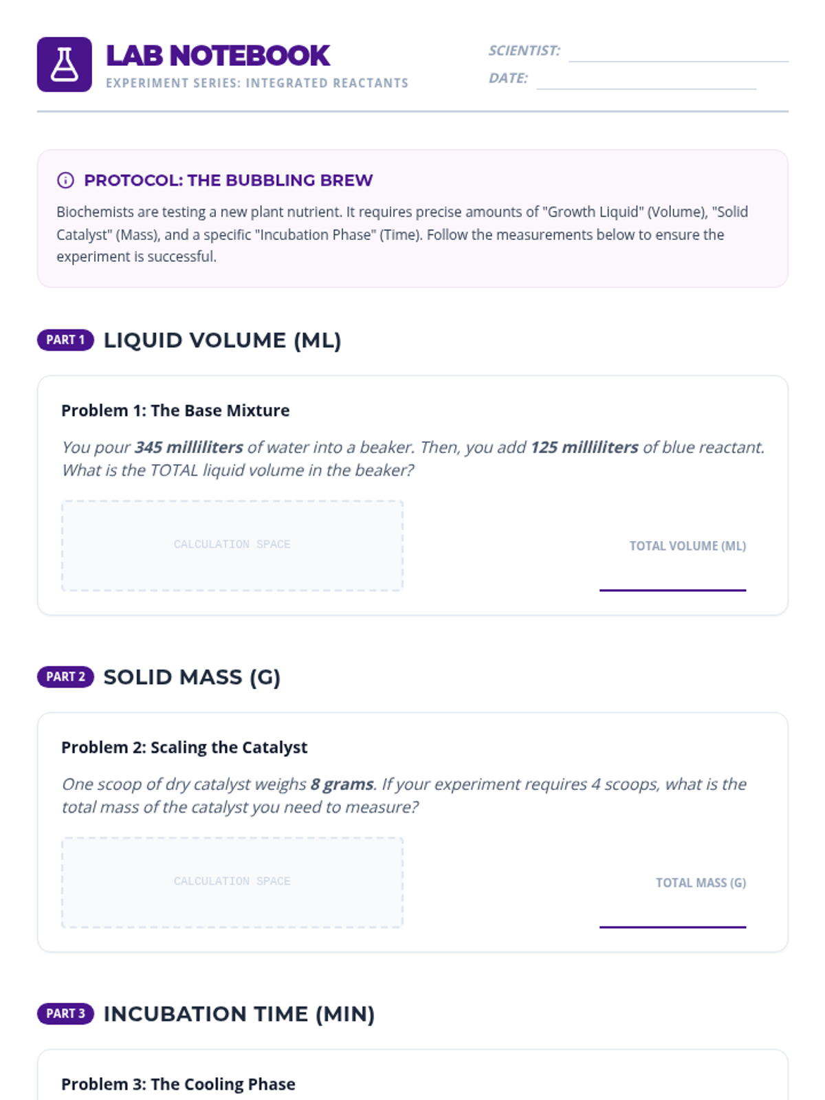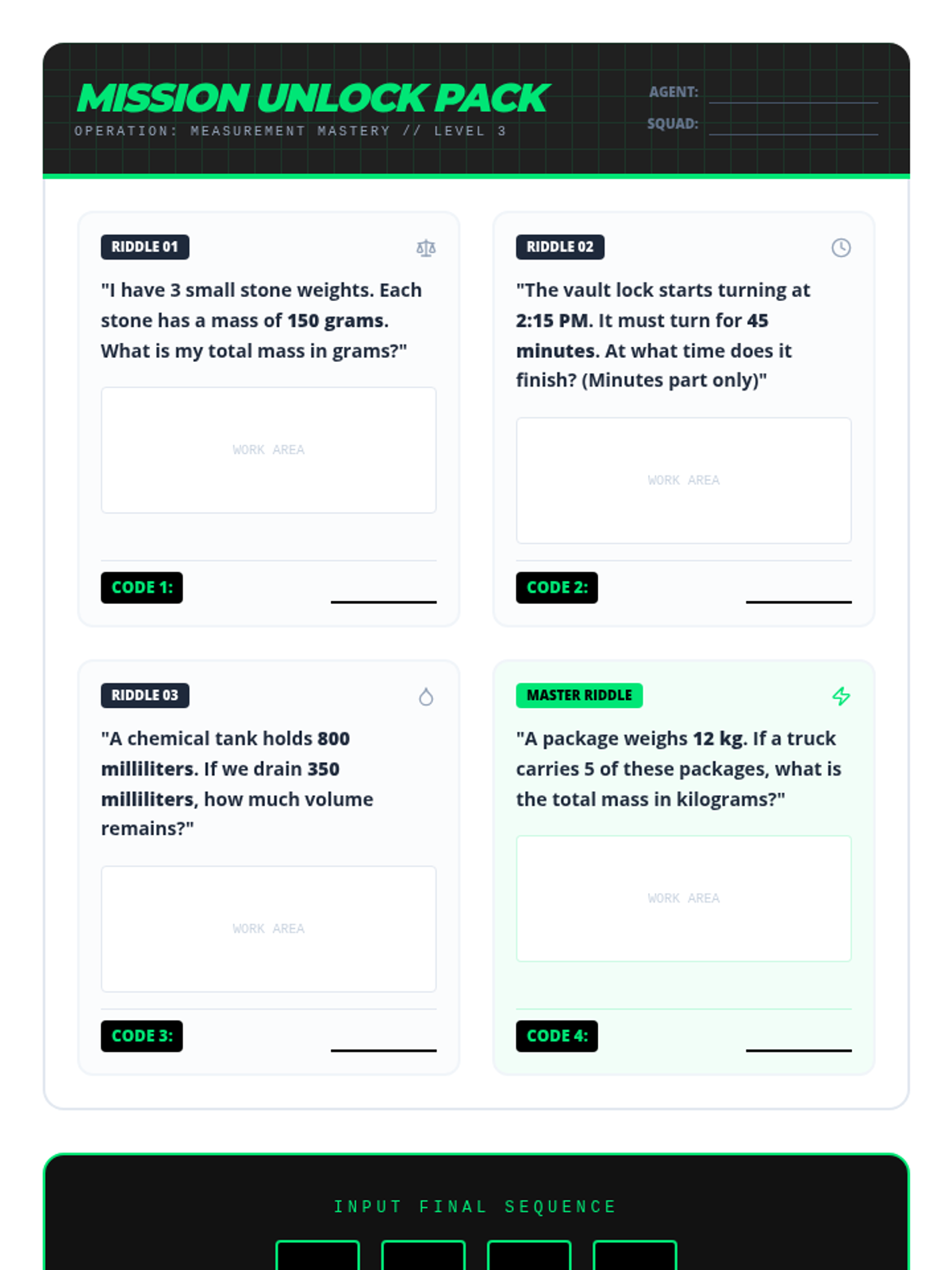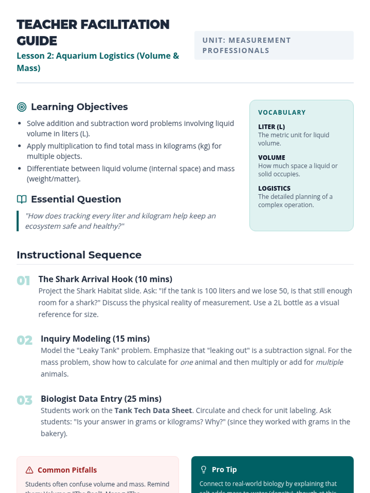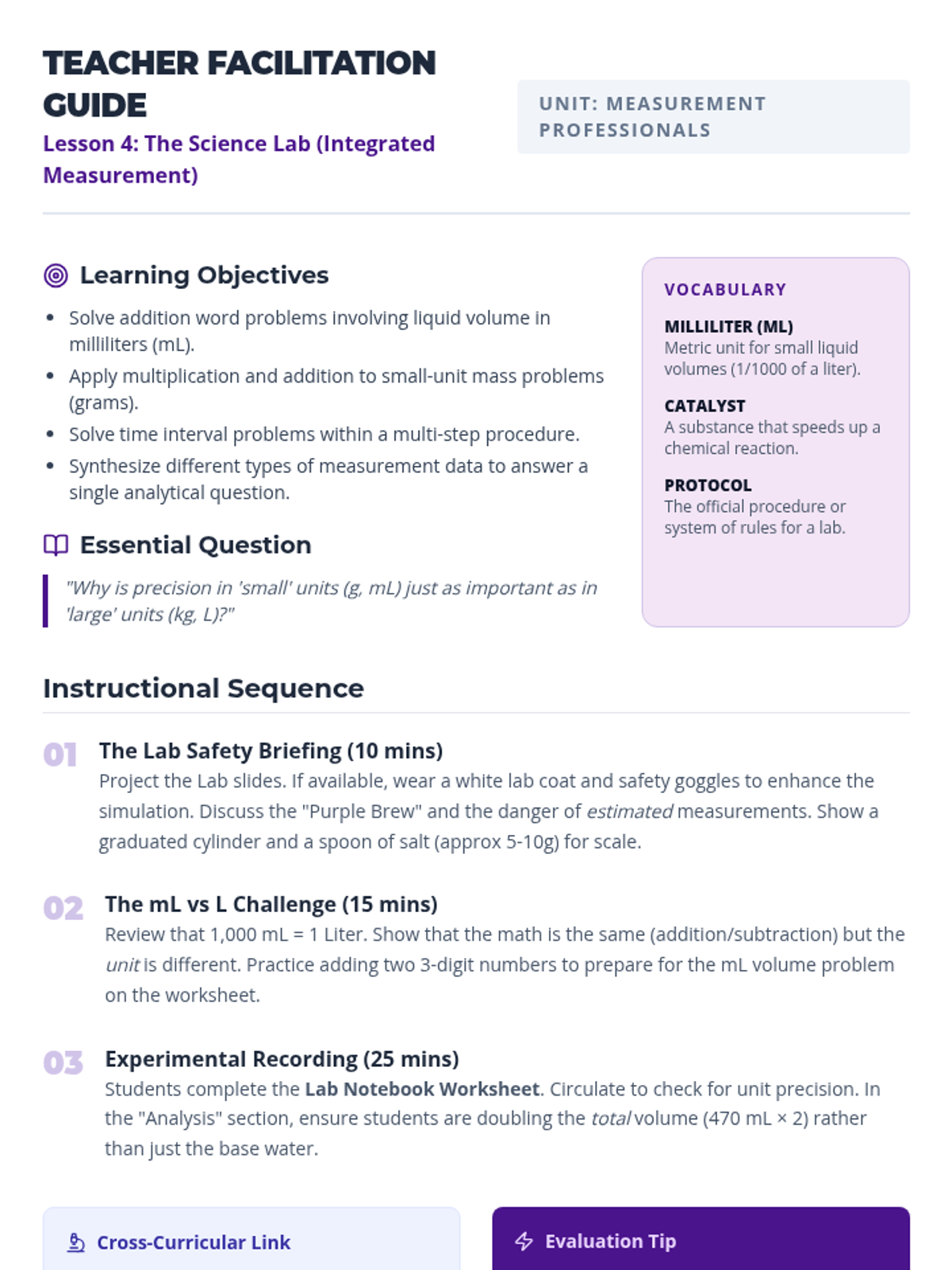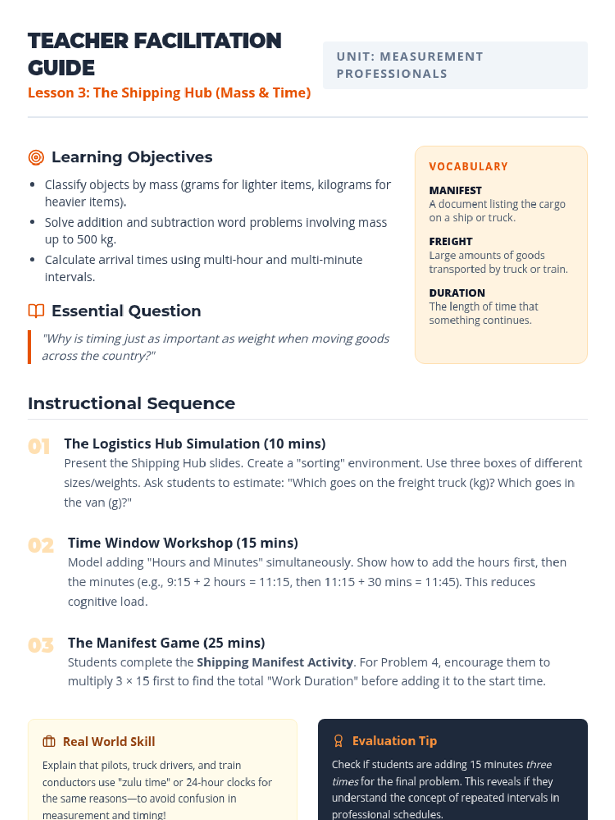 An integrated 3rd-grade sequence focused on solving real-world word problems involving time, liquid volume, and mass. Students act as professionals in various fields, applying measurement concepts to complex scenarios and simulations.