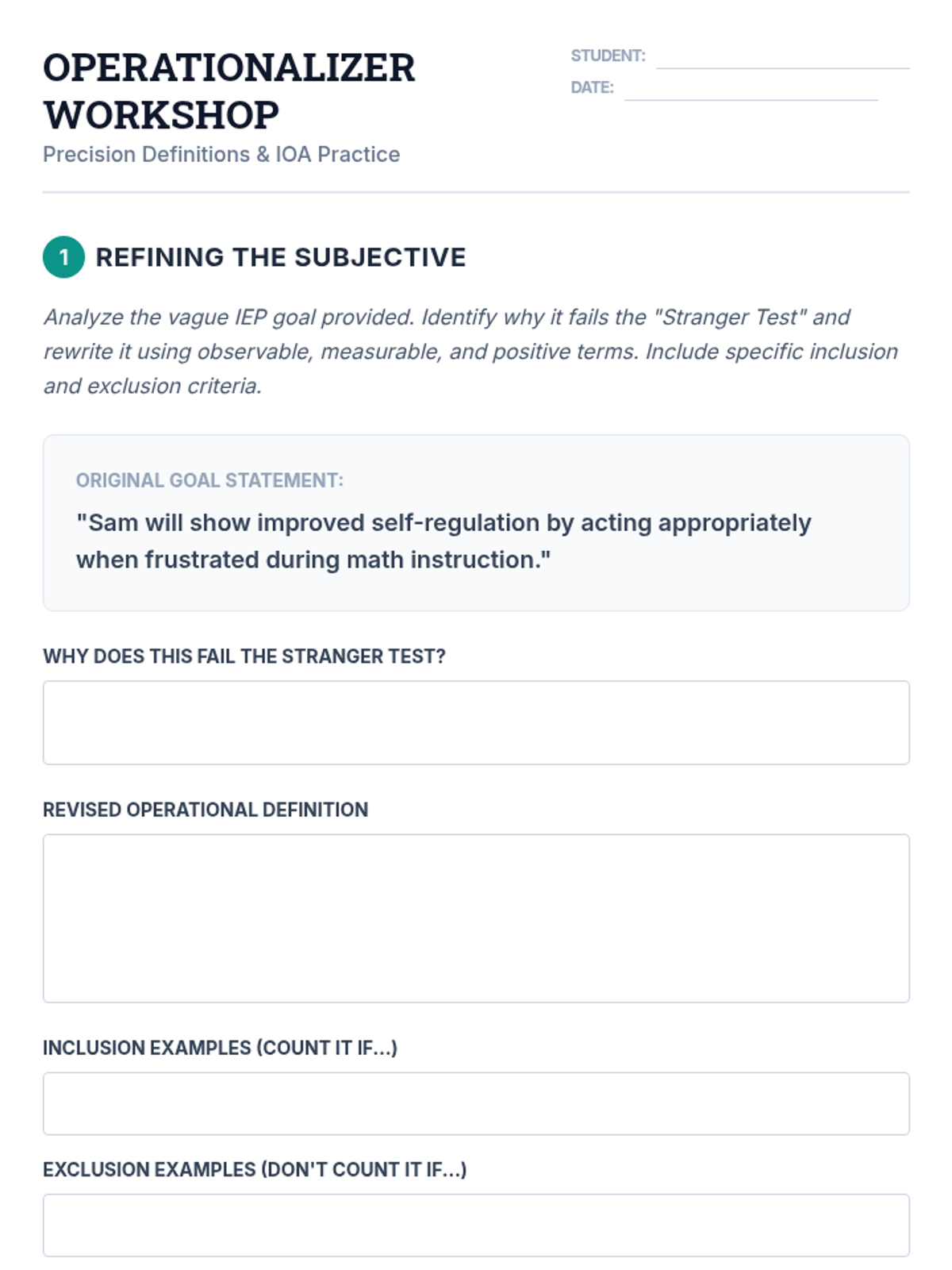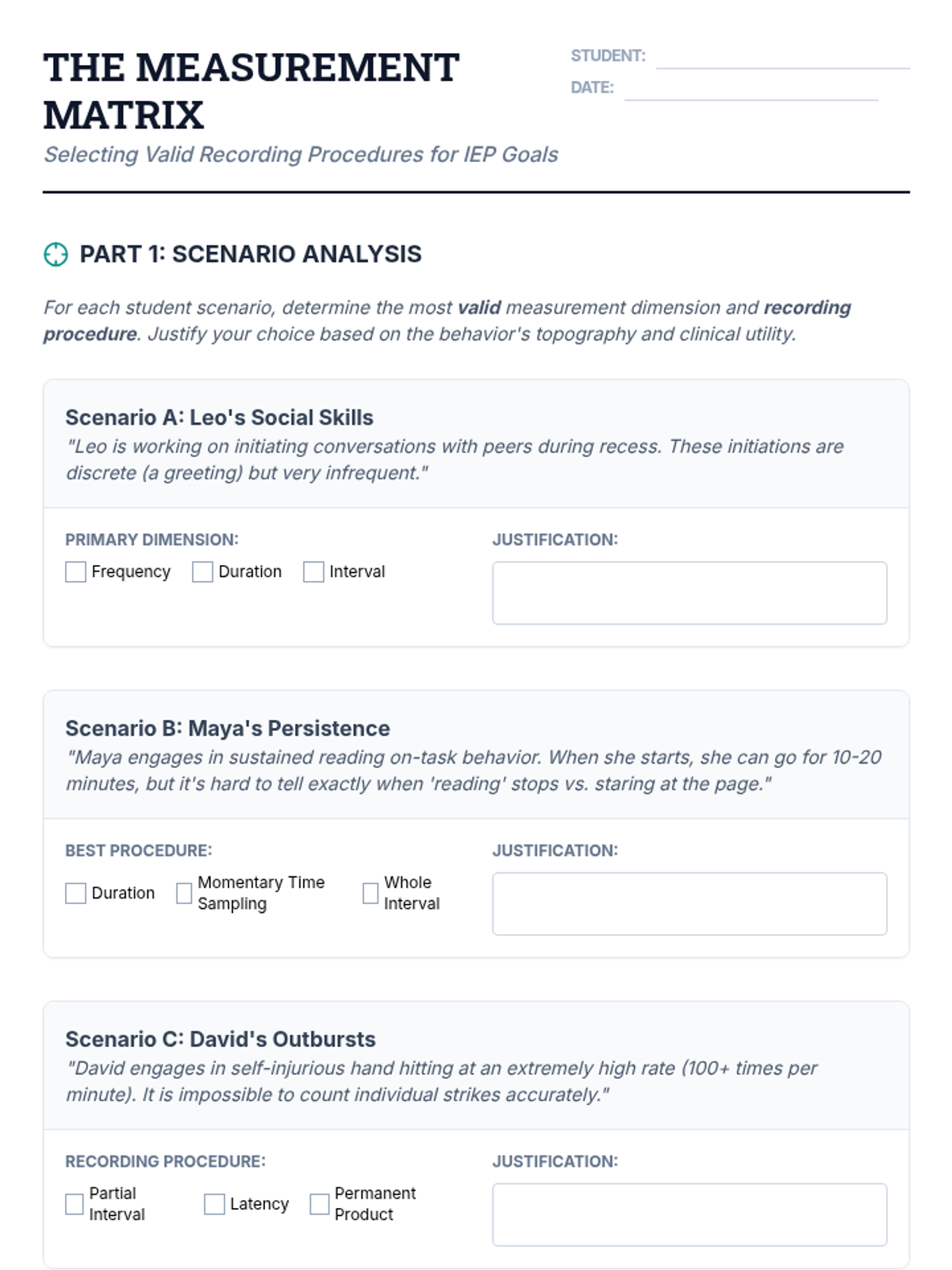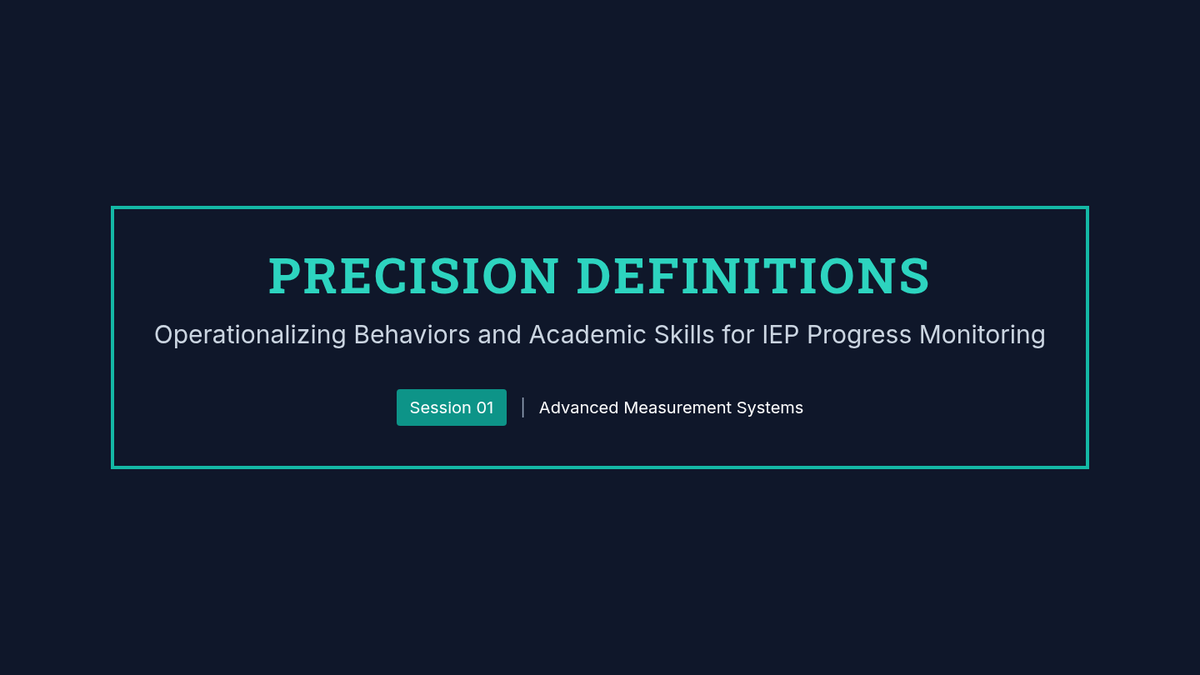 A comprehensive graduate-level sequence on designing valid measurement systems for behavioral and academic IEP goals, covering operationalization, measurement dimensions, graphing, visual analysis, and data-based individualization.
