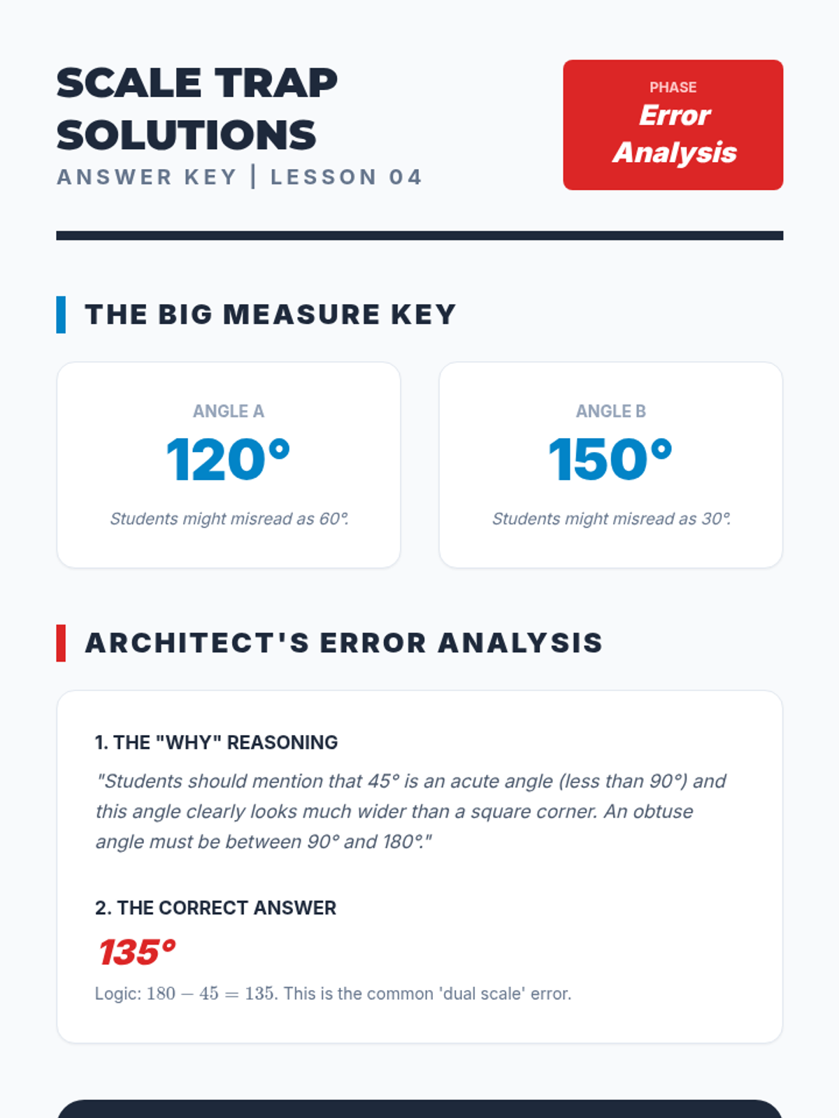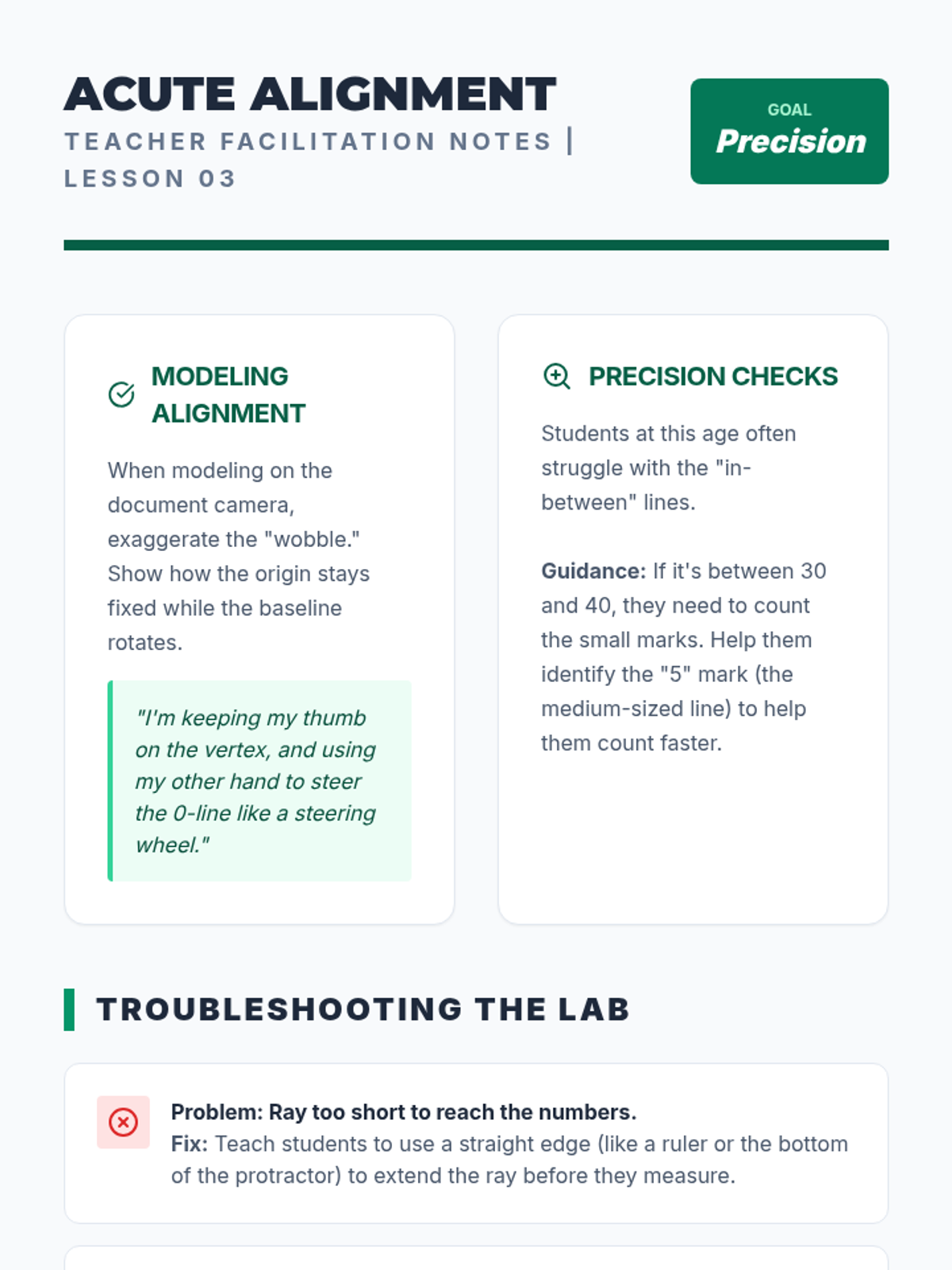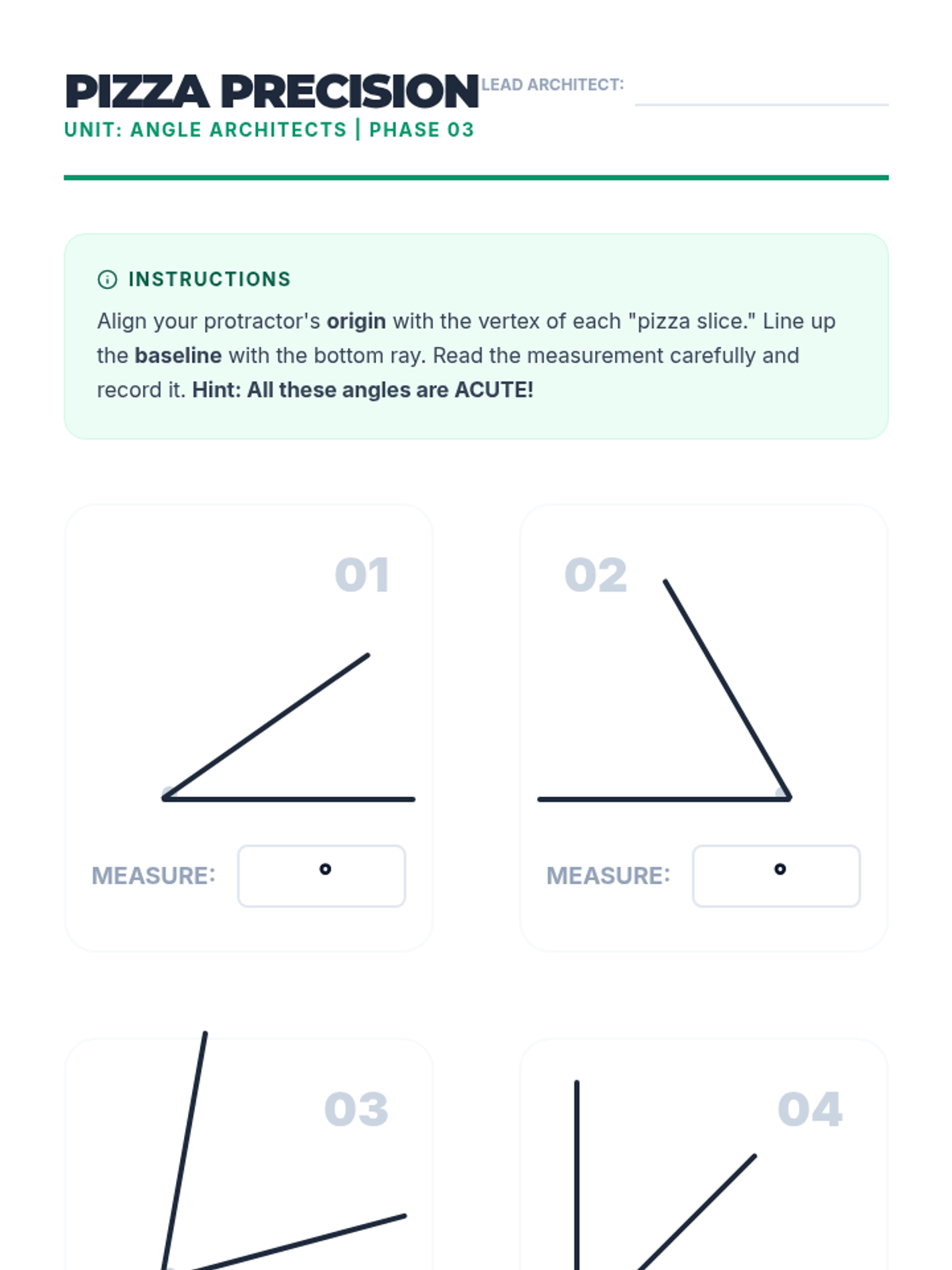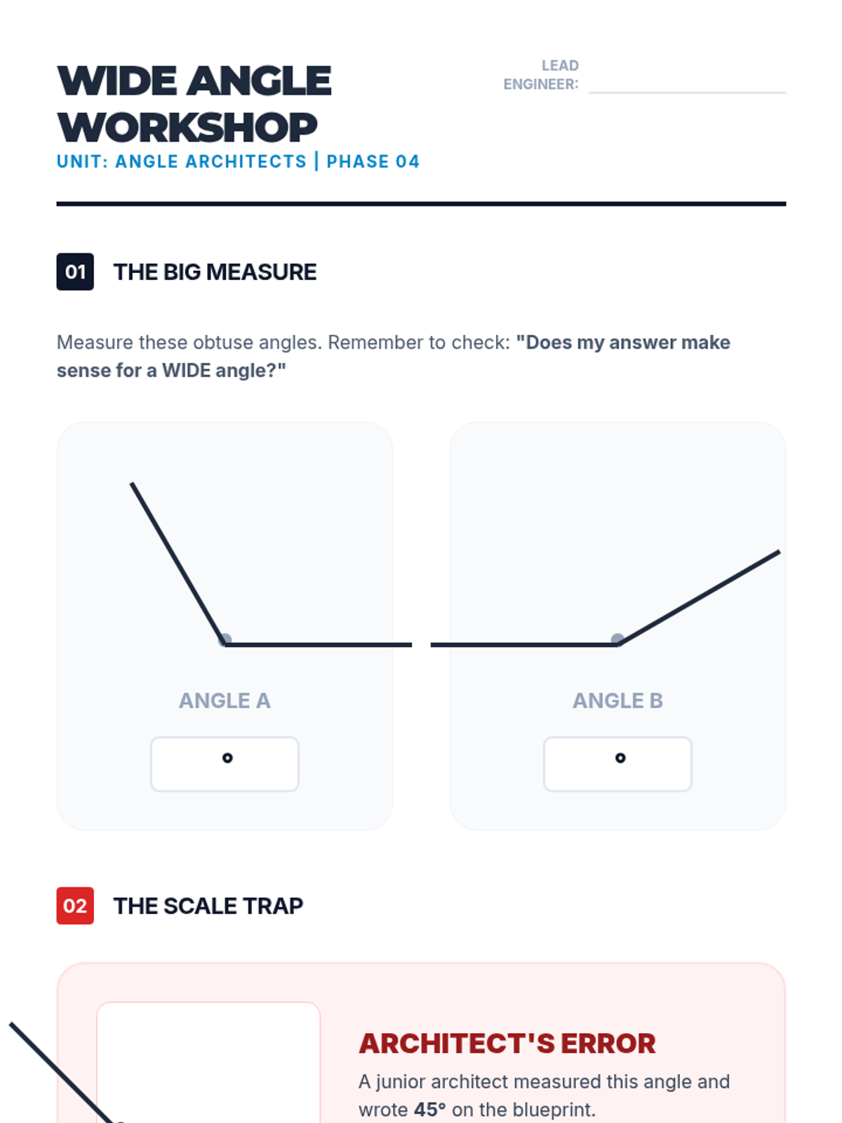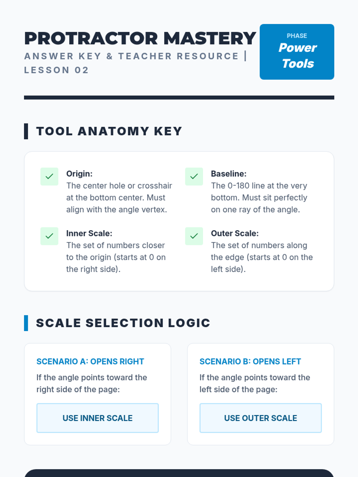 This workshop-style sequence transitions students from visual estimation to precise measurement using a protractor. Students learn the logic behind the 360-degree circle and how to align a protractor correctly to read measurements.