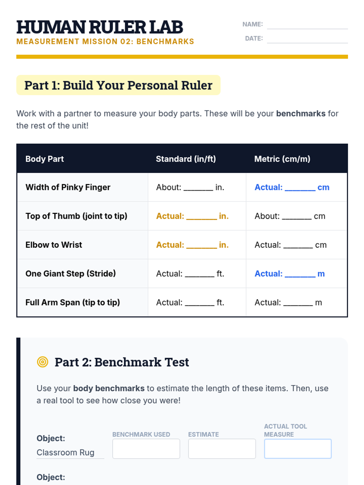 A 3rd-grade math unit focused on transitioning from small-scale measurements to large-scale estimation and measurement using metric and customary units. Students develop personal benchmarks, select appropriate tools, and complete a classroom mapping project.