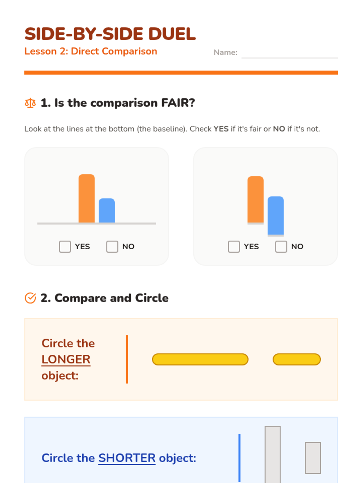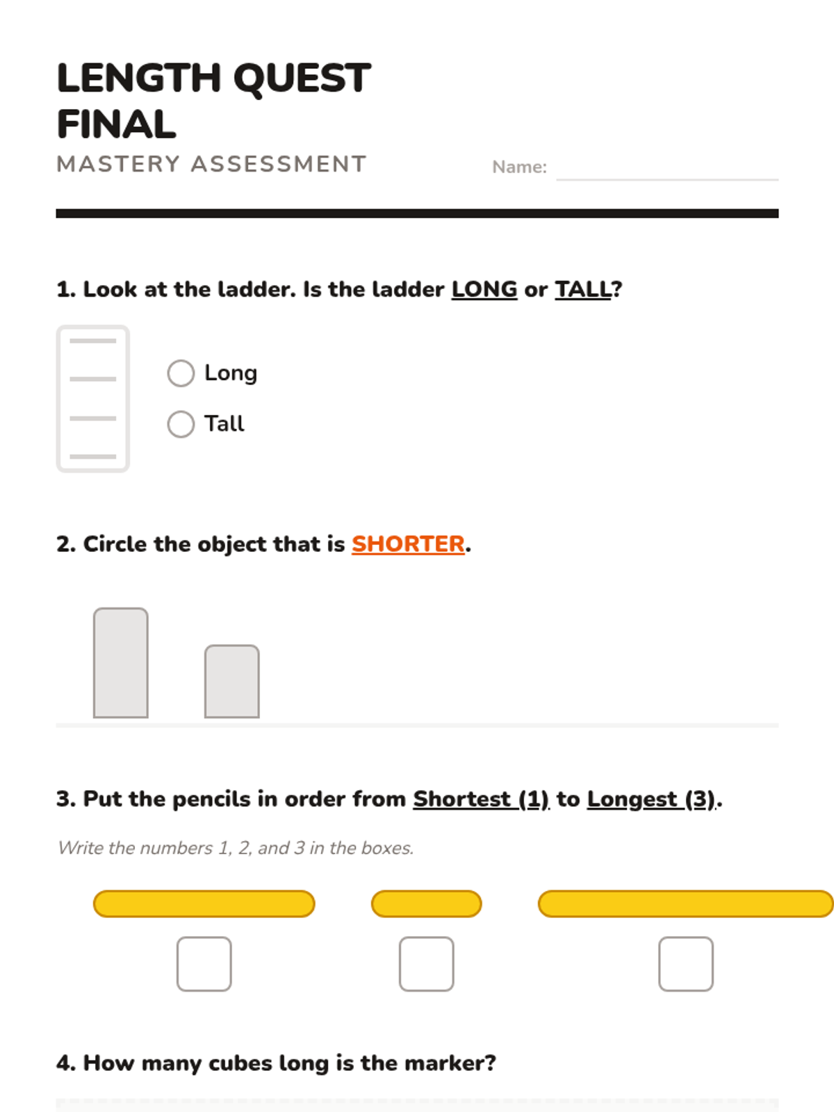 A foundational sequence for first-grade students to explore length and height through direct comparison, ordering, and non-standard measurement units. Students progress from using descriptive vocabulary to quantifying length with uniform tools.