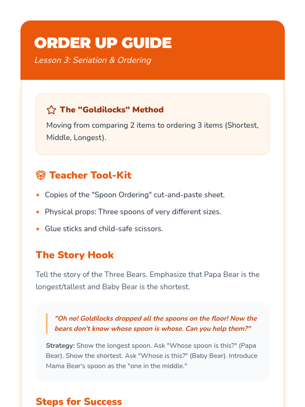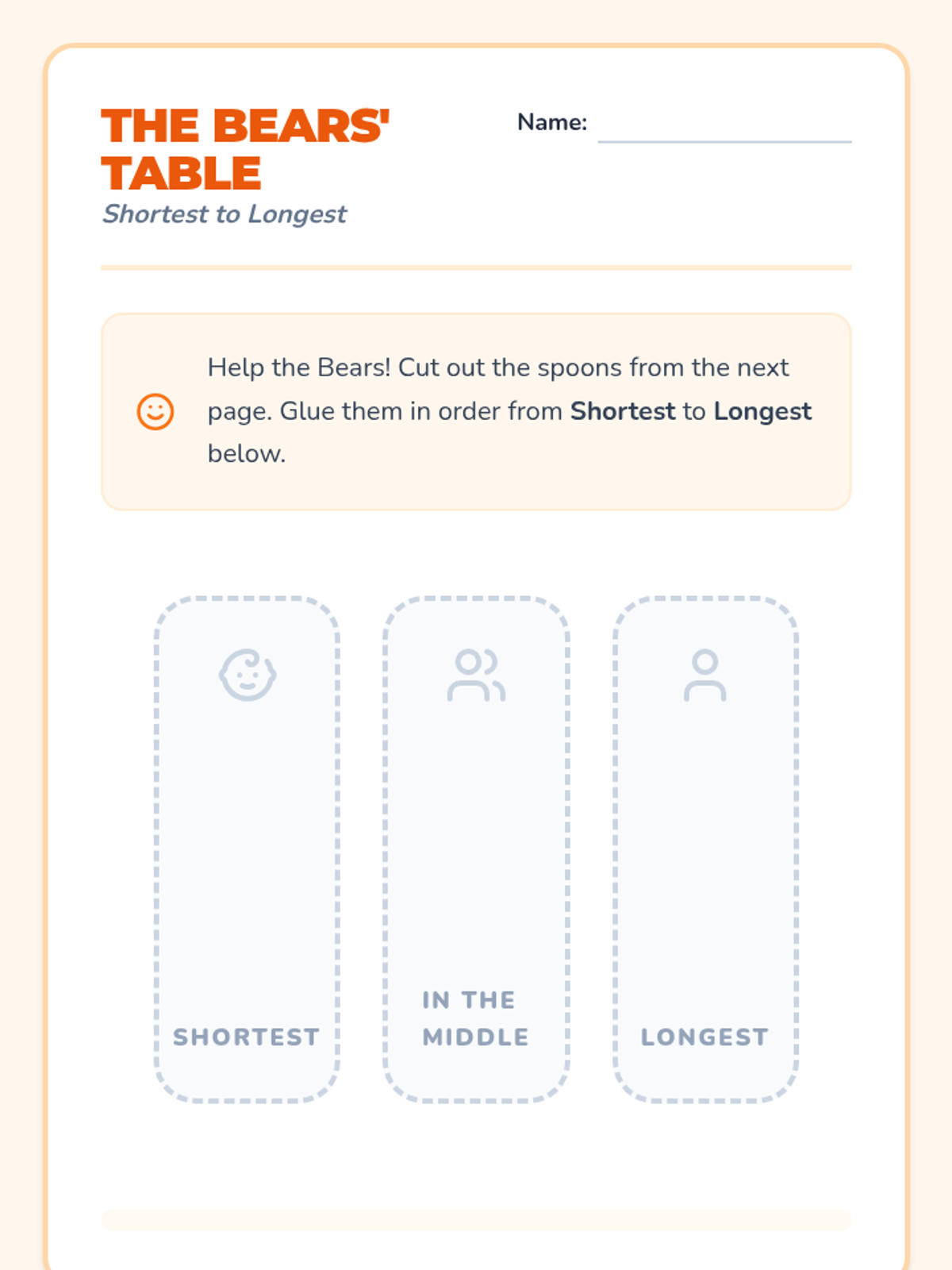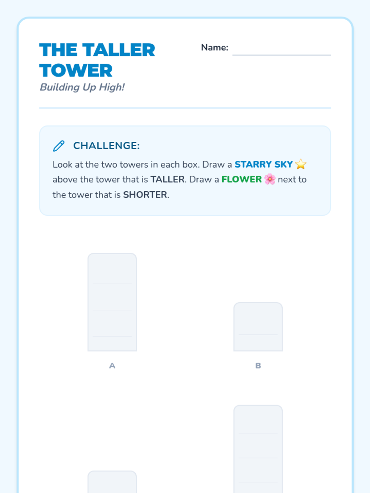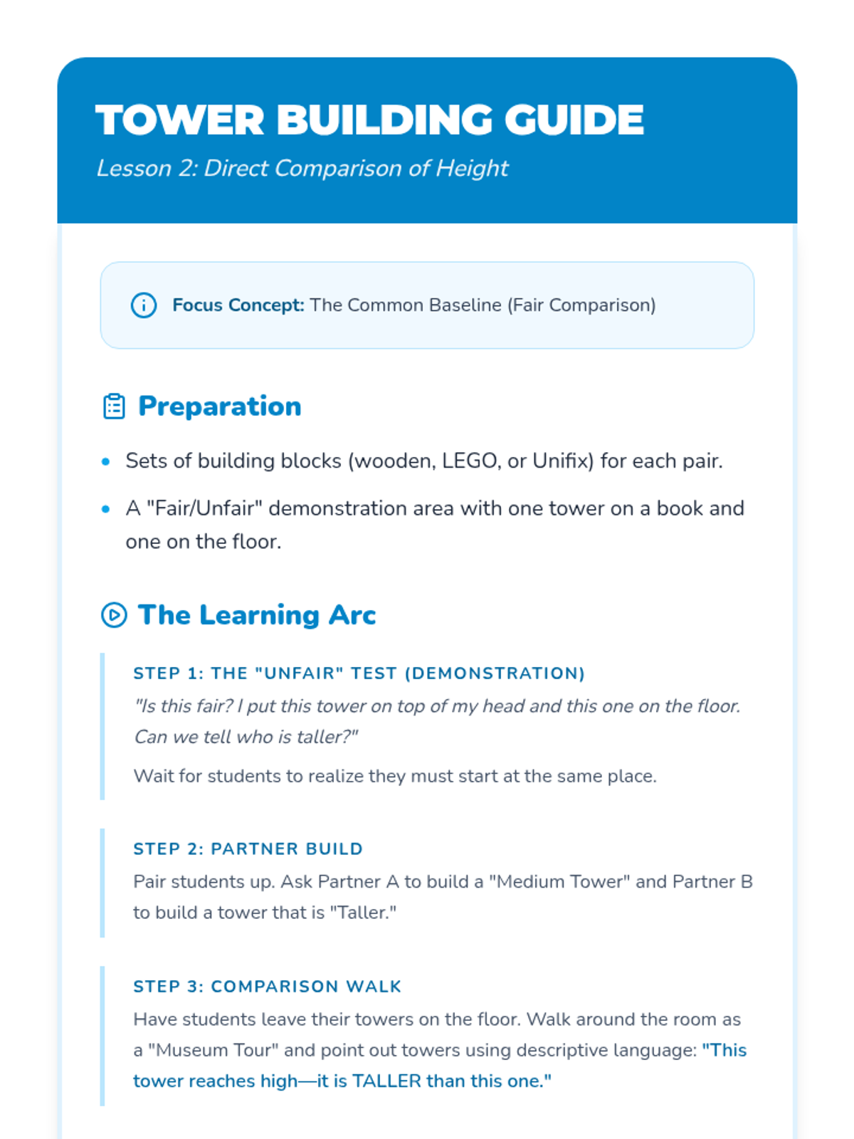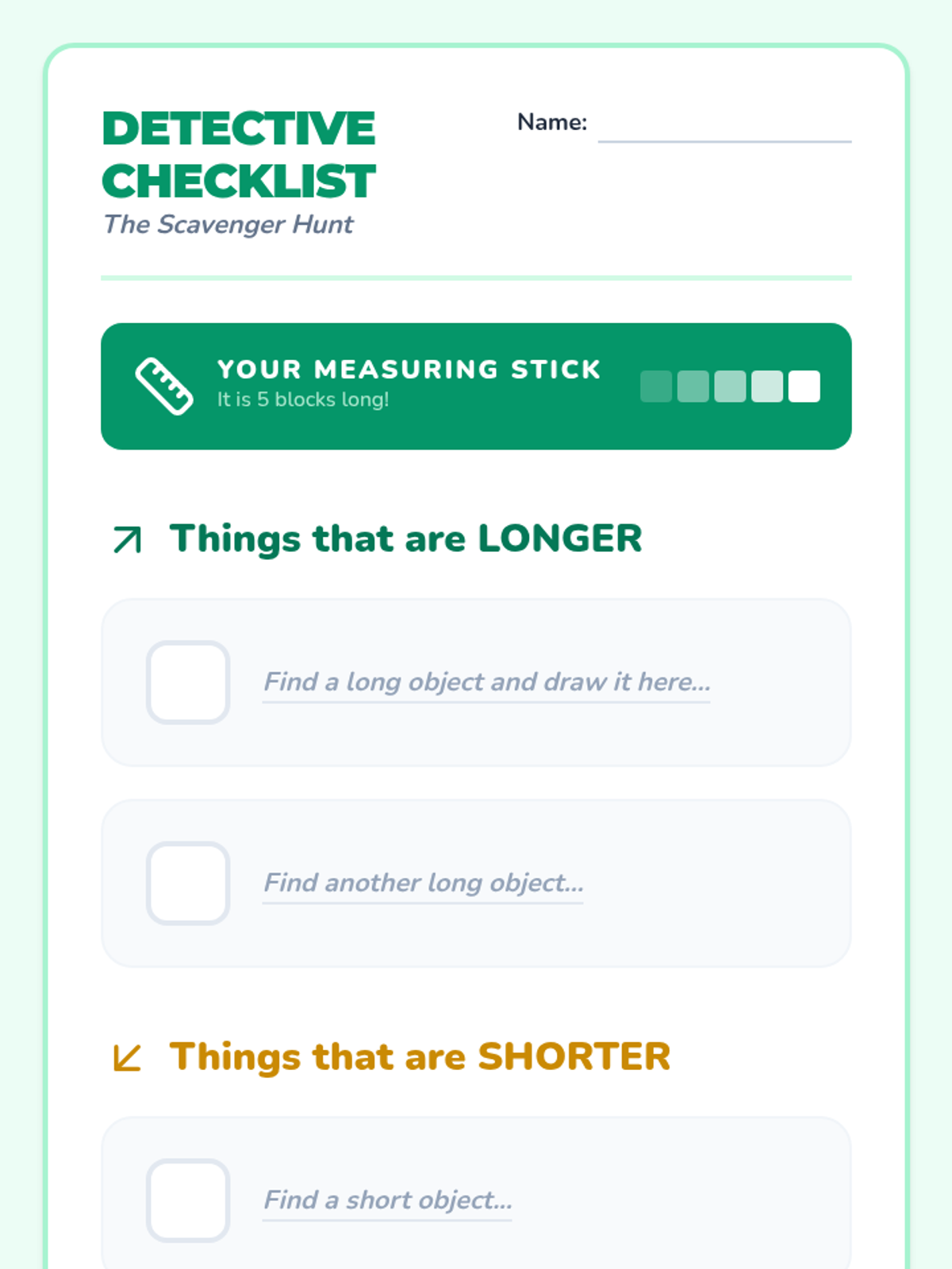 A foundational Pre-K sequence introducing length and height through tactile play, direct comparison of objects and peers, and ordering sets by size. Students develop essential vocabulary like 'long', 'short', 'tall', and 'taller' while learning the importance of a common baseline for fair measurement.