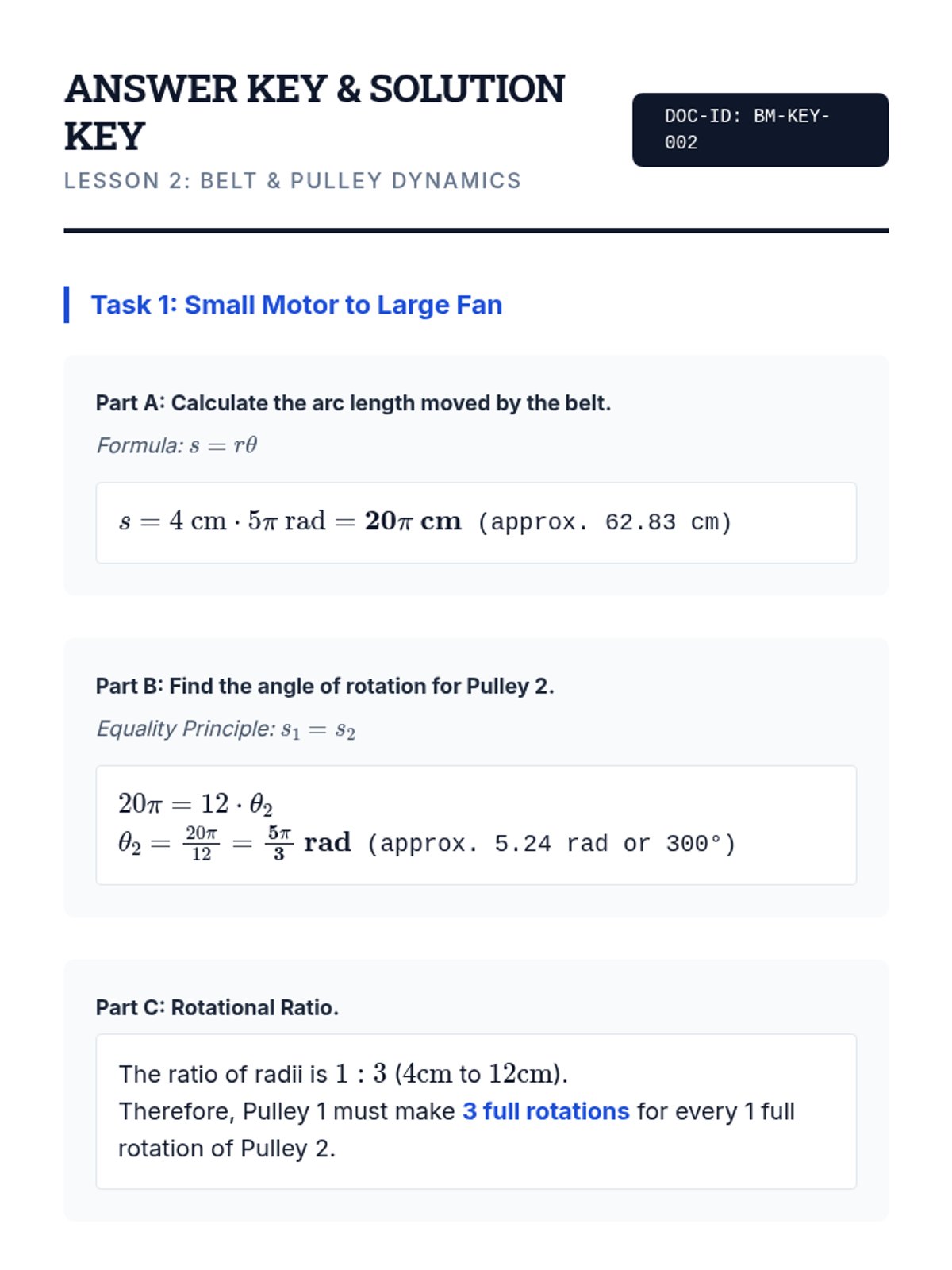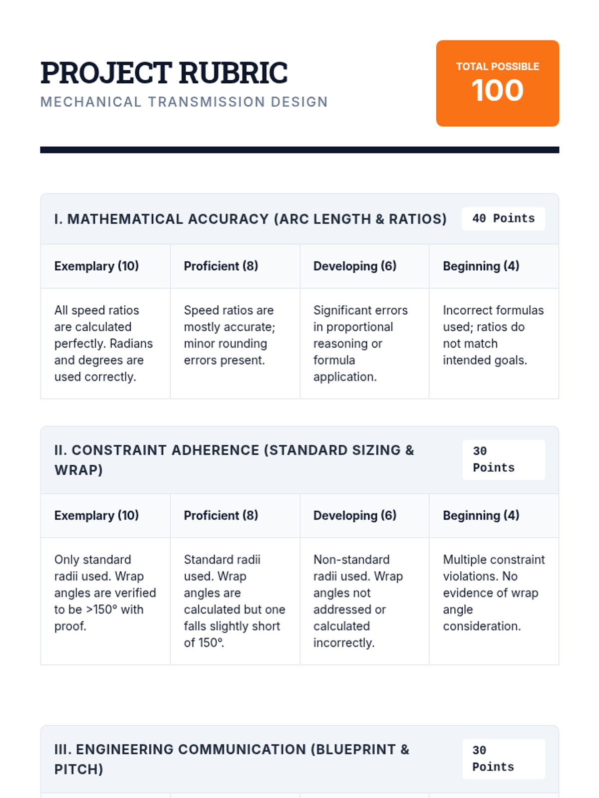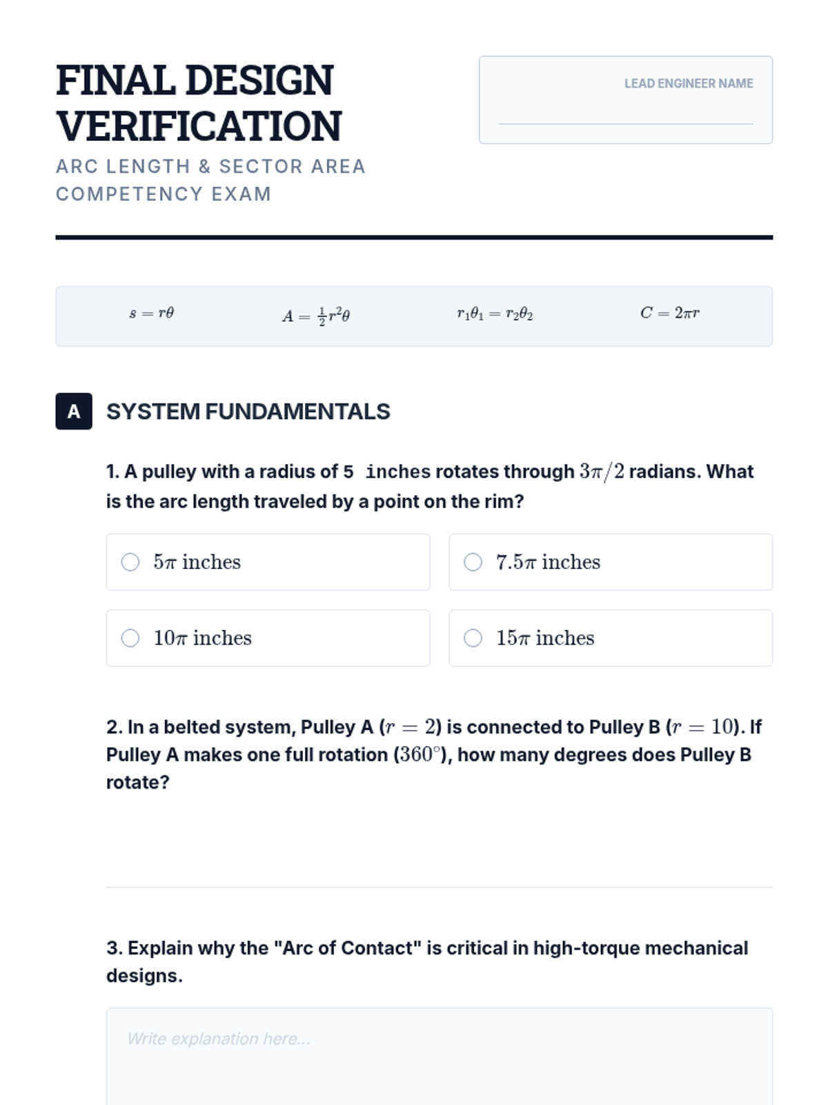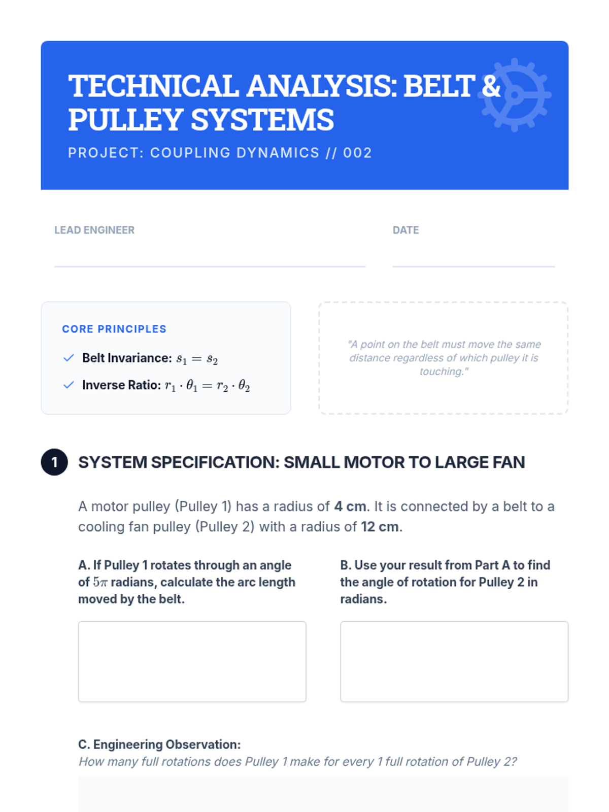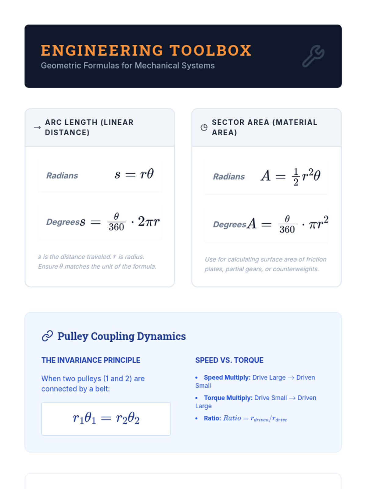 A project-based geometry sequence where 12th-grade students act as mechanical engineers. They apply arc length and sector area formulas to design efficient belt-and-pulley transmission systems, connecting static geometry to dynamic mechanical physics.