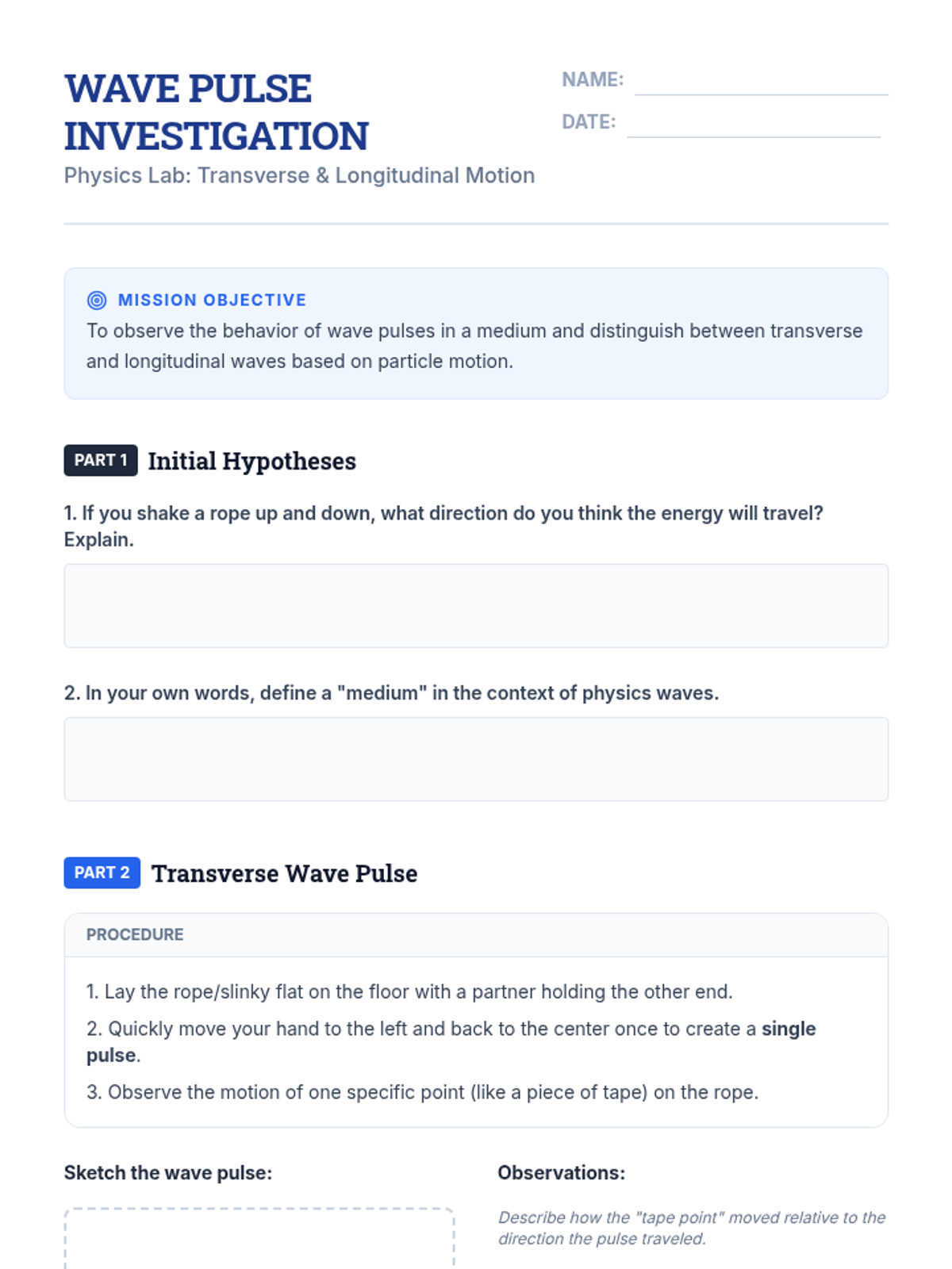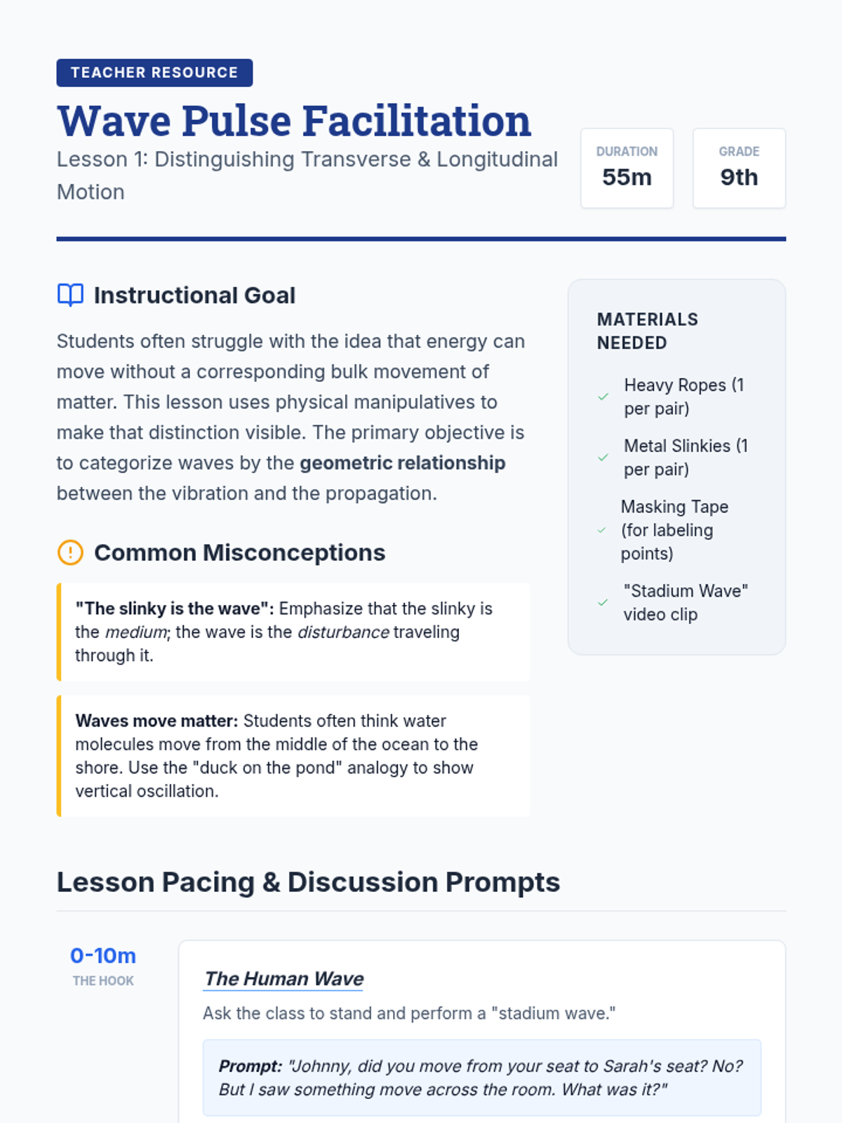 This introductory sequence establishes the fundamental principles of mechanical wave motion using physical manipulatives and simulations. Students explore the distinction between transverse and longitudinal waves, analyze graph representations of harmonic motion, and mathematically relate frequency, wavelength, and speed.