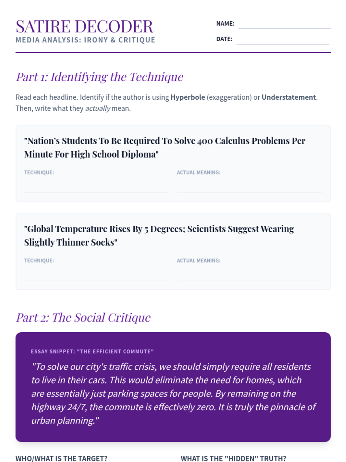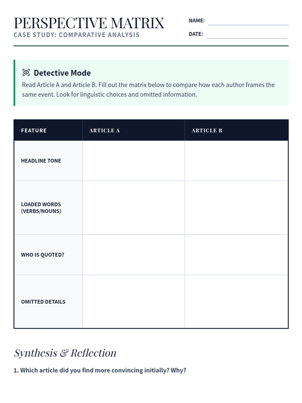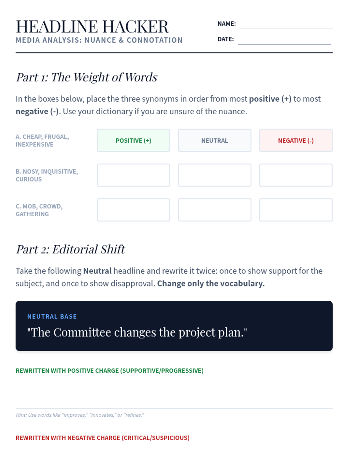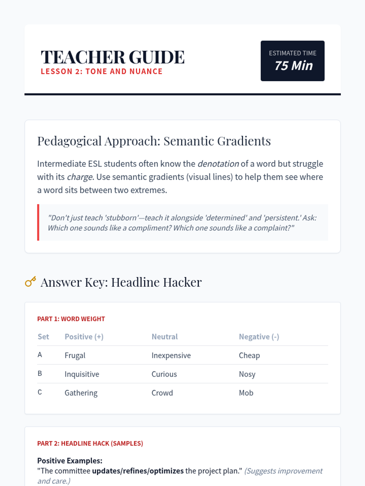 This sequence for intermediate ESL graduate students develops critical media literacy skills, focusing on the linguistic markers of fact, opinion, and speculation, the impact of connotative vocabulary, and the detection of bias and satire in complex texts.