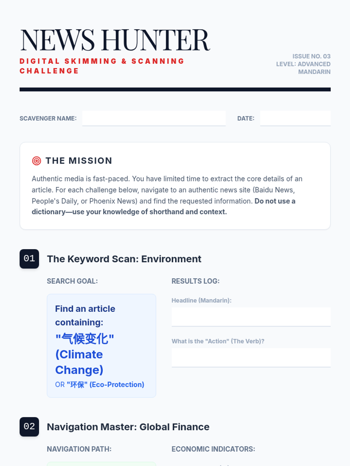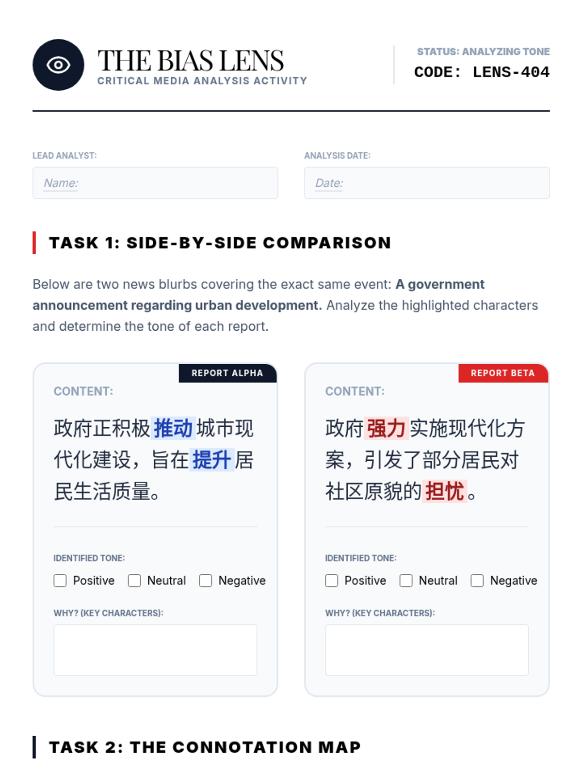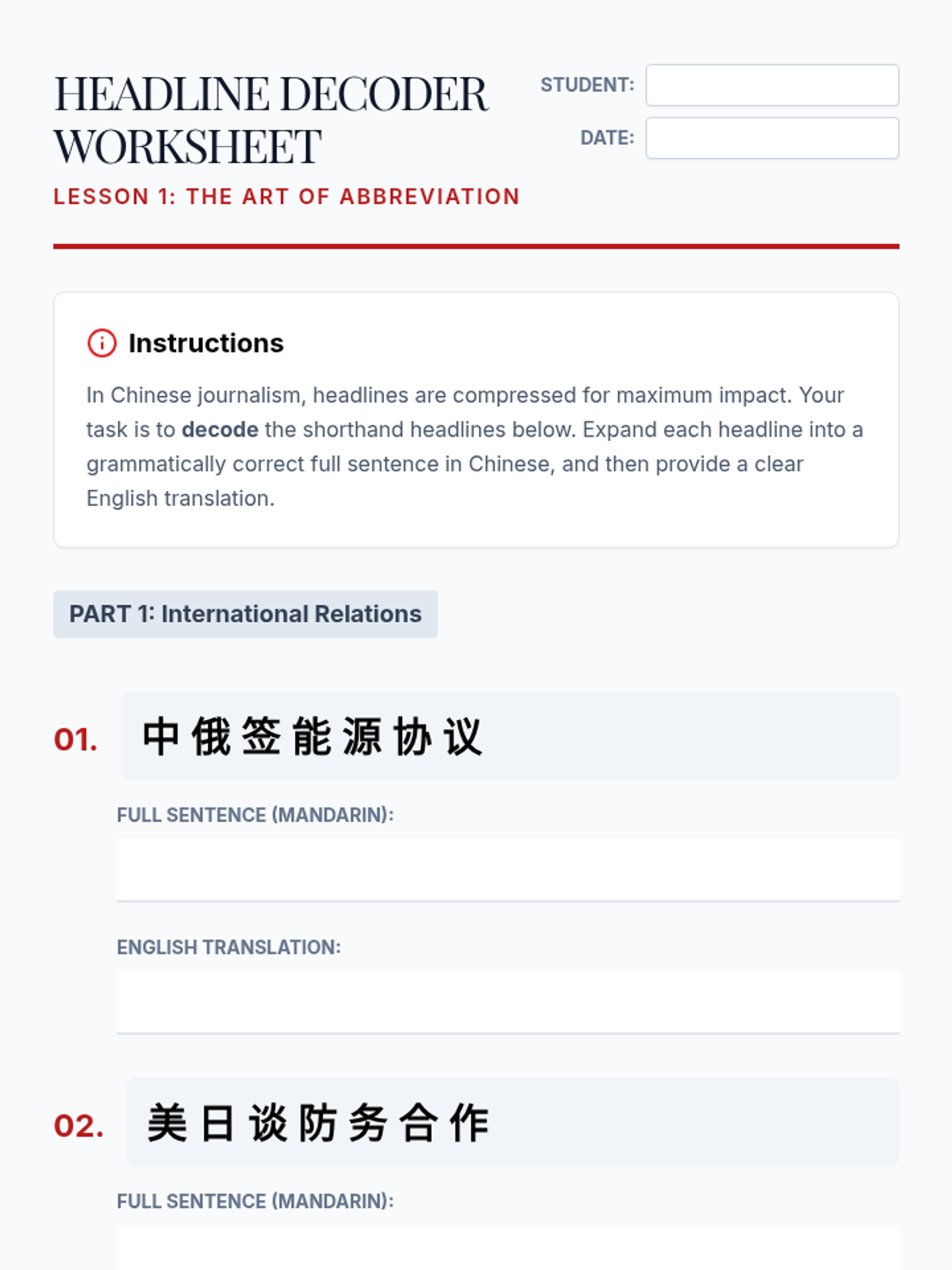 This advanced Mandarin Chinese sequence for 11th graders explores the specialized language of Chinese news media. Students master character abbreviations for countries and organizations, distinguish between formal and informal vocabulary in political and economic contexts, and analyze how word choice influences bias and tone in journalism.