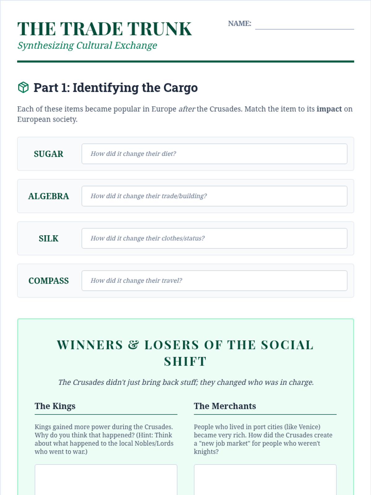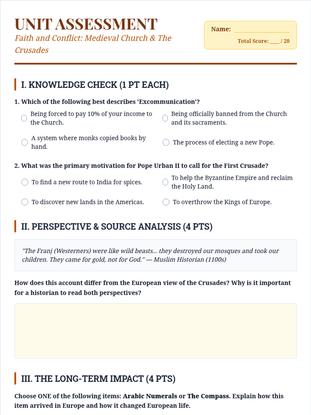 This sequence explores the central role of the Catholic Church in Medieval Europe and the resulting interregional conflicts of the Crusades. Students analyze the Church's political power, the motivations behind the Crusades, and the diverse perspectives of those involved, concluding with the lasting cultural exchanges between the East and West.