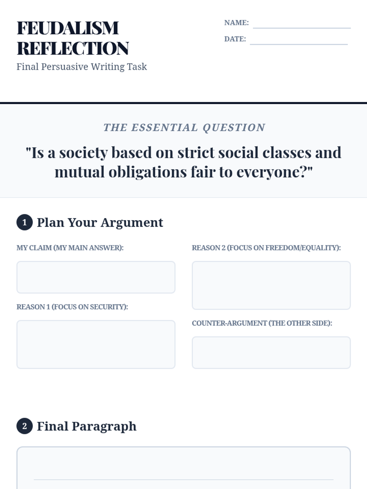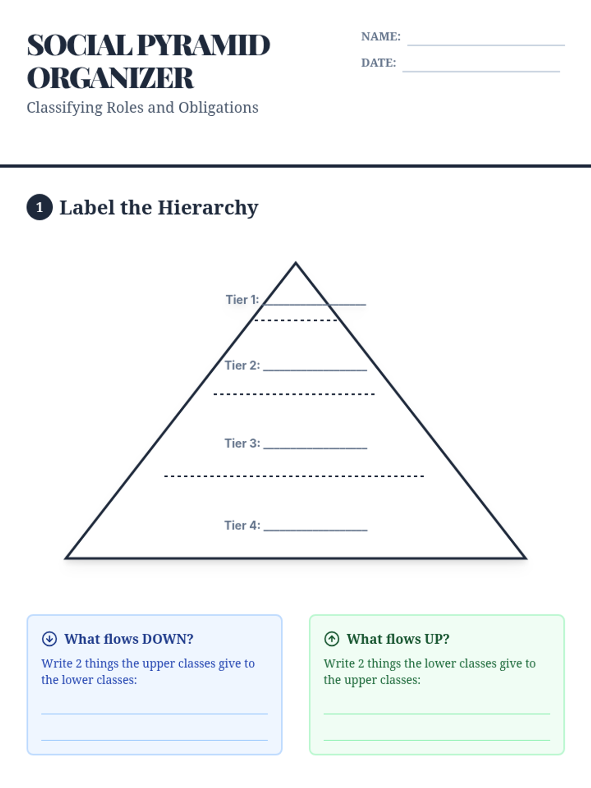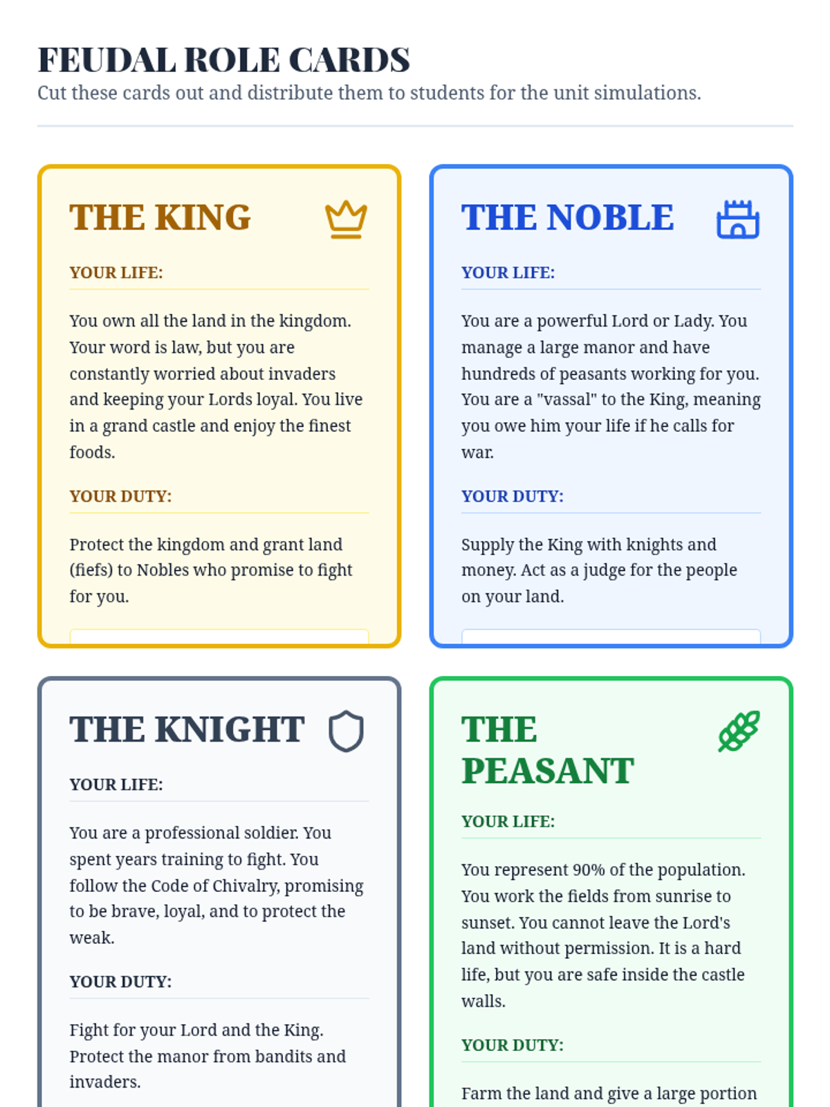 A 5th-grade unit exploring the hierarchical social structure of the Middle Ages, focusing on the mutual obligations of the feudal pyramid after the fall of the Roman Empire. Students engage with simulations, role-play, and architectural analysis to understand life under the feudal contract.